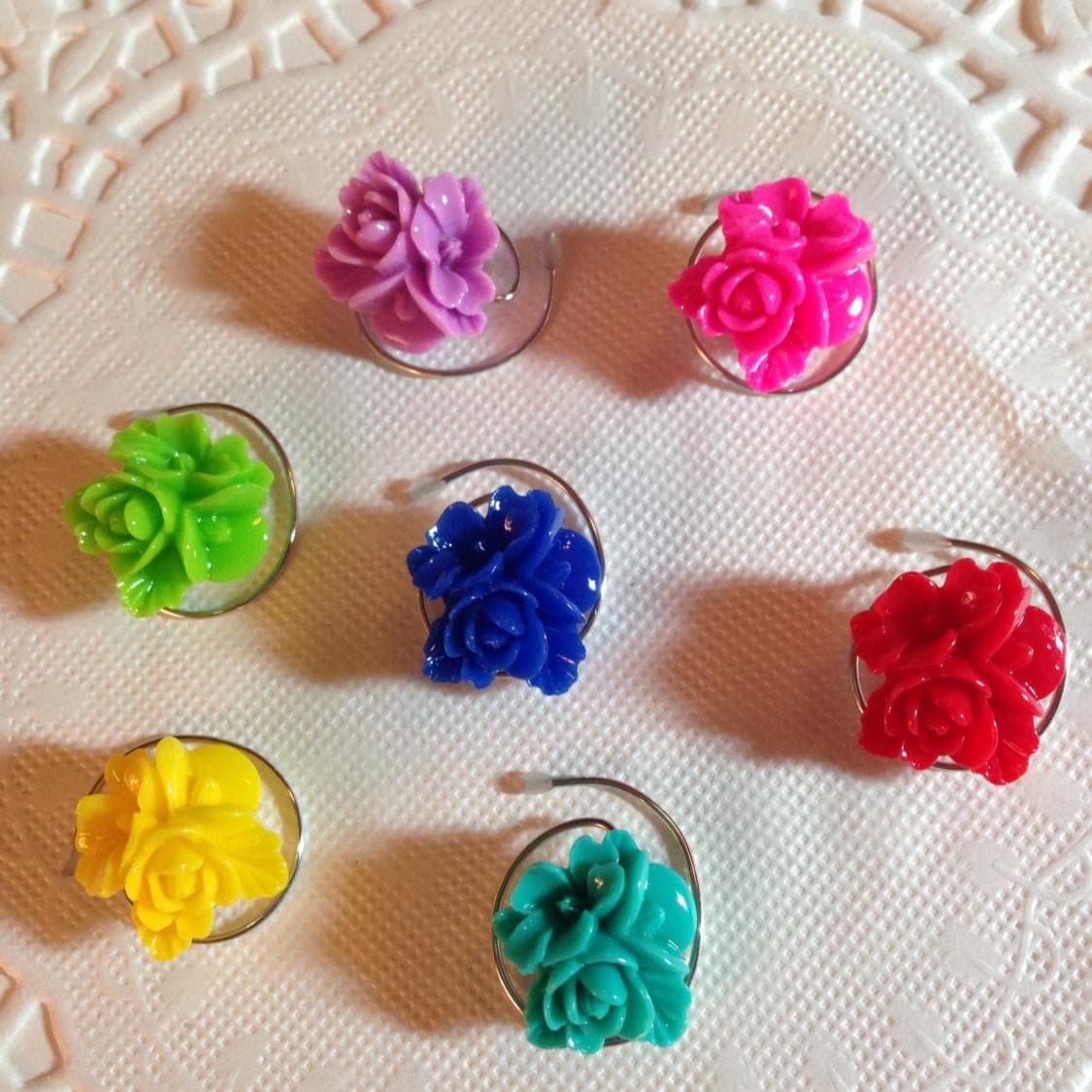 Adorable hair coils in shiny resin triple flowers. These large 16mm flower hair swirls will dance in your hair.