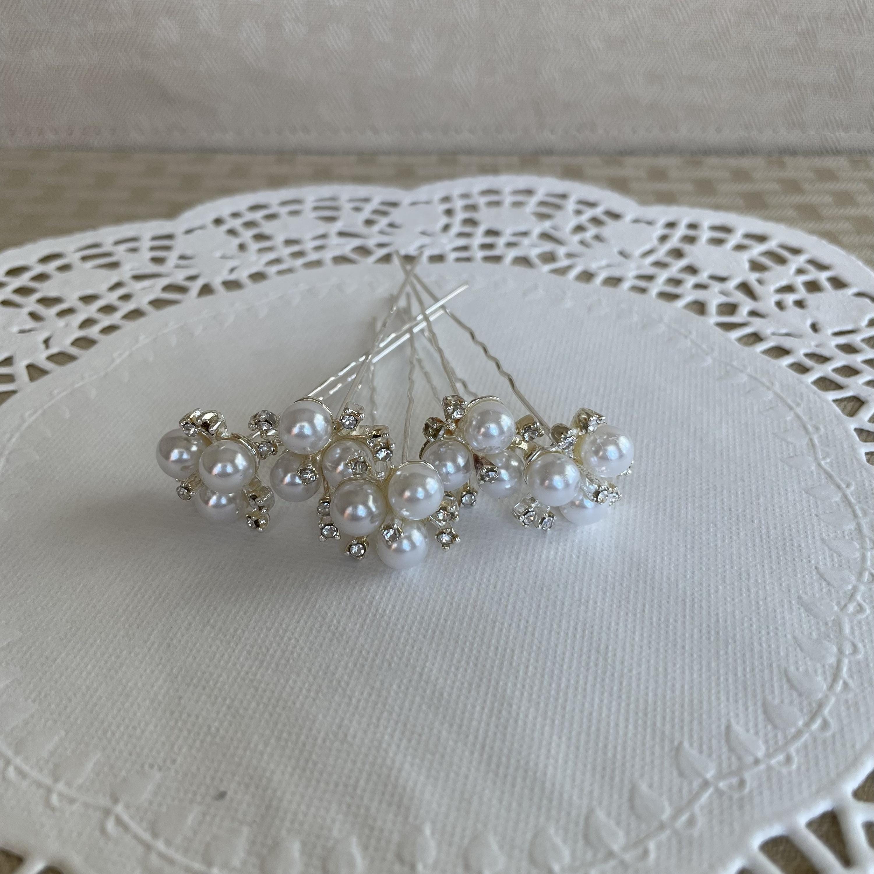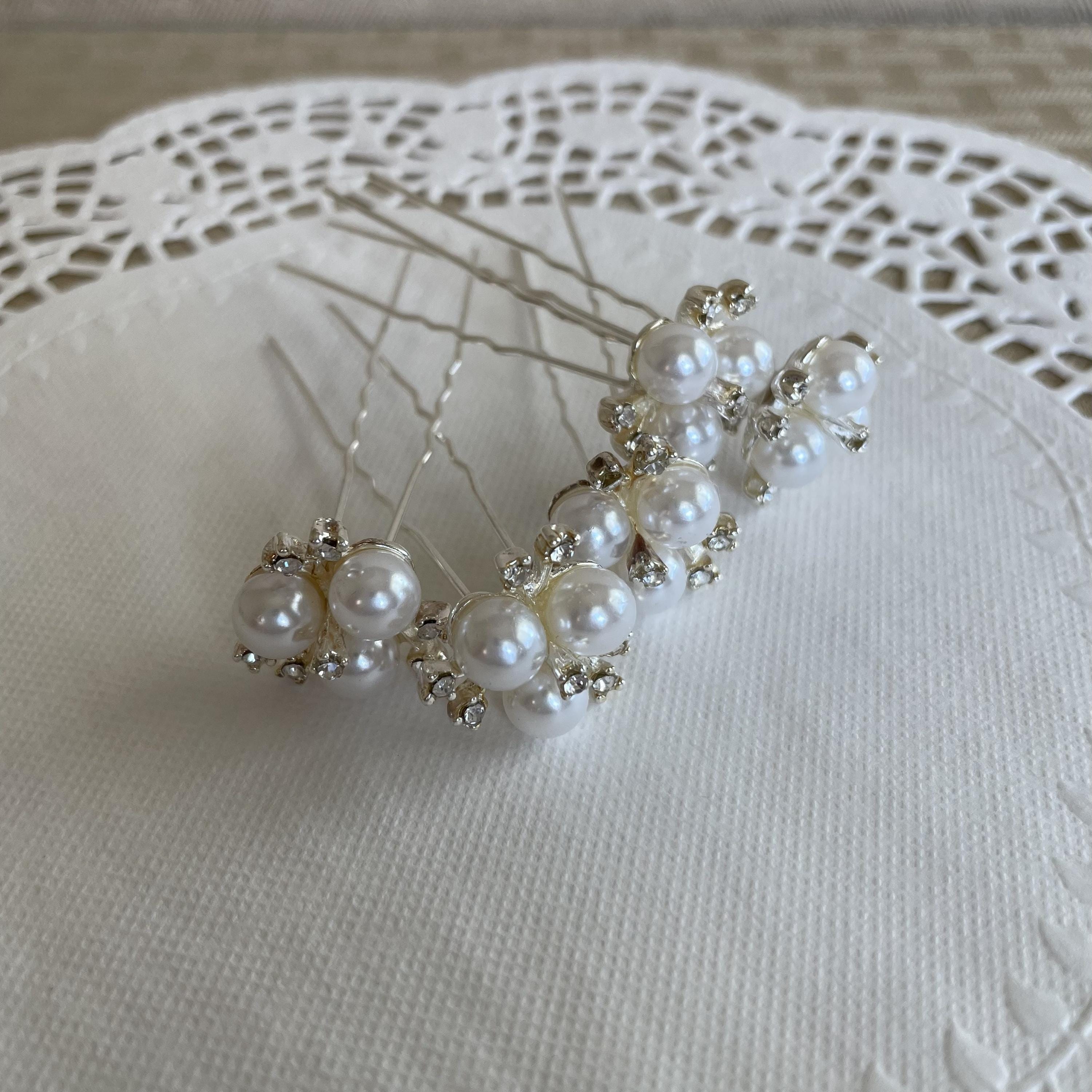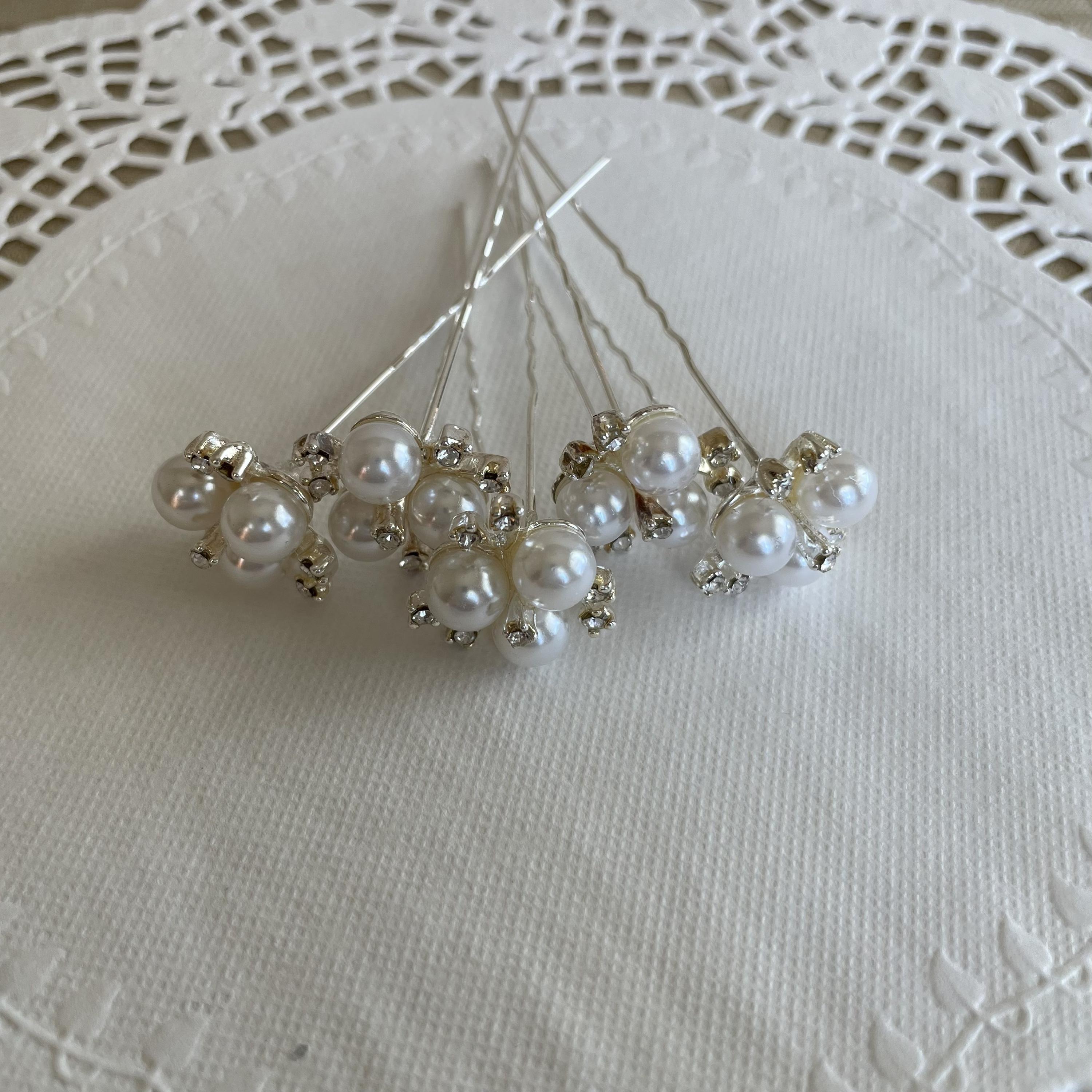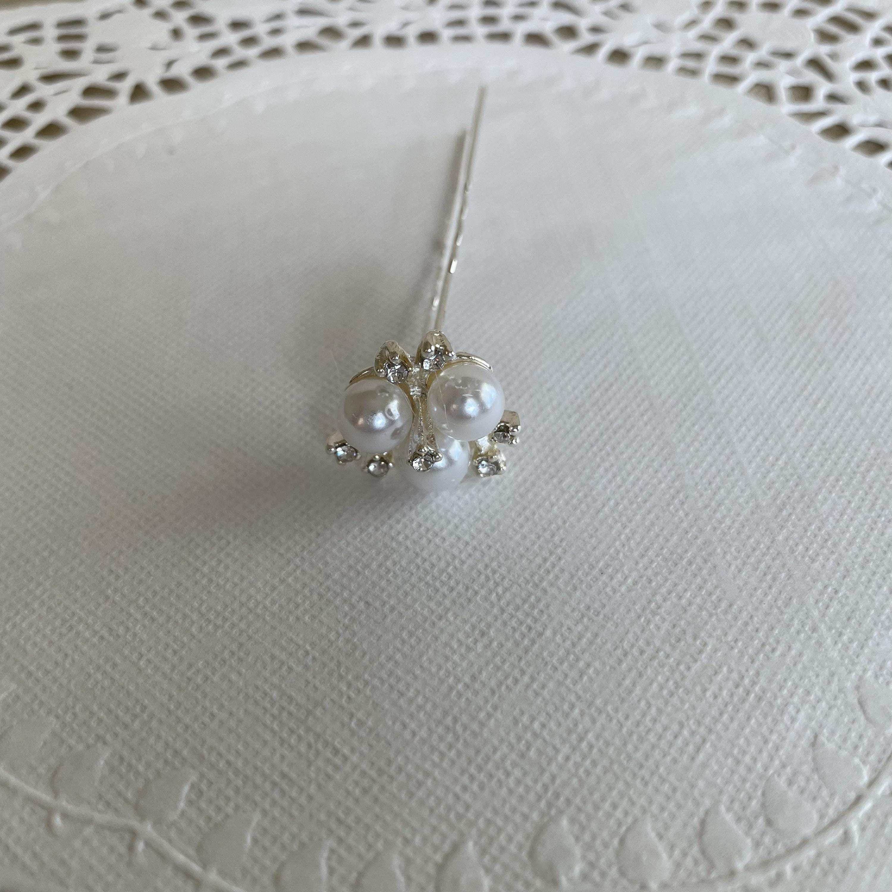 Set of six hair pins. A beautiful triad of pearls surrounded by sparkling clear rhinestones and mounted on a silver tone hair pin.