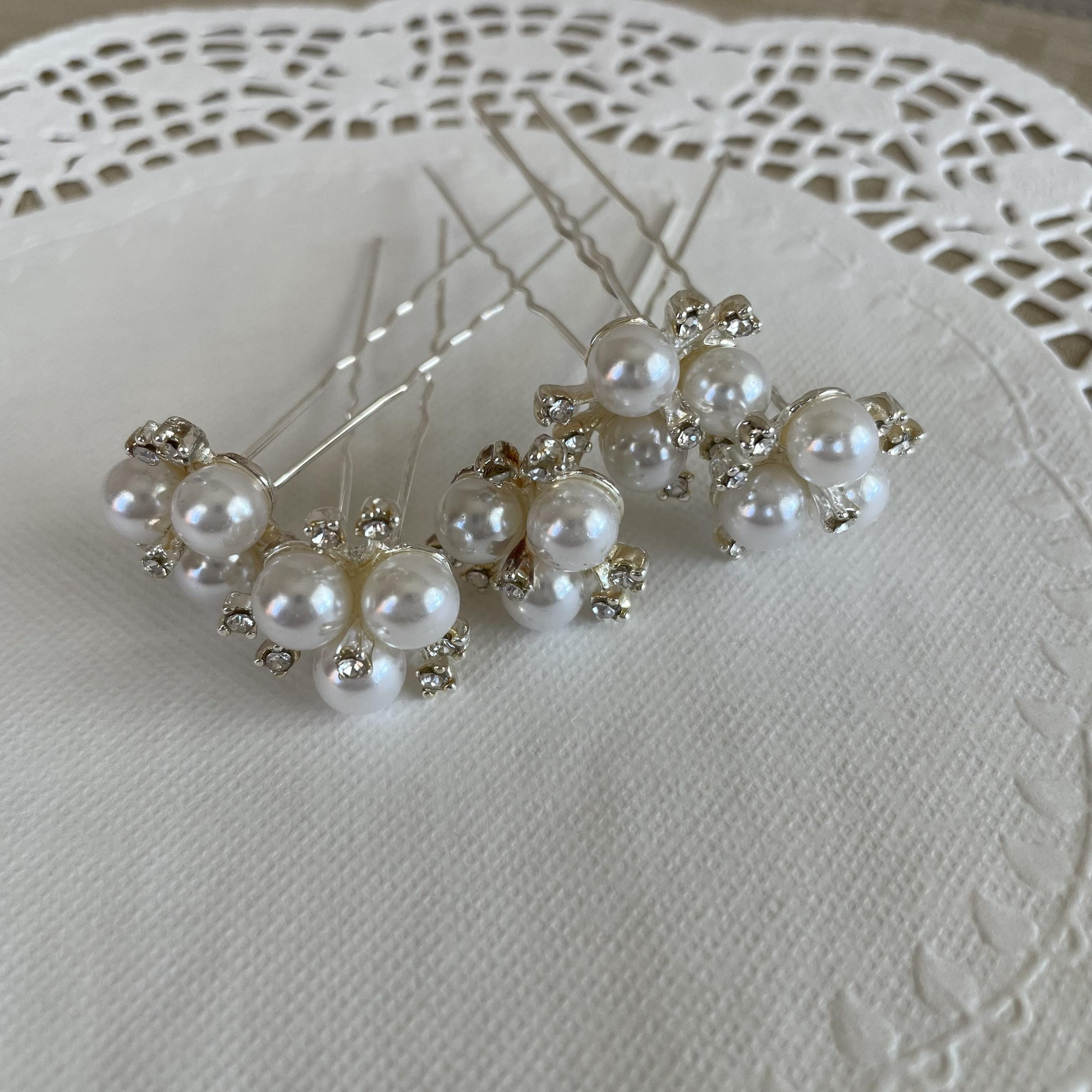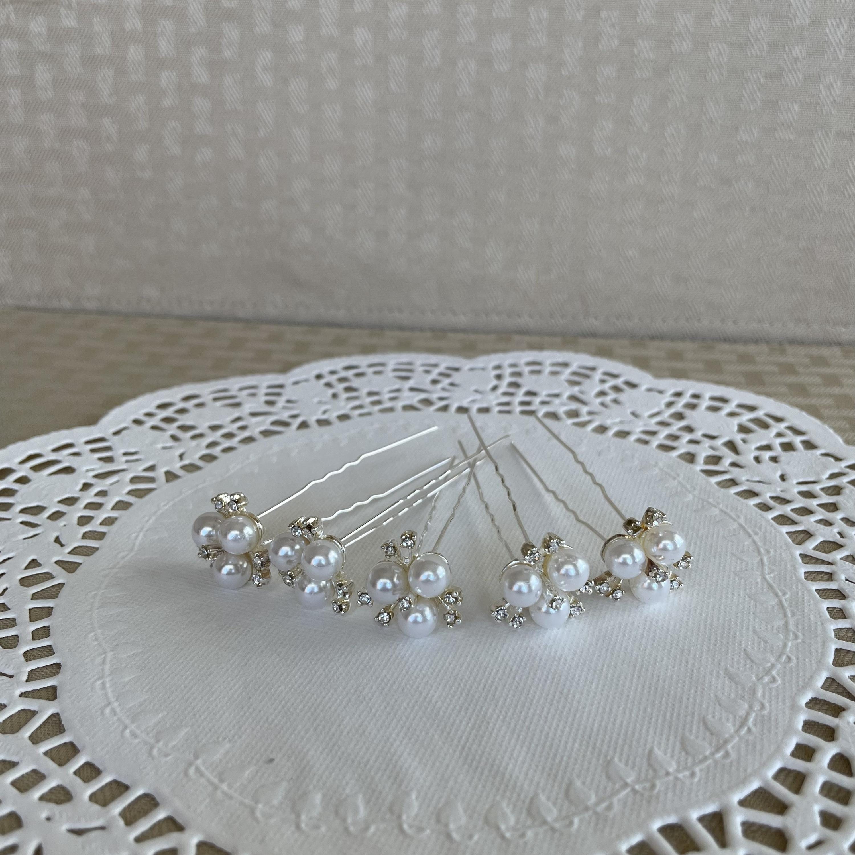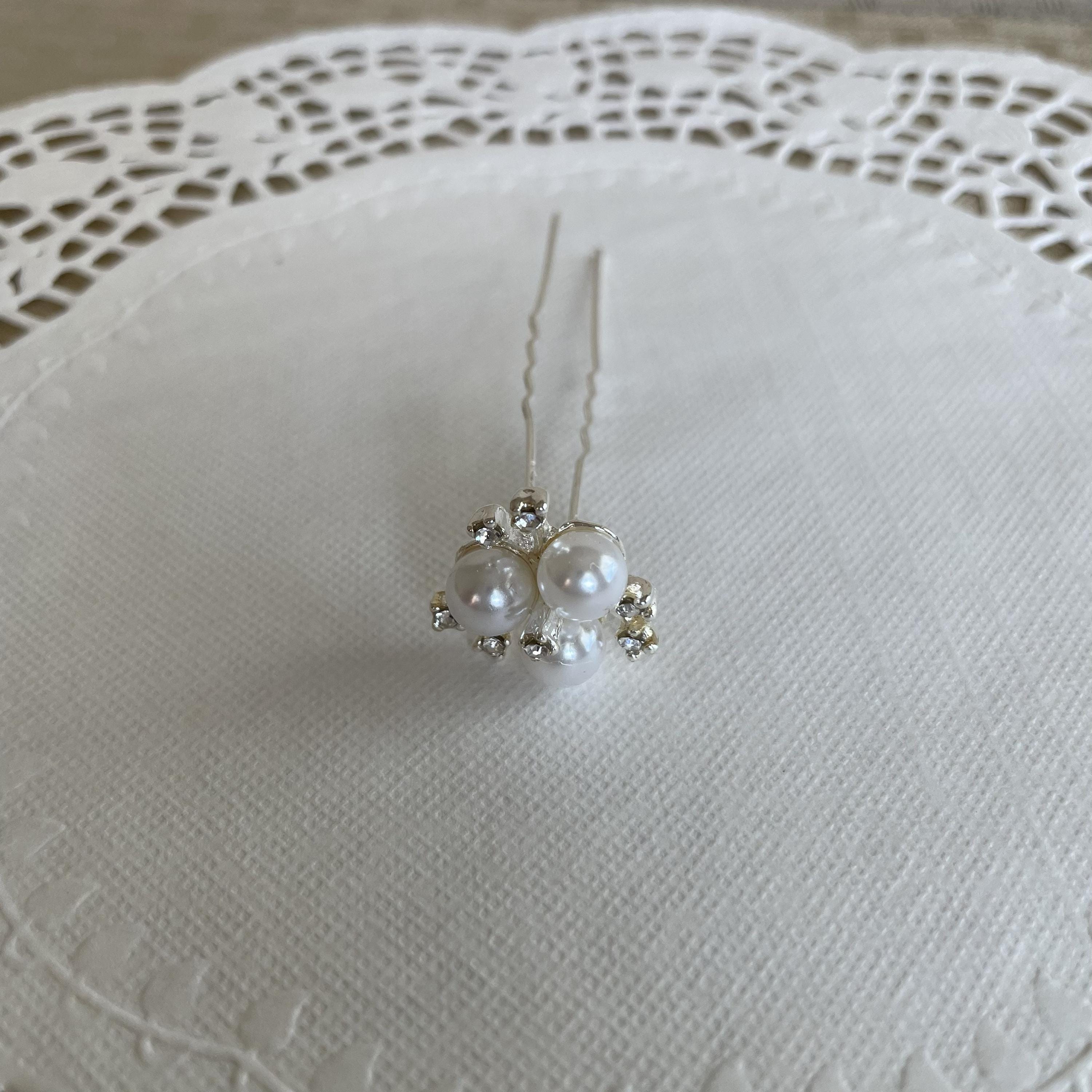Set of six hair pins. A beautiful triad of pearls surrounded by sparkling clear rhinestones and mounted on a silver tone hair pin.