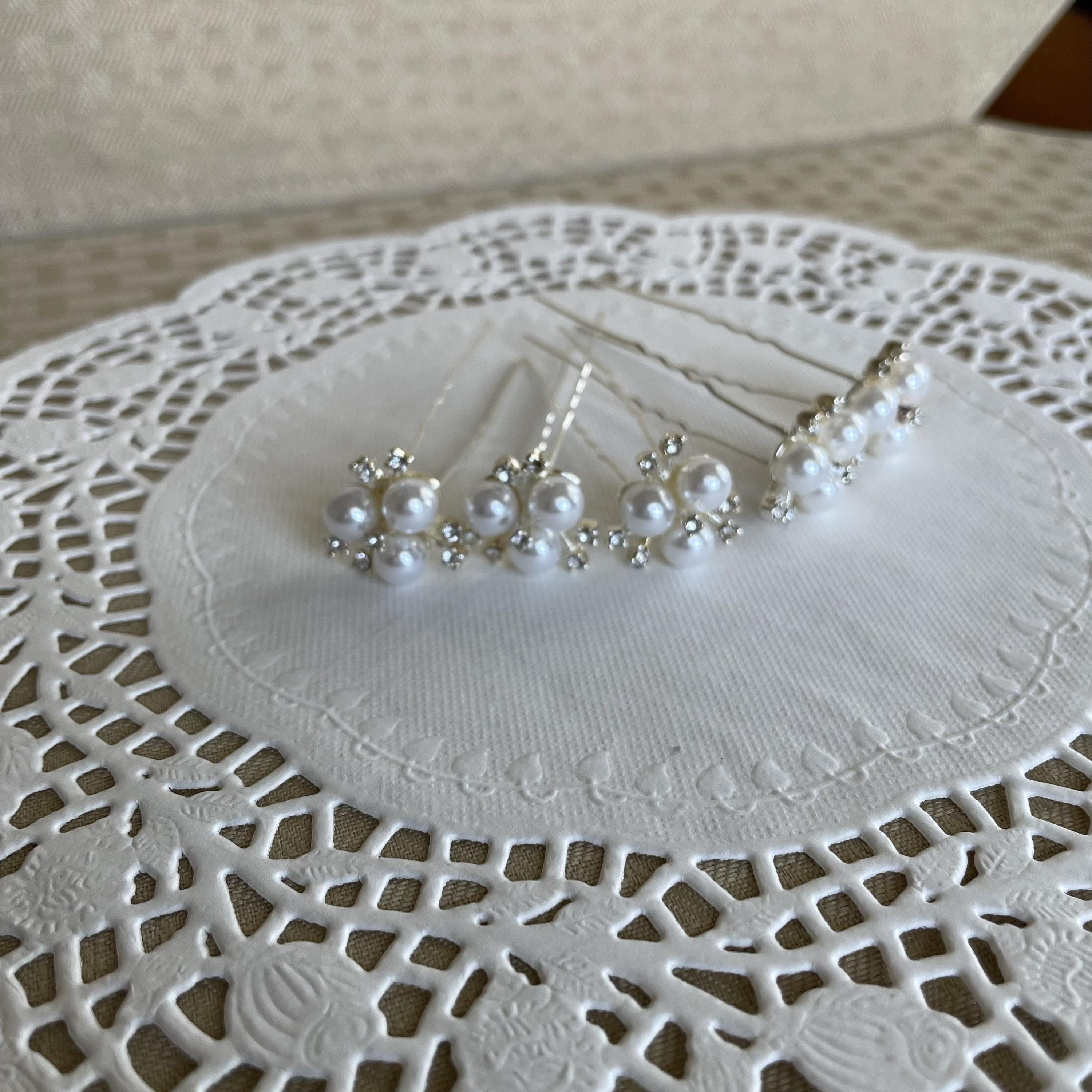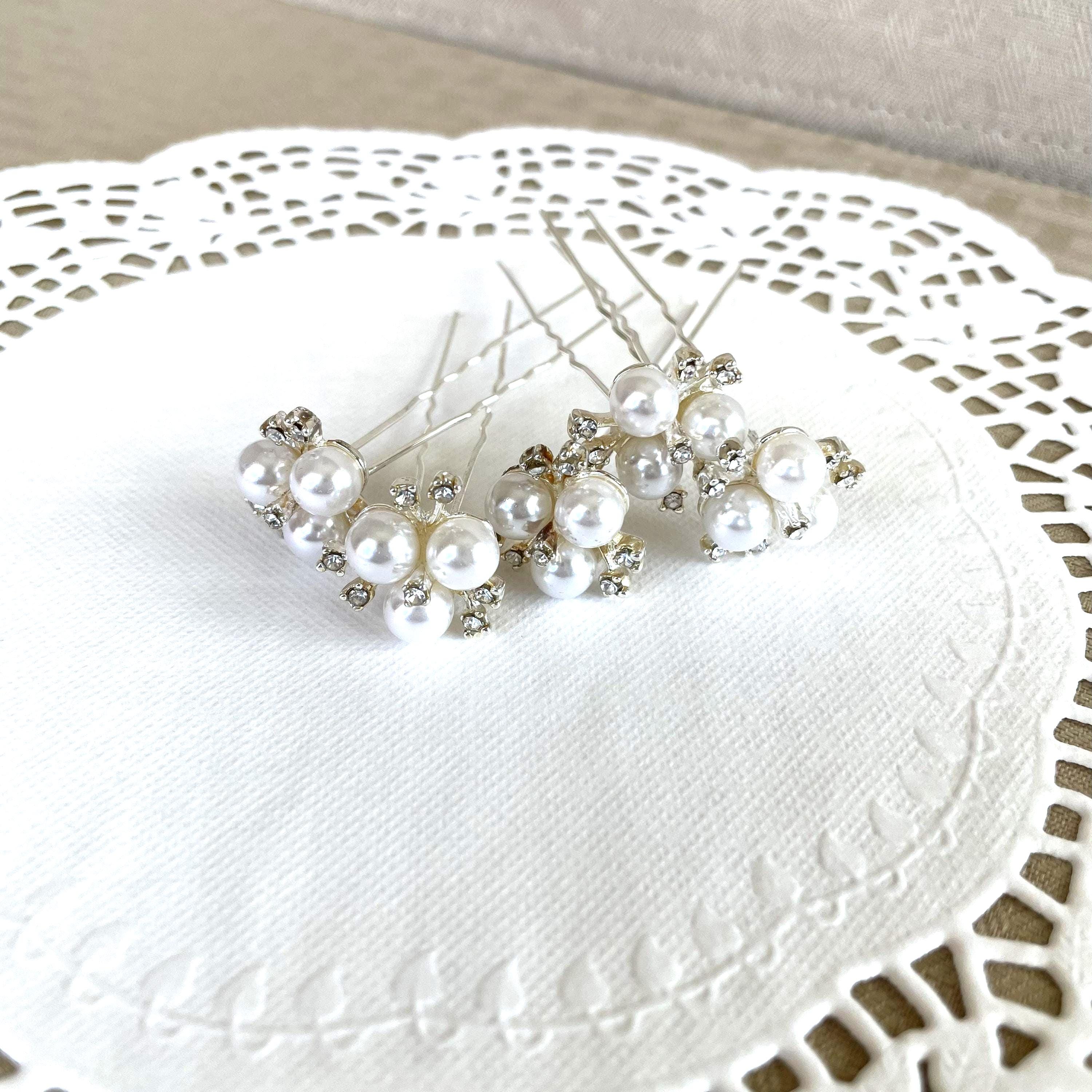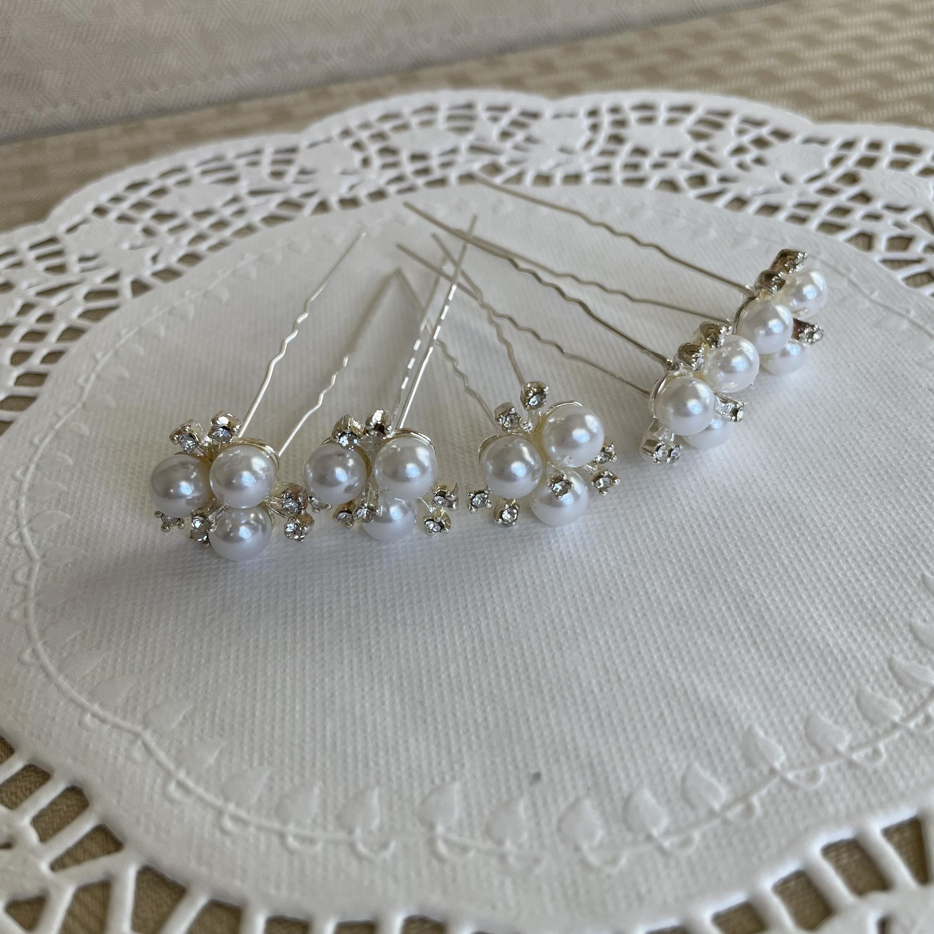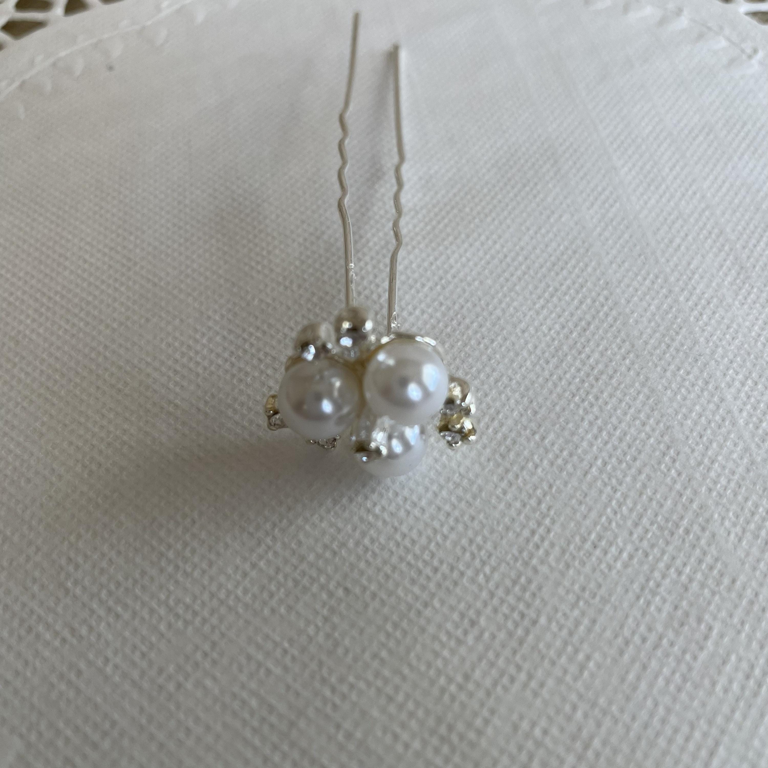 Set of six hair pins. A beautiful triad of pearls surrounded by sparkling clear rhinestones and mounted on a silver tone hair pin.