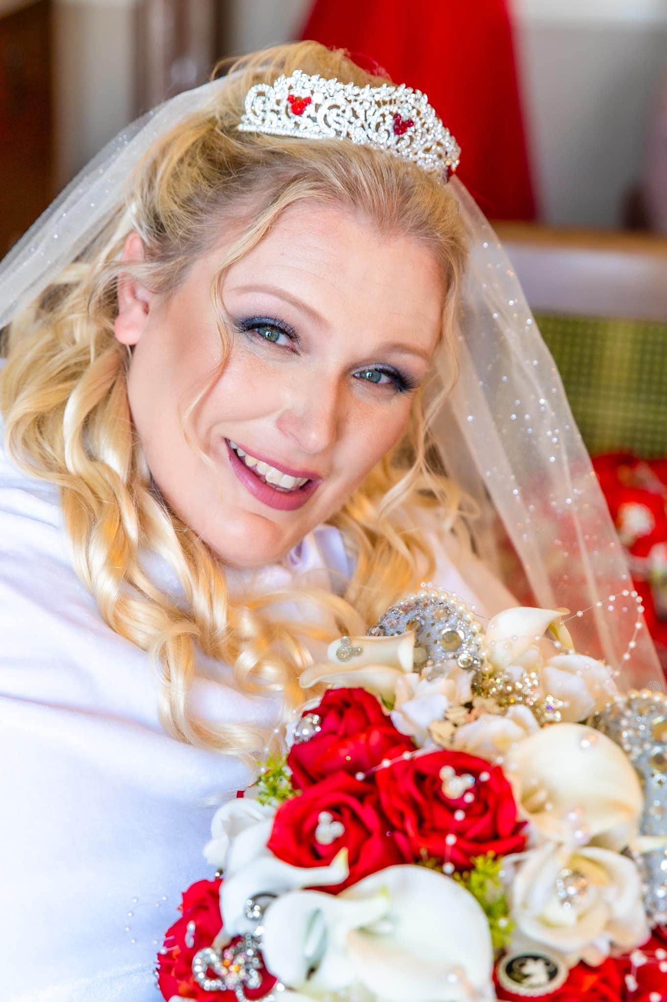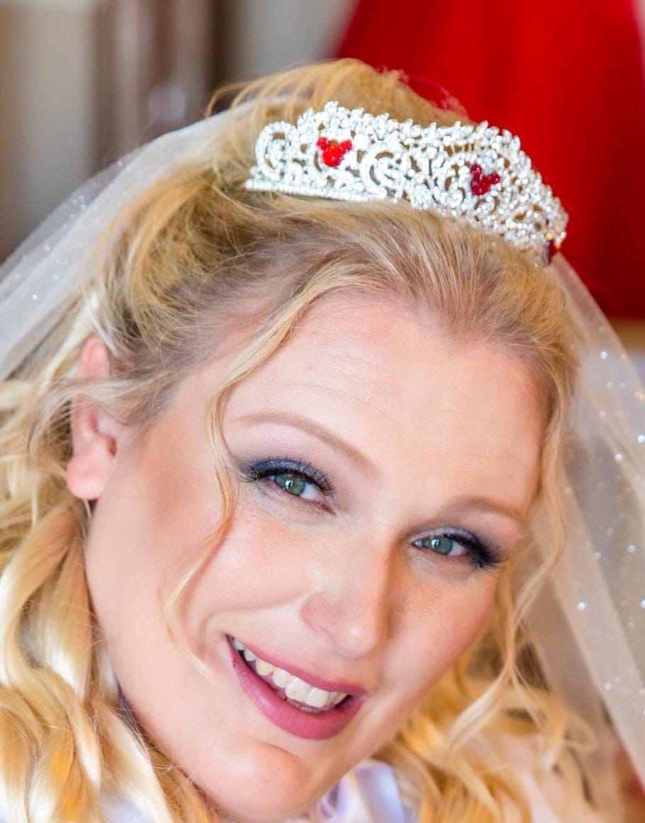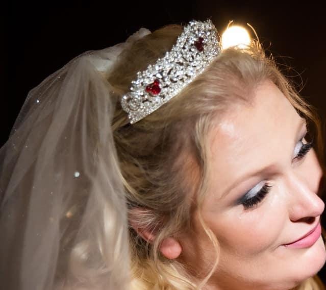 The best part of this tiara is the 3 red hidden Mickeys place across the front of the tiara. It makes this tiara a magical addition to your Disney Inspired Wedding.