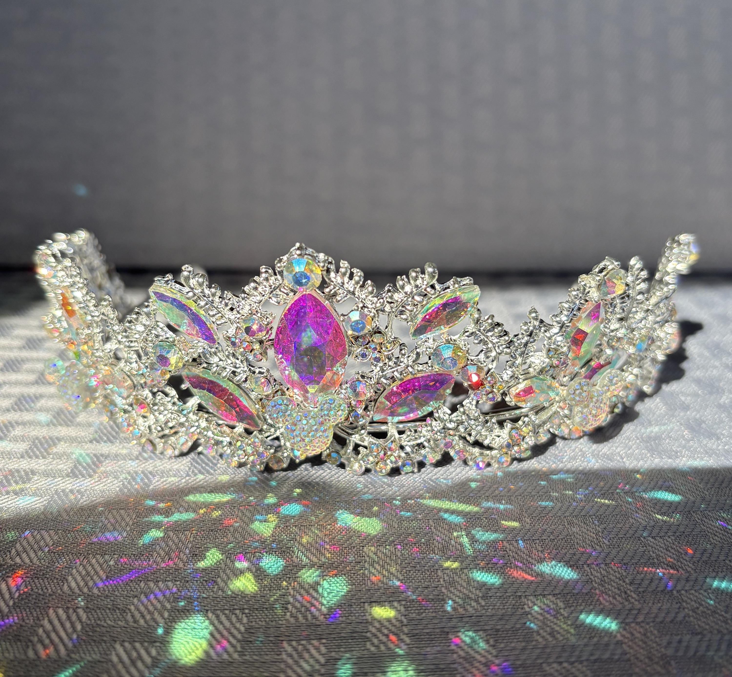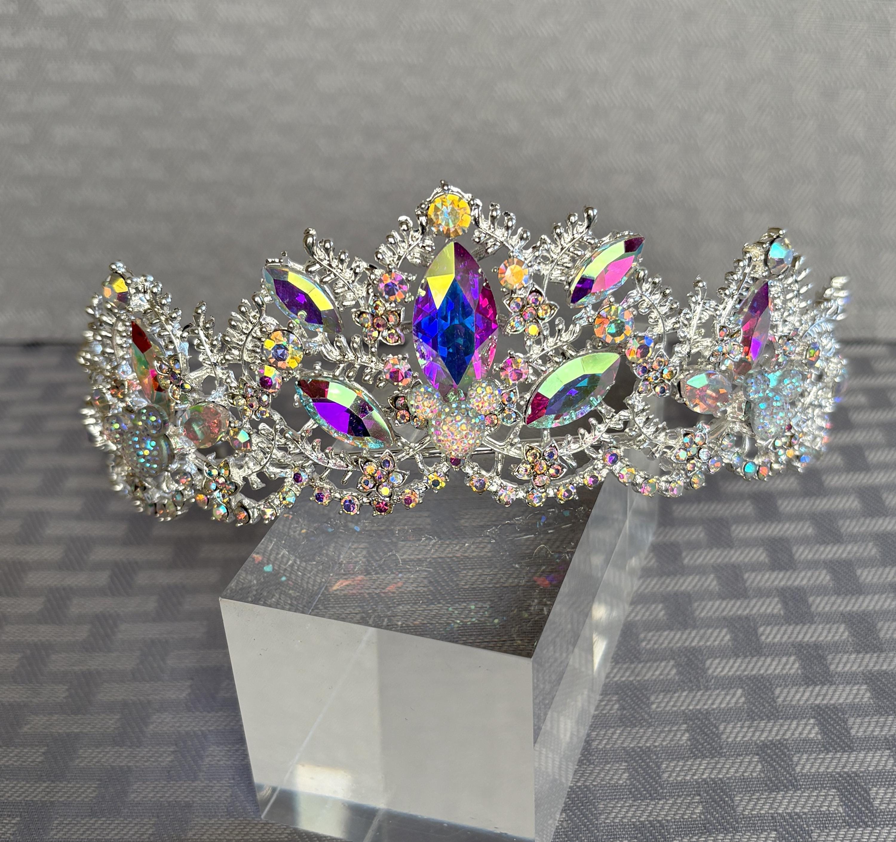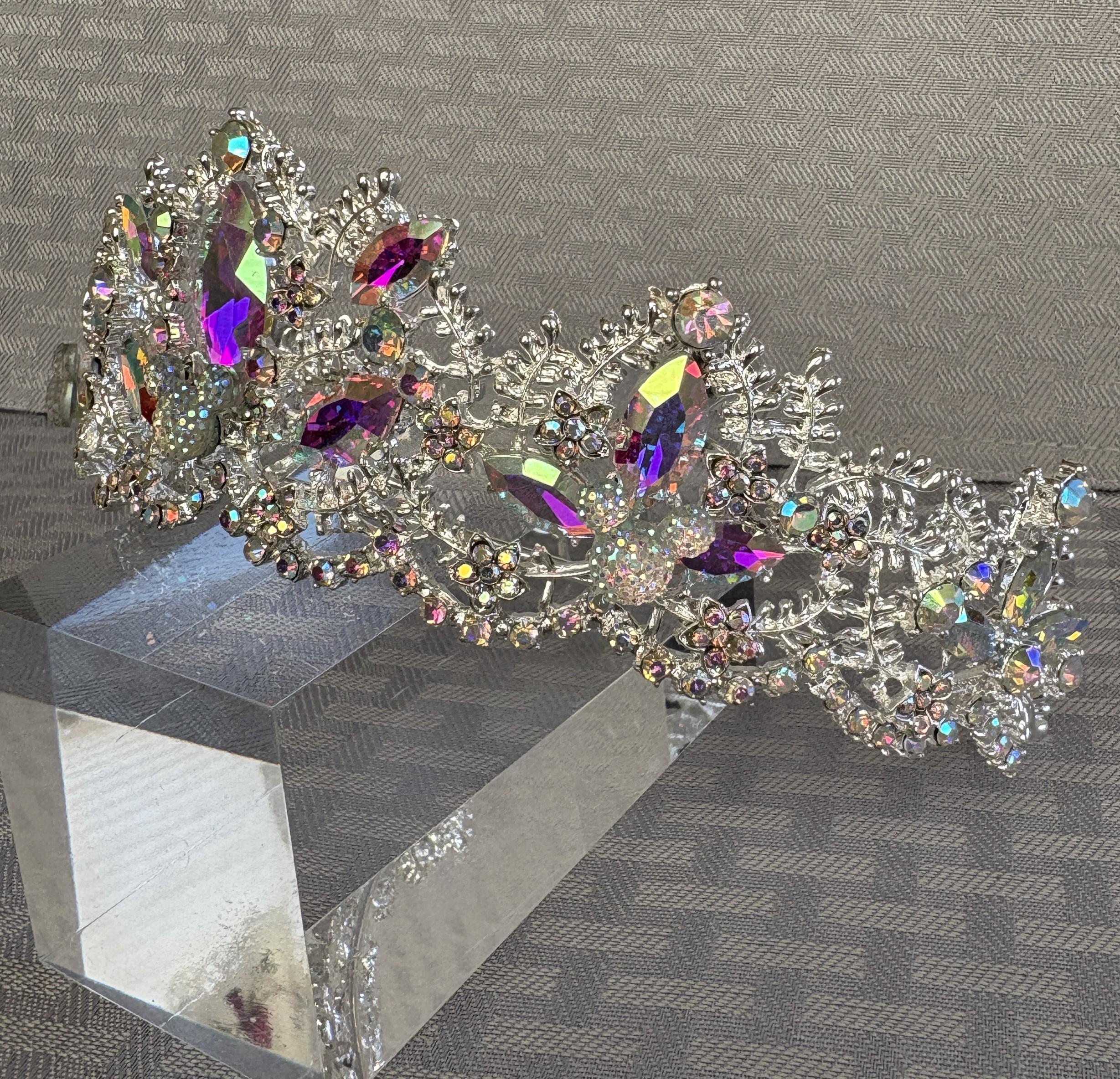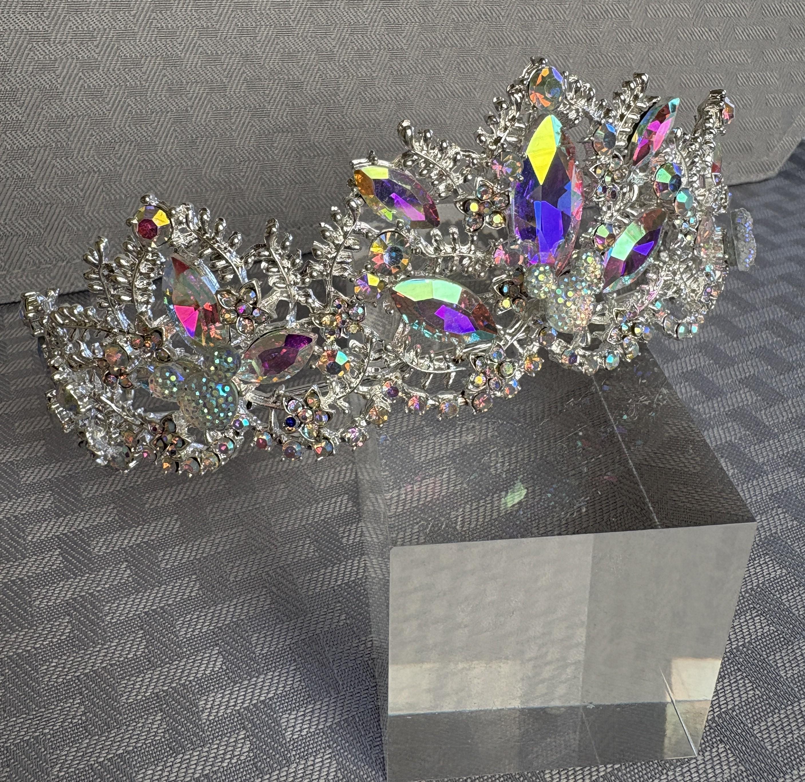 Gorgeous crystal clear rhinestone jewels make up this silver tone tiara along with beautiful aurora borealis rhinestones placed through the center of the crown. The aurora Borealis stones pick up colors when light hits them. so at times they may look blue or pink or purple. They are dazzling!