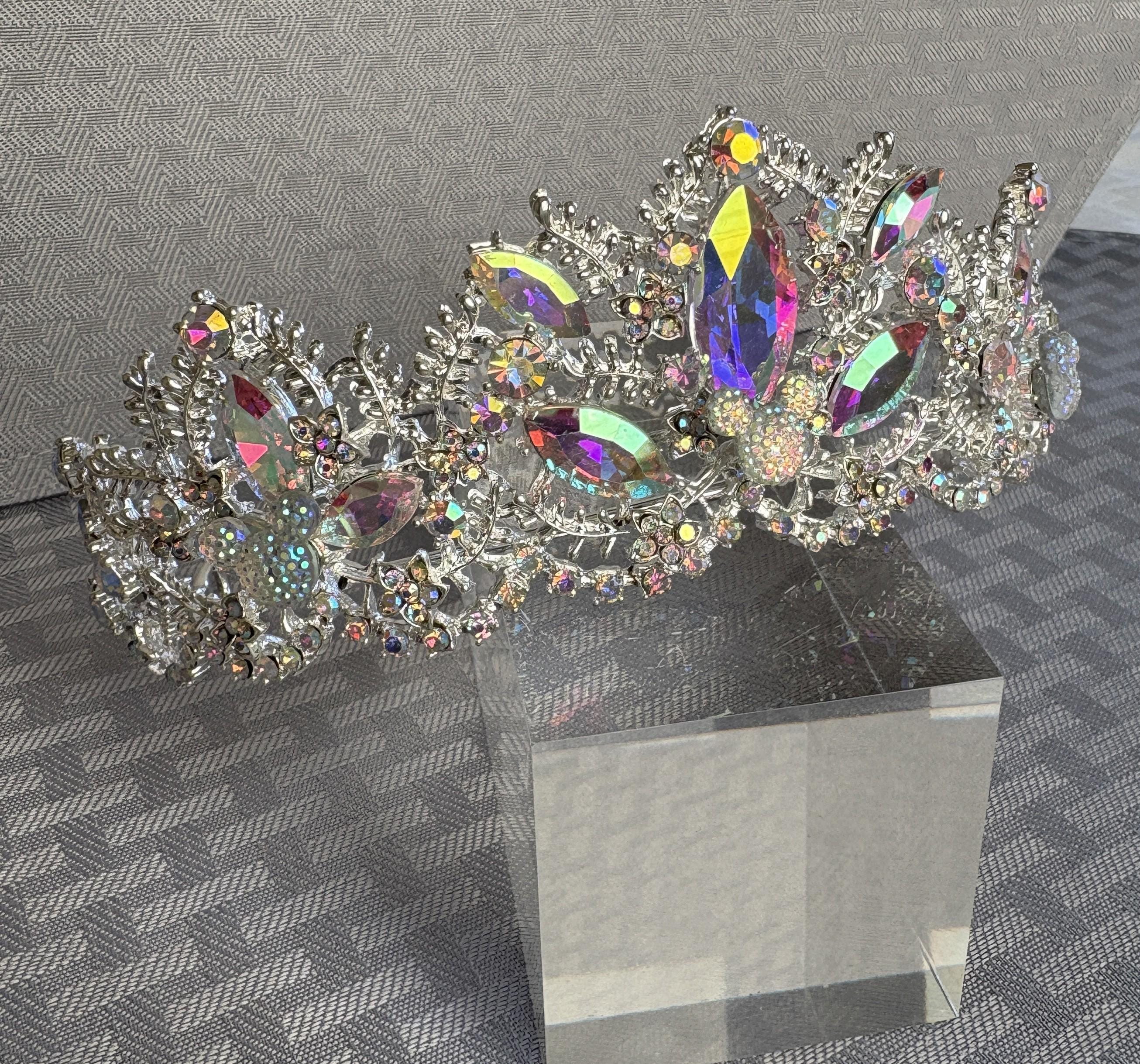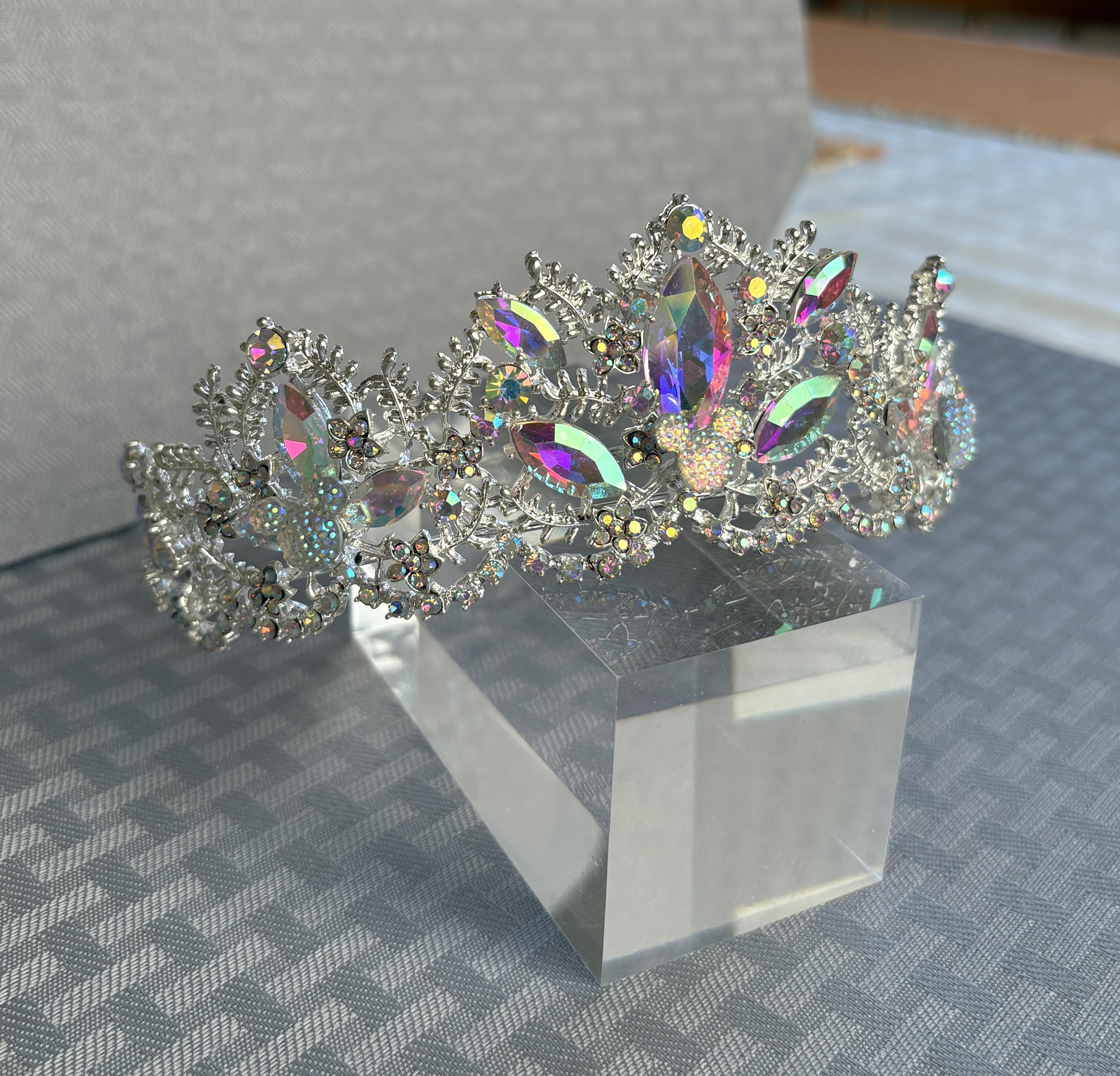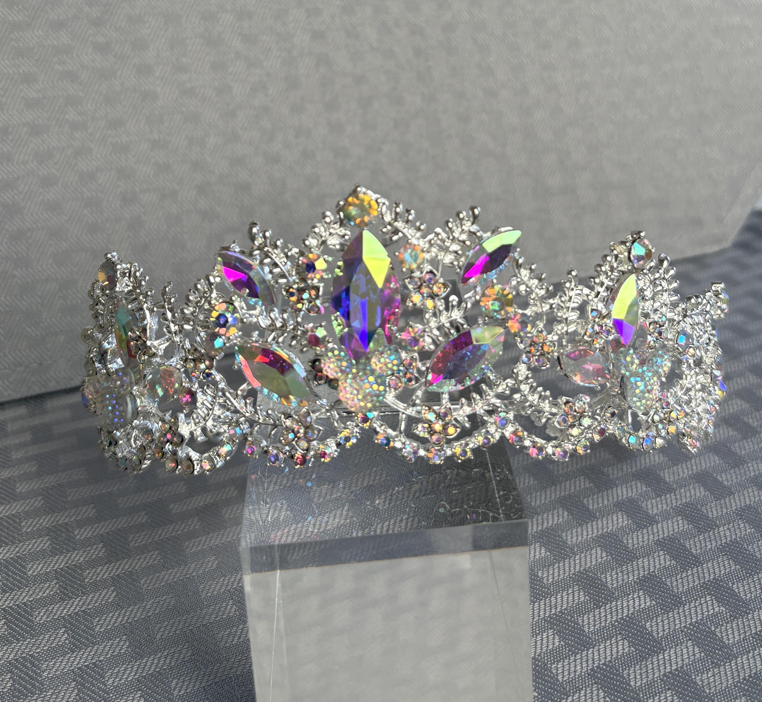 Gorgeous crystal clear rhinestone jewels make up this silver tone tiara along with beautiful aurora borealis rhinestones placed through the center of the crown. The aurora Borealis stones pick up colors when light hits them. so at times they may look blue or pink or purple. They are dazzling!