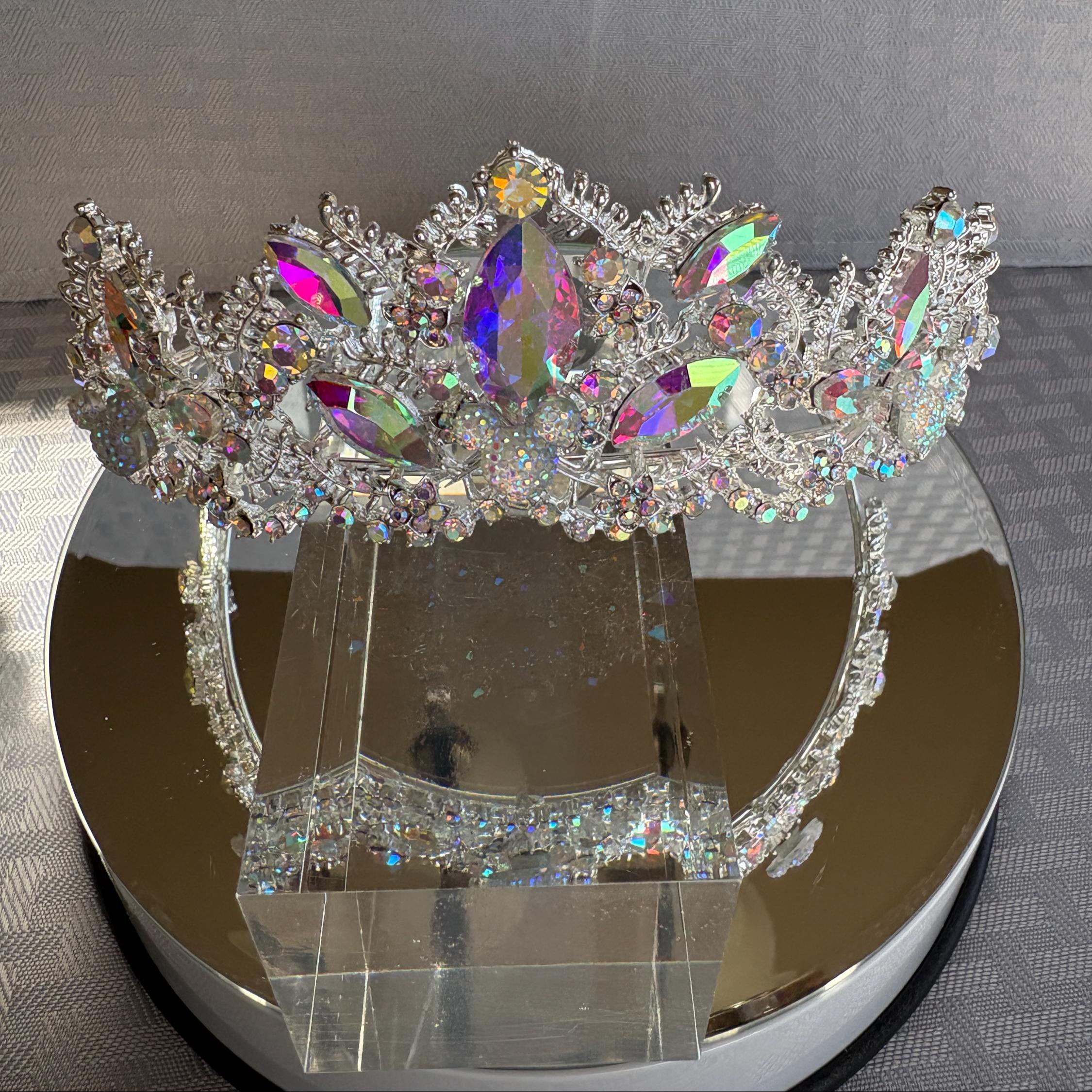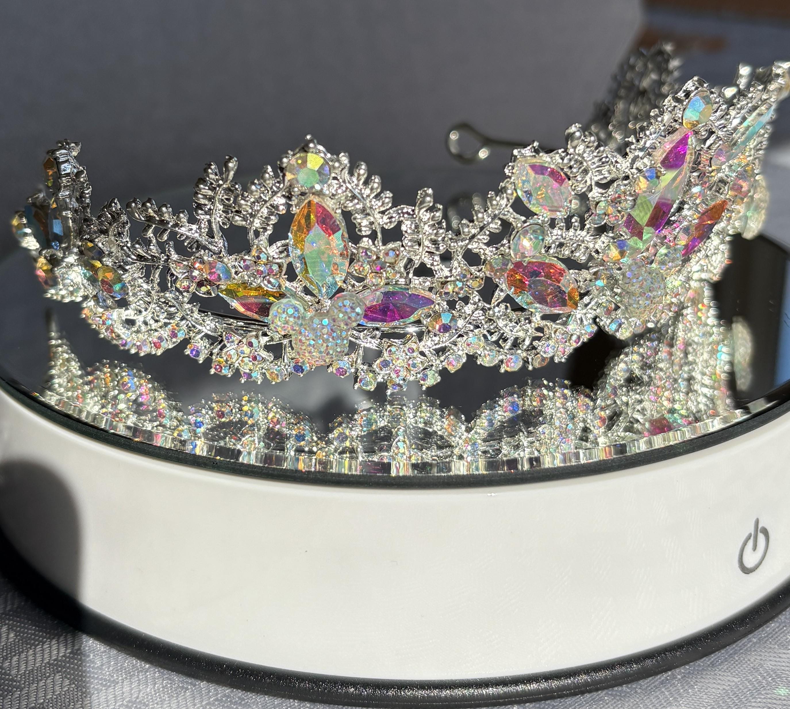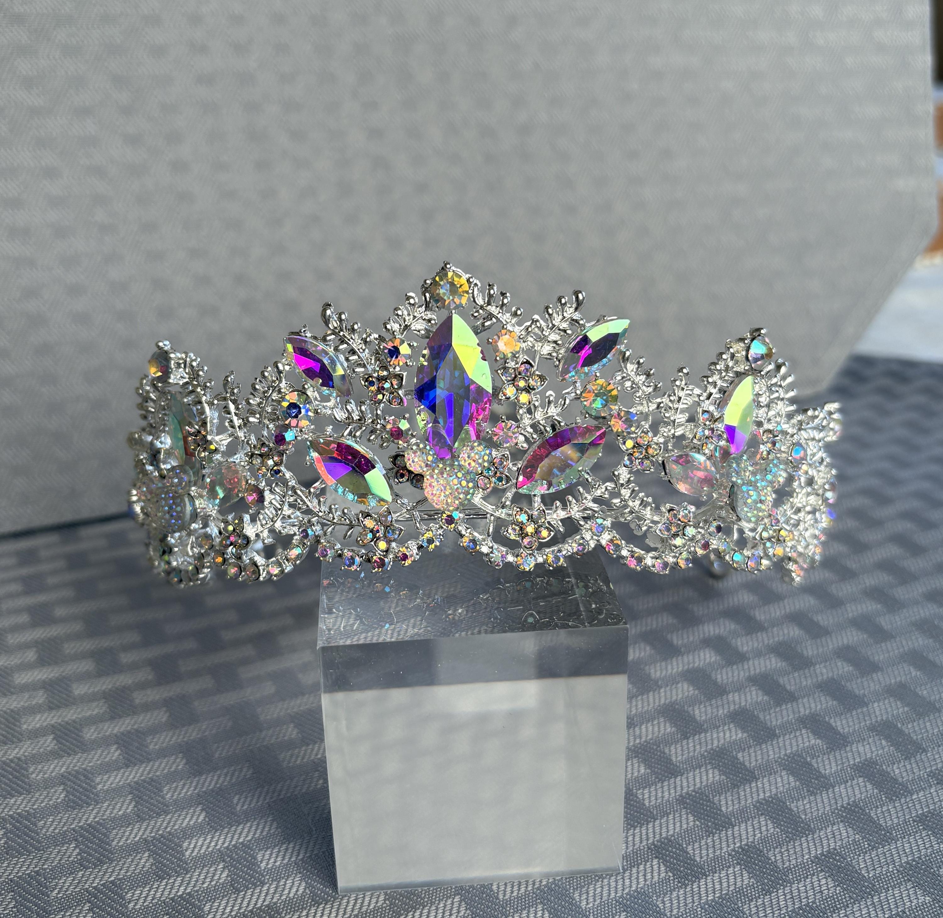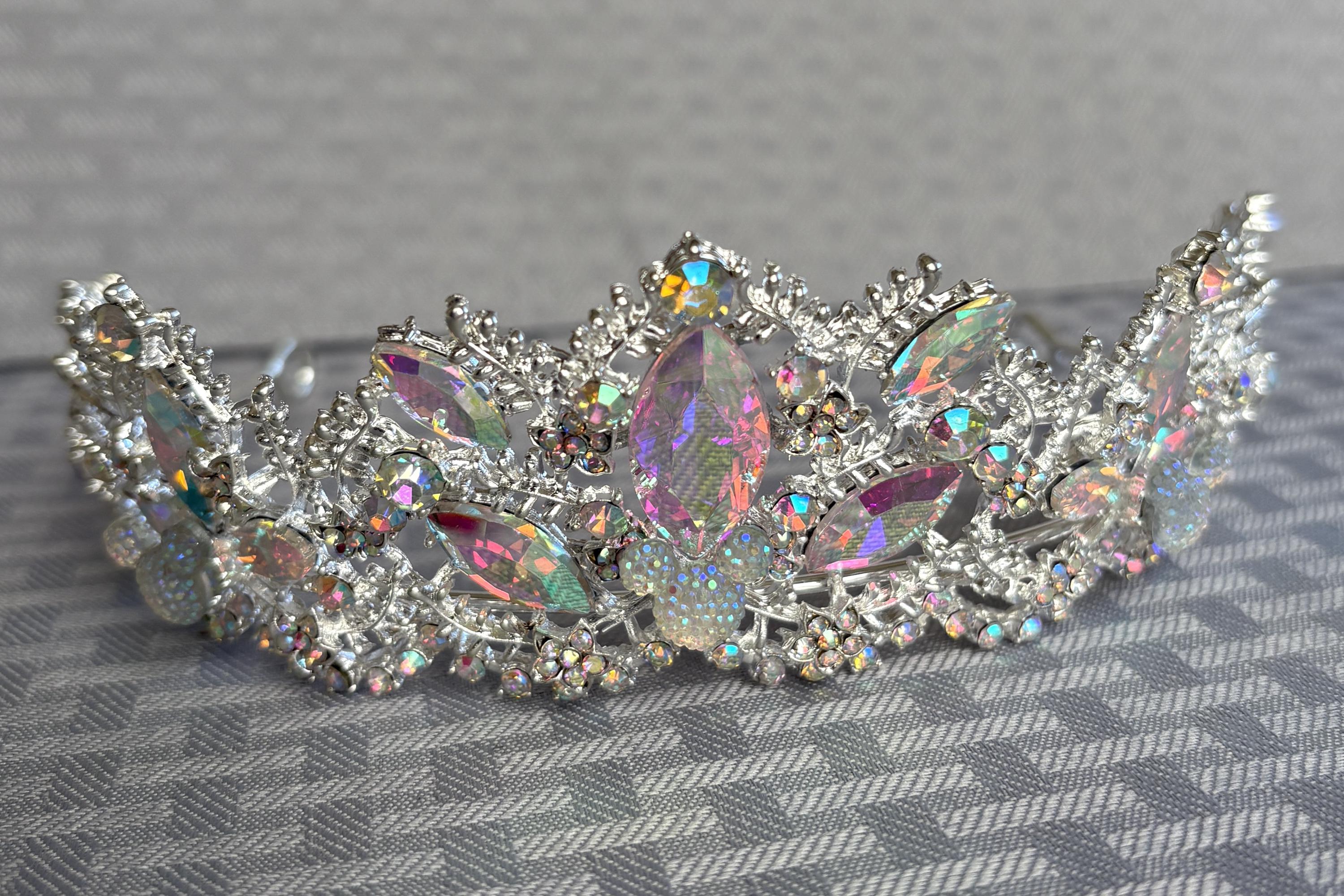 Gorgeous crystal clear rhinestone jewels make up this silver tone tiara along with beautiful aurora borealis rhinestones placed through the center of the crown. The aurora Borealis stones pick up colors when light hits them. so at times they may look blue or pink or purple. They are dazzling!
