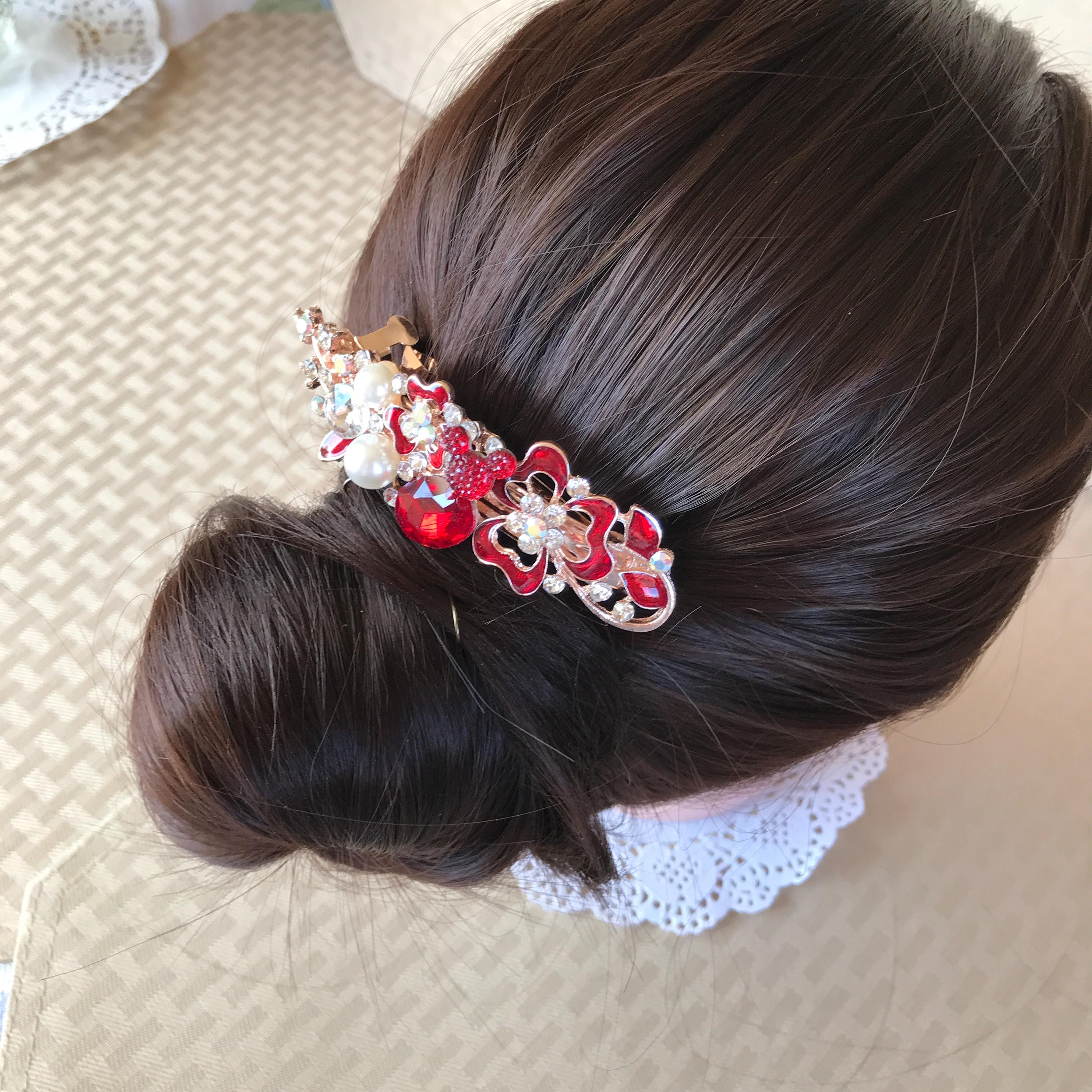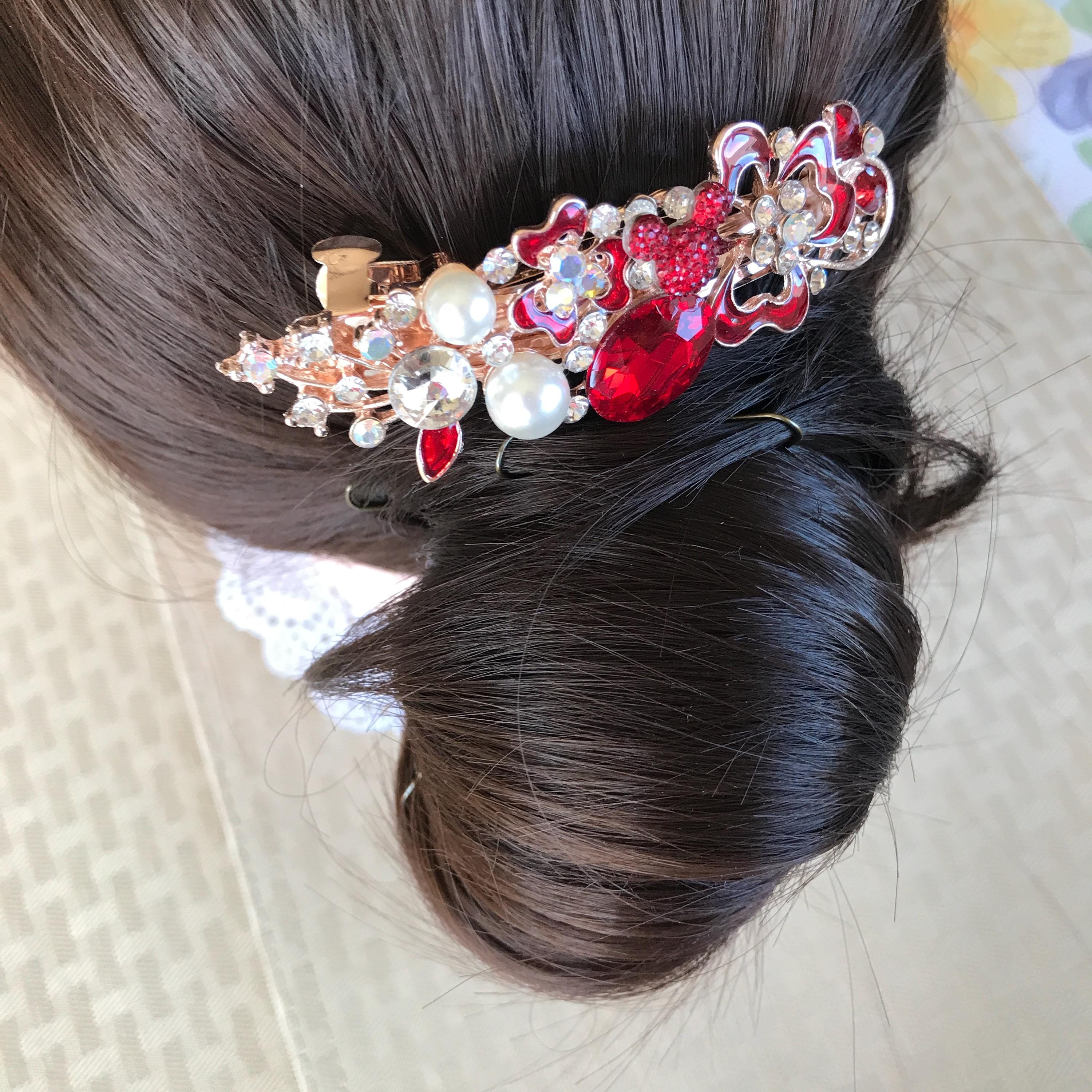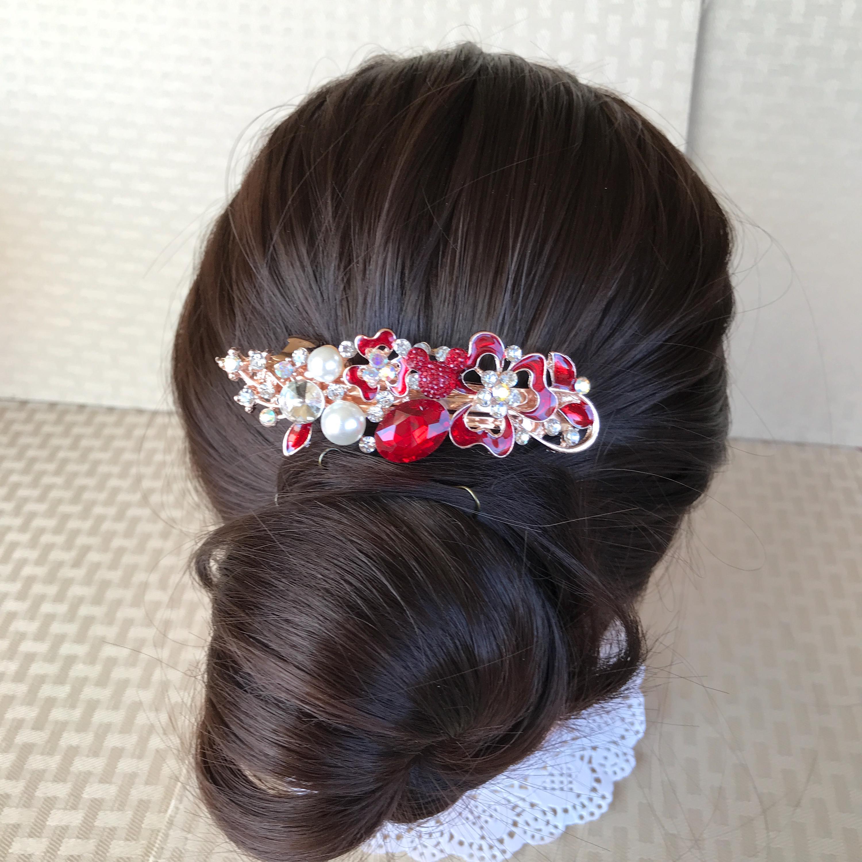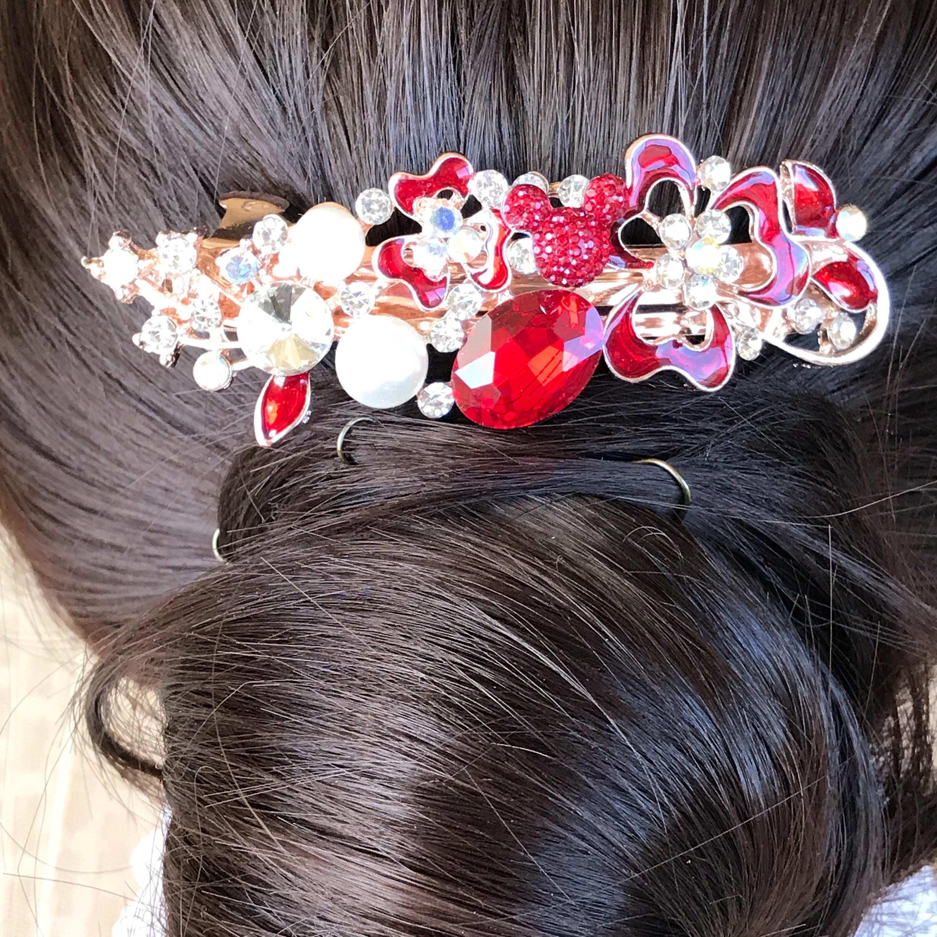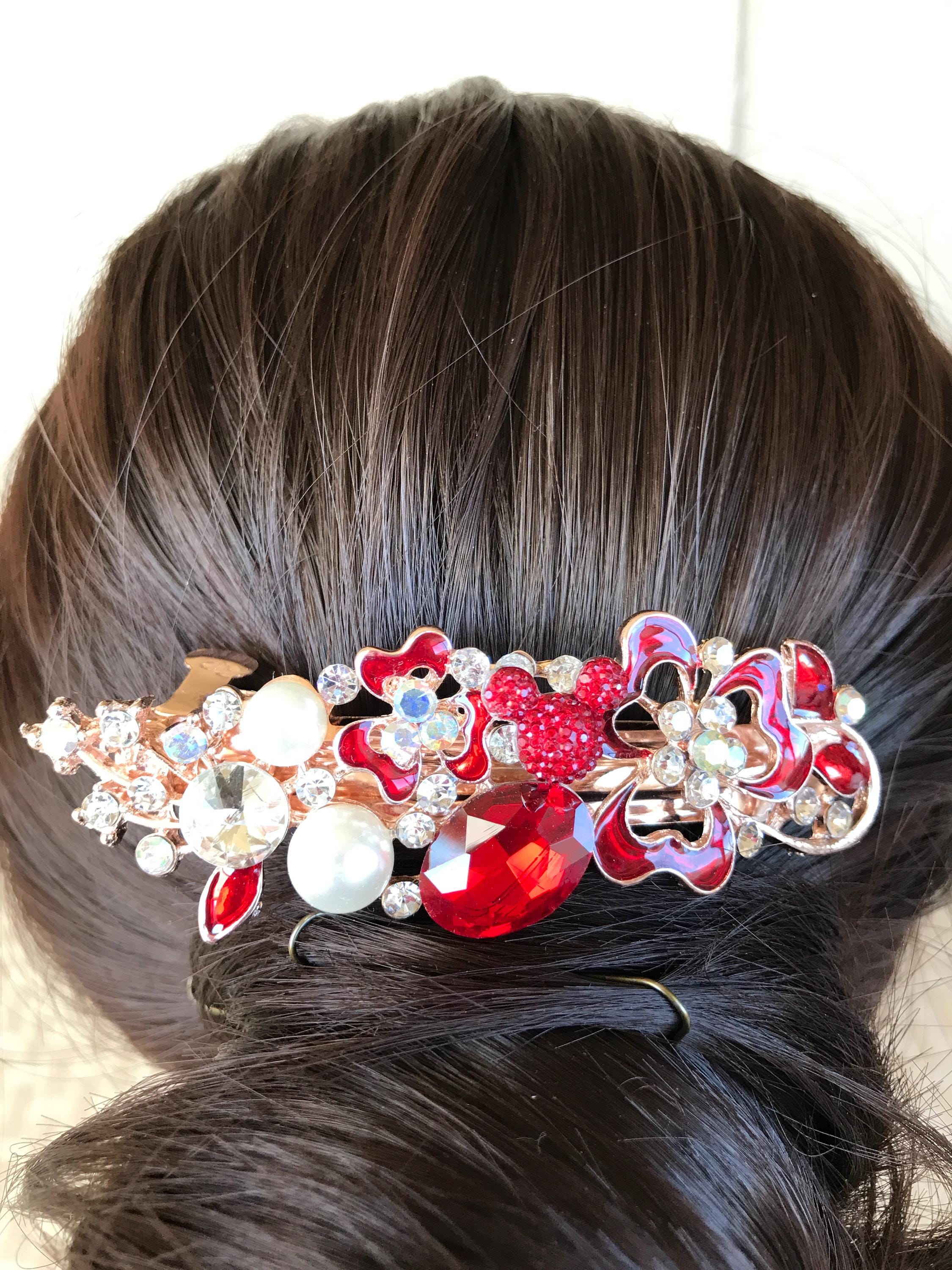 This is the perfect hair accessory and my newest creation in August of 2019. This hair jewelry is made of red and clear crystal rhinestones and white pearls. It is trimmed in a rose gold tone finish. What makes this barrette so special is the addition of a tiny half inch red resin mouse silhouette attached to the center. It is the most wonderful addition to your magical day or any time you want to dress up your hair. It can be worn again and again to all your special occasions.