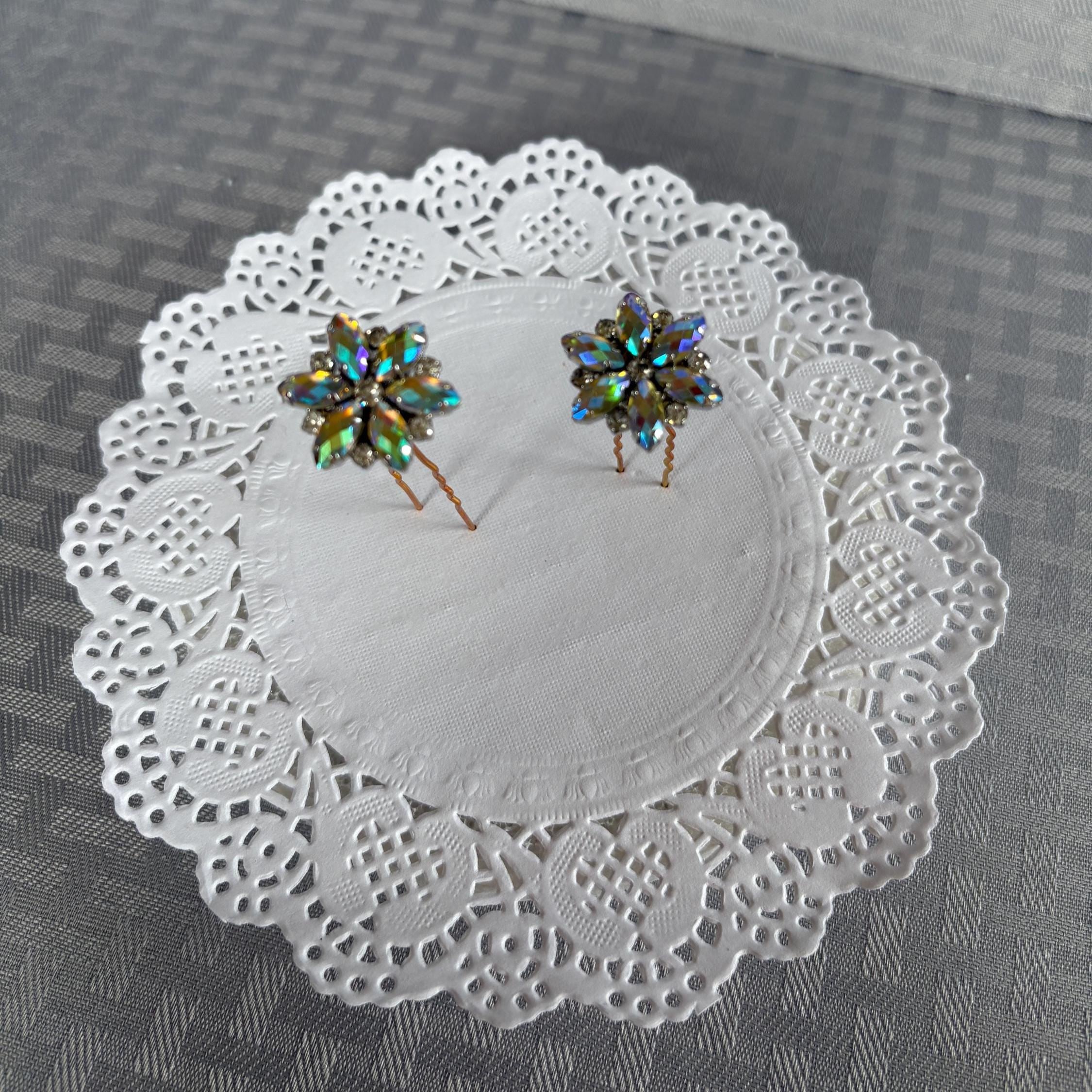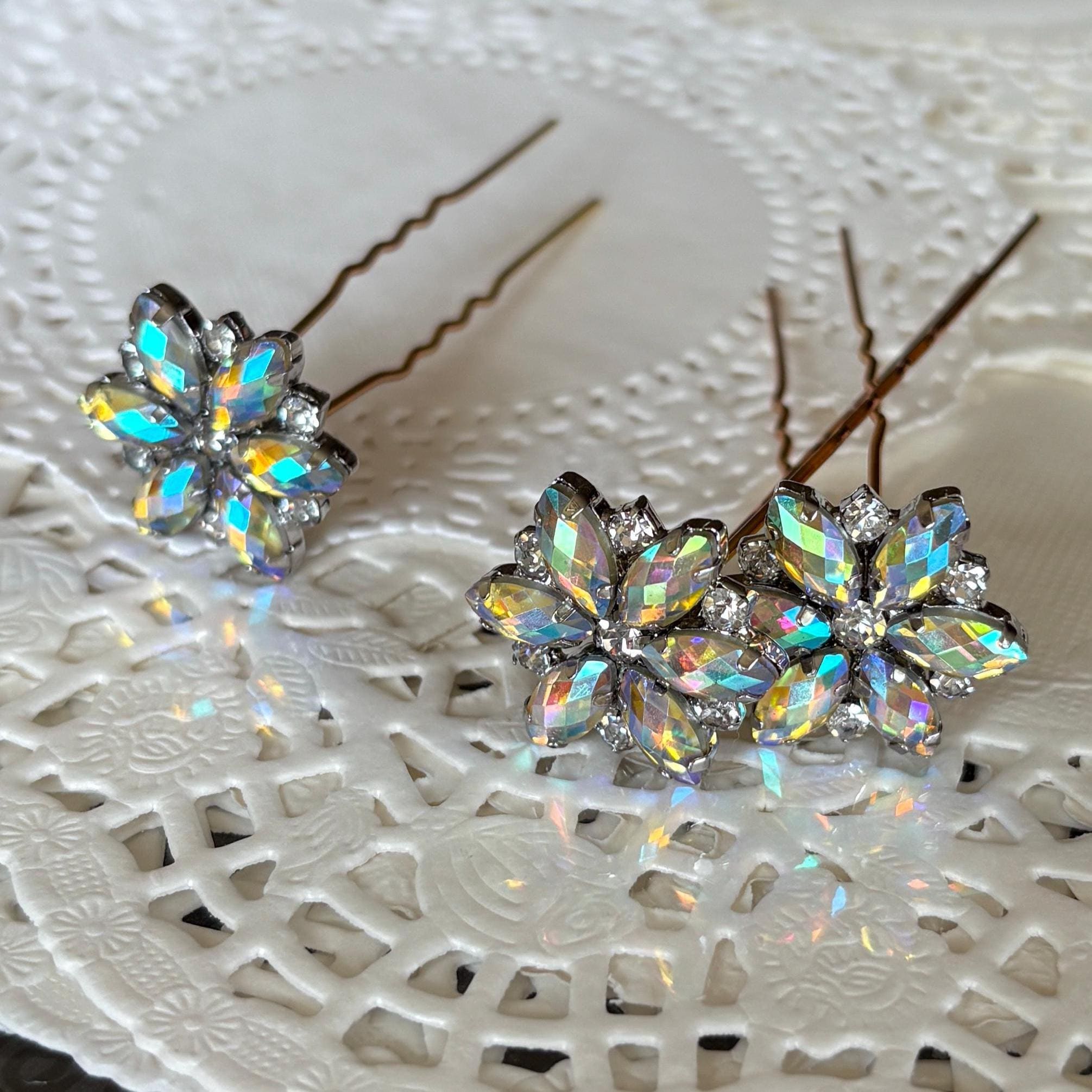 Star shaped wedding hair pins. These look like a 6 pointed star, a flower or a snowflake. Whichever you need it to be. This is for 2 hair pins in glass rhinestones with an aurora borealis rainbow finish. They have a dazzling sparkle and will look amazing in your hair.
