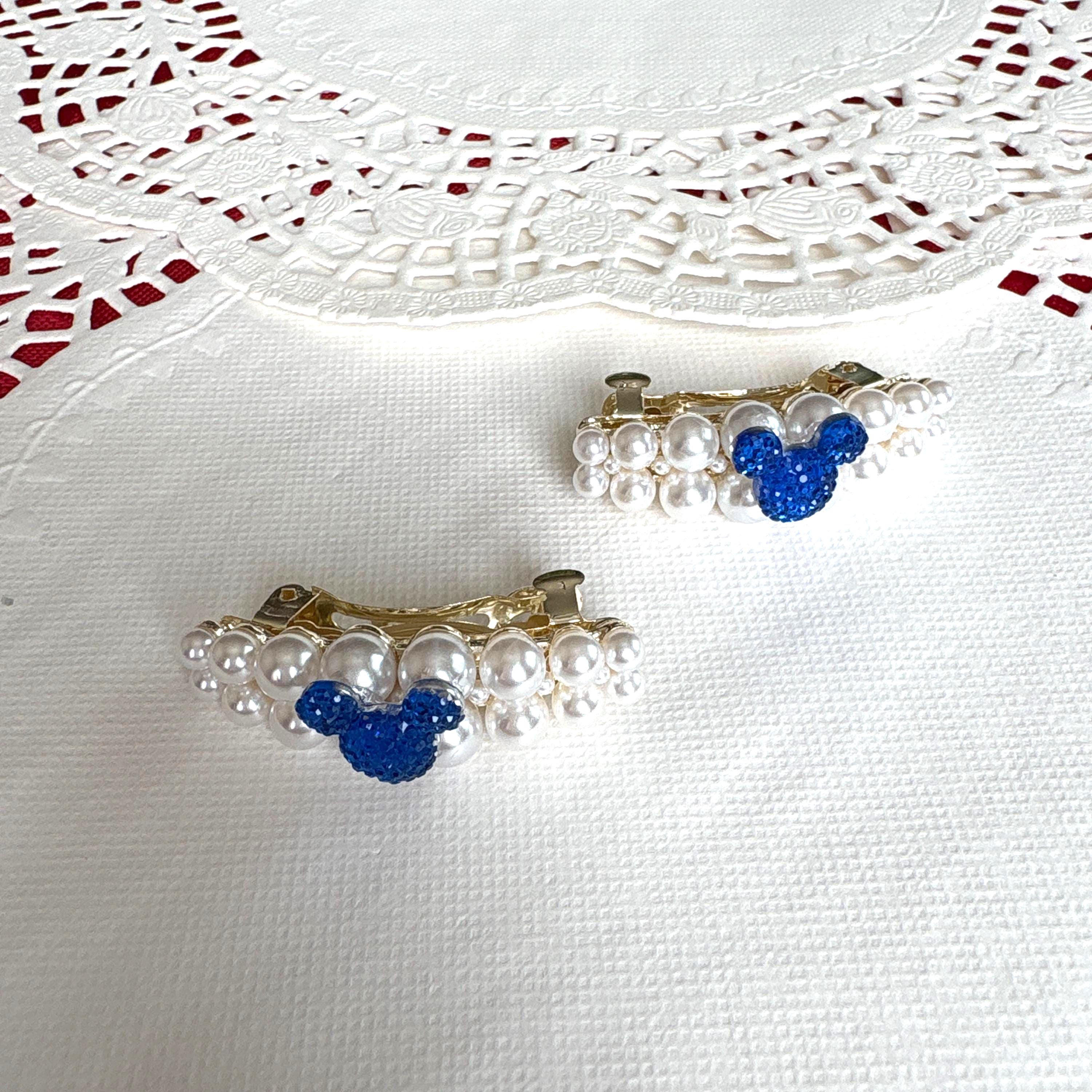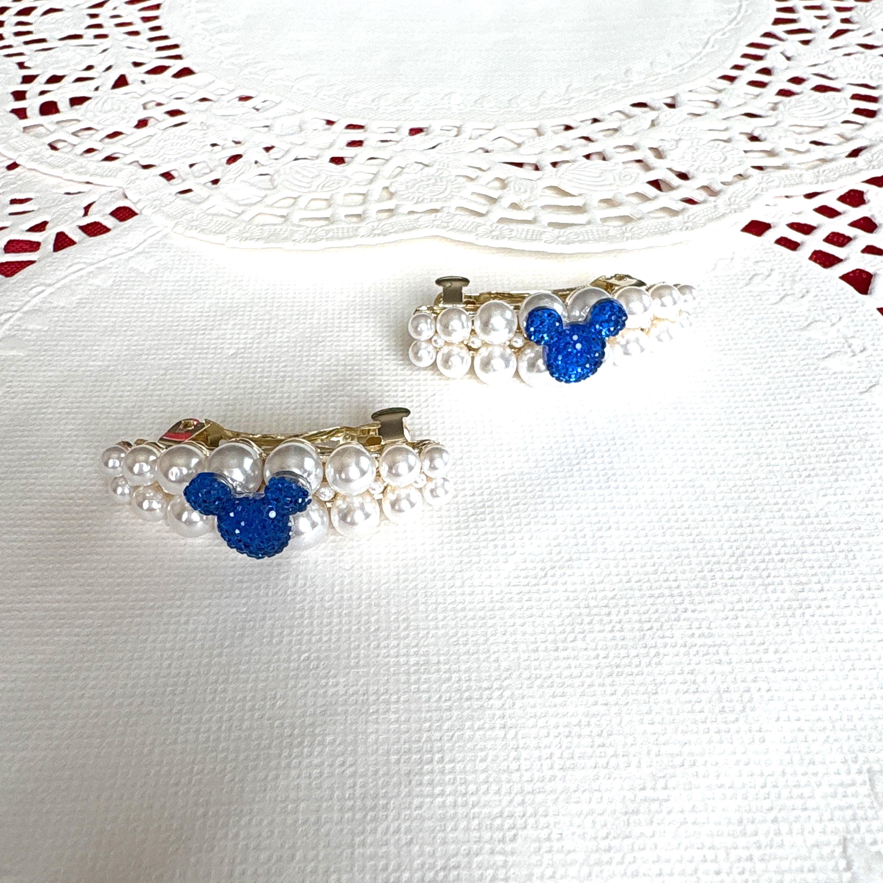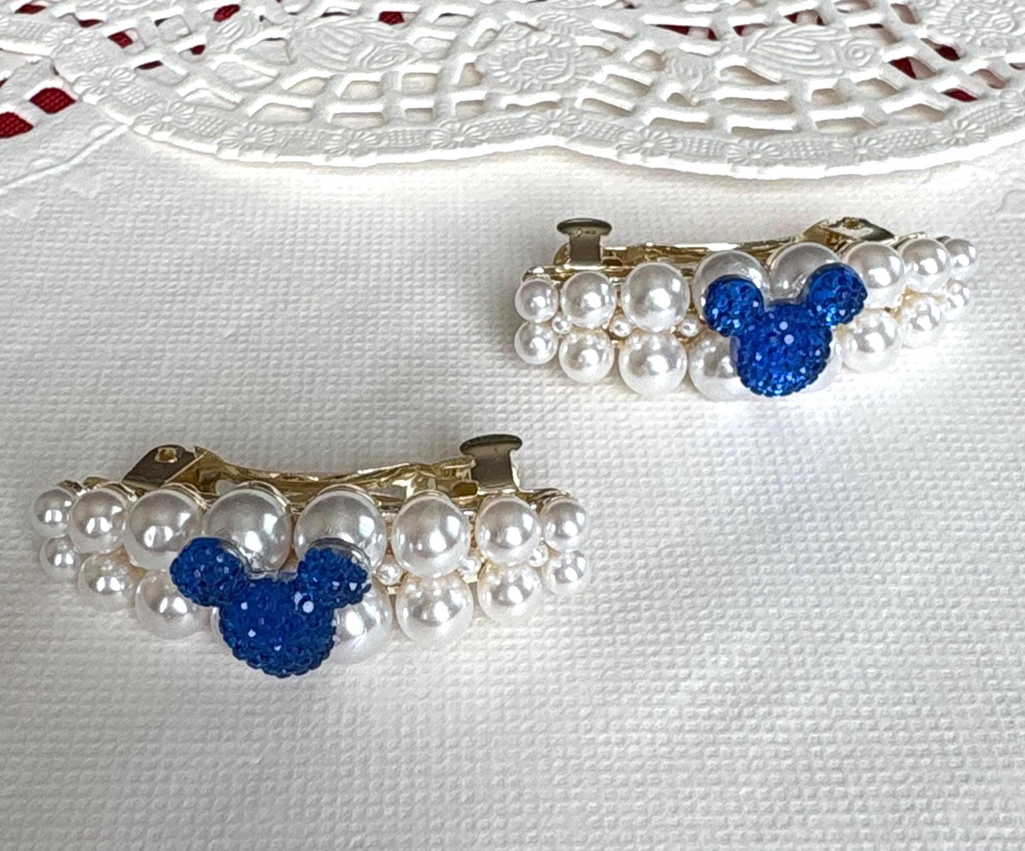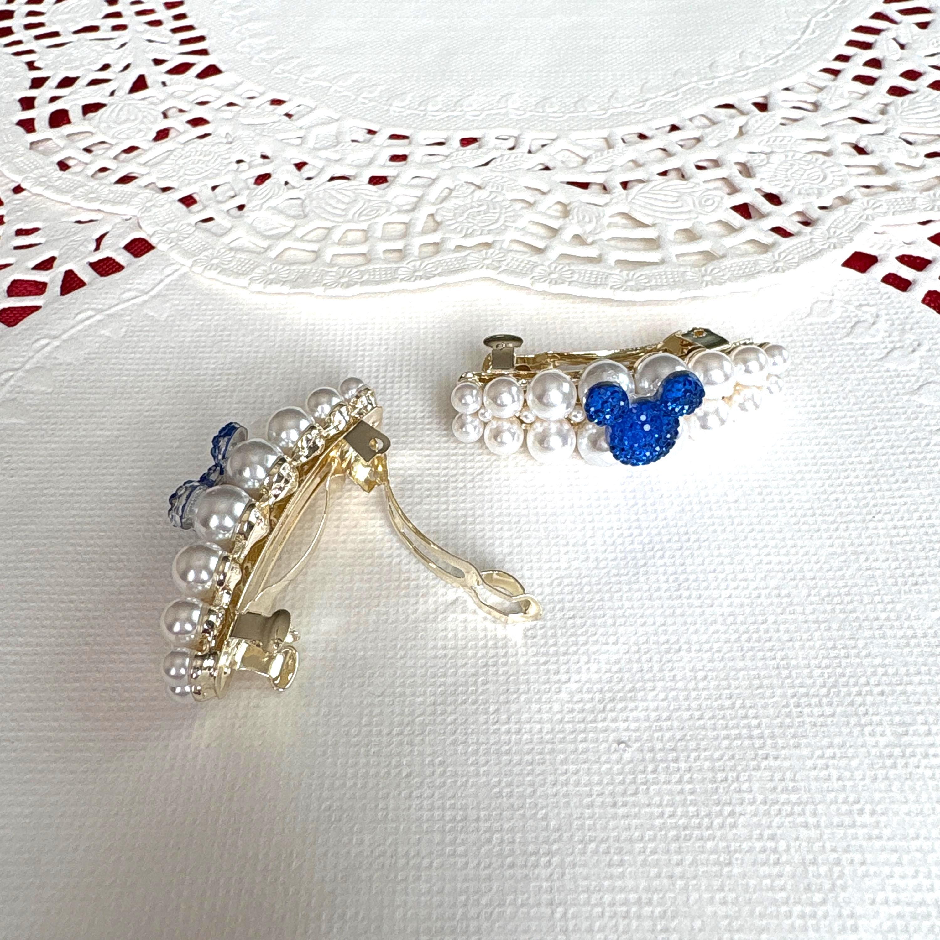 Precious Pearl Barrettes with Royal Mickeys in a silver tone setting on a French Clasp. This set comes as 1 Pair. They will go on each side of your head. Not made to both go on the same side of your head.
