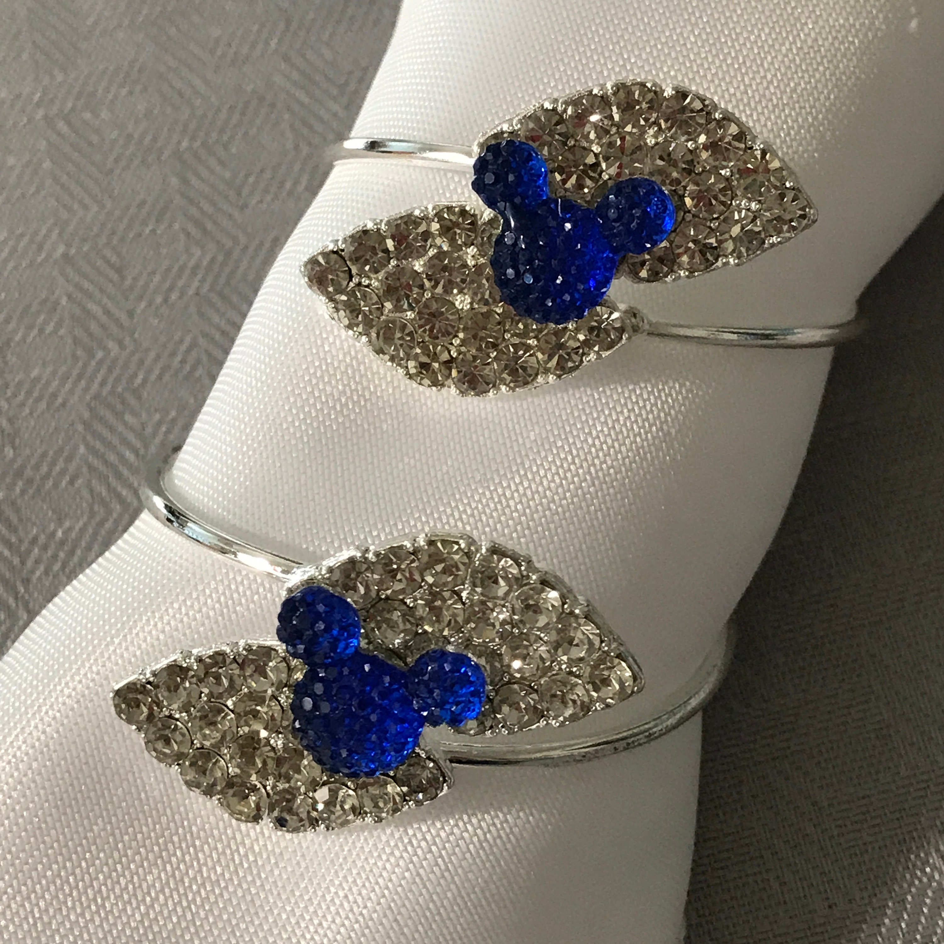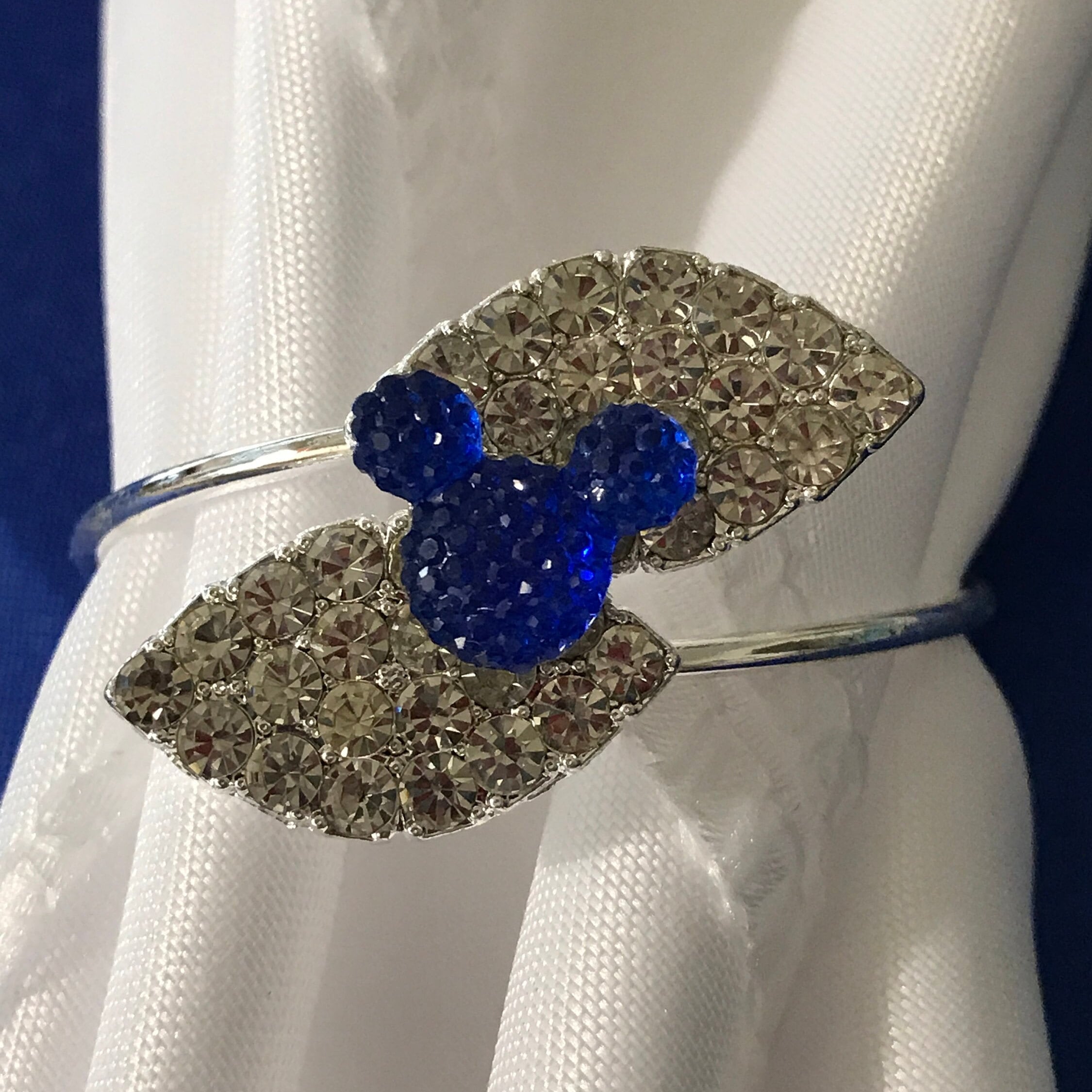 The leaves are full of sparkling clear rhinestones with an adorable royal blue mickey mouse silhouette attached in the center.