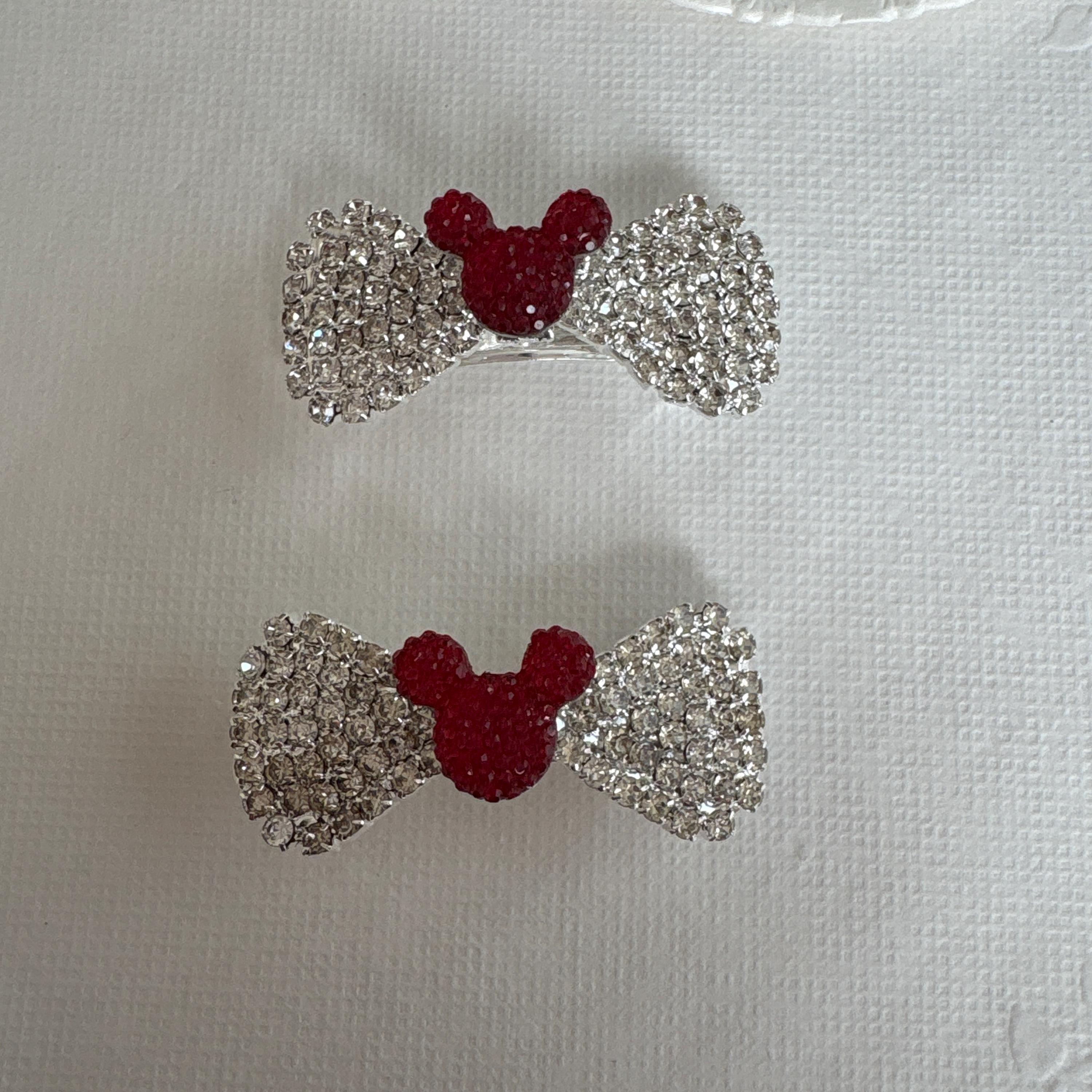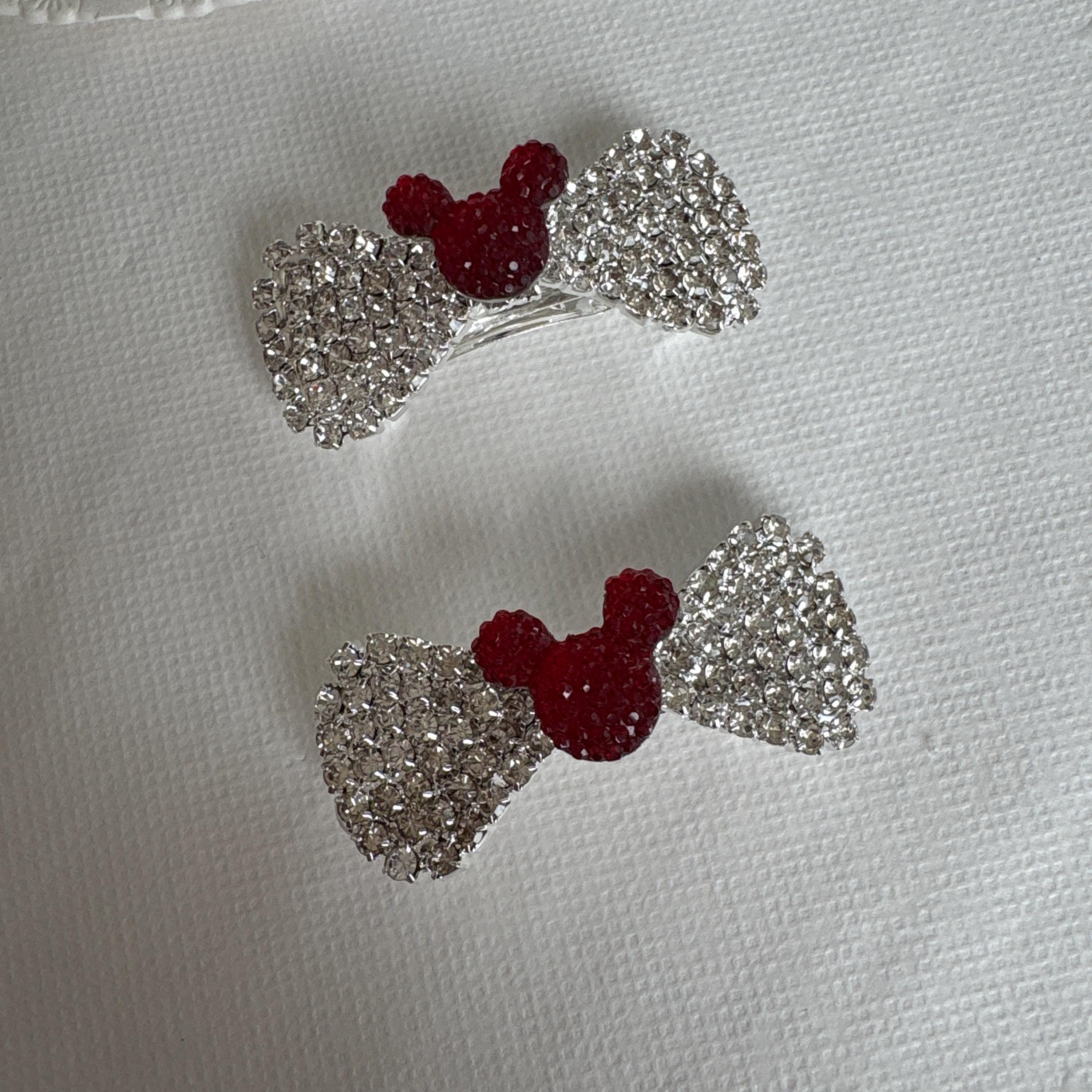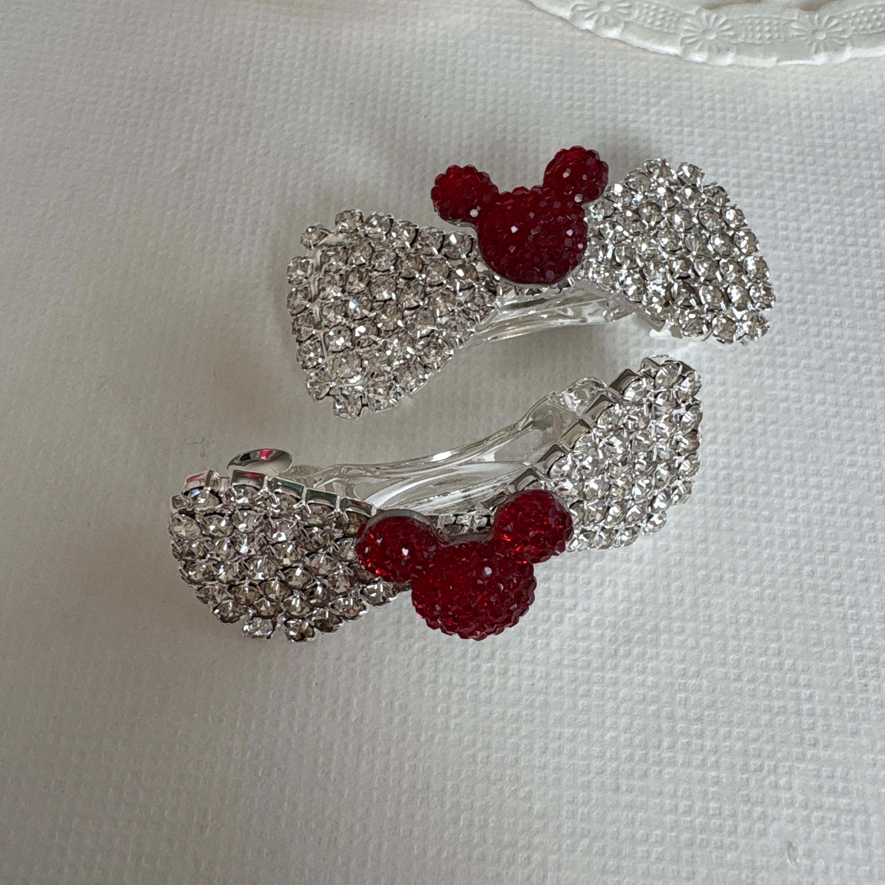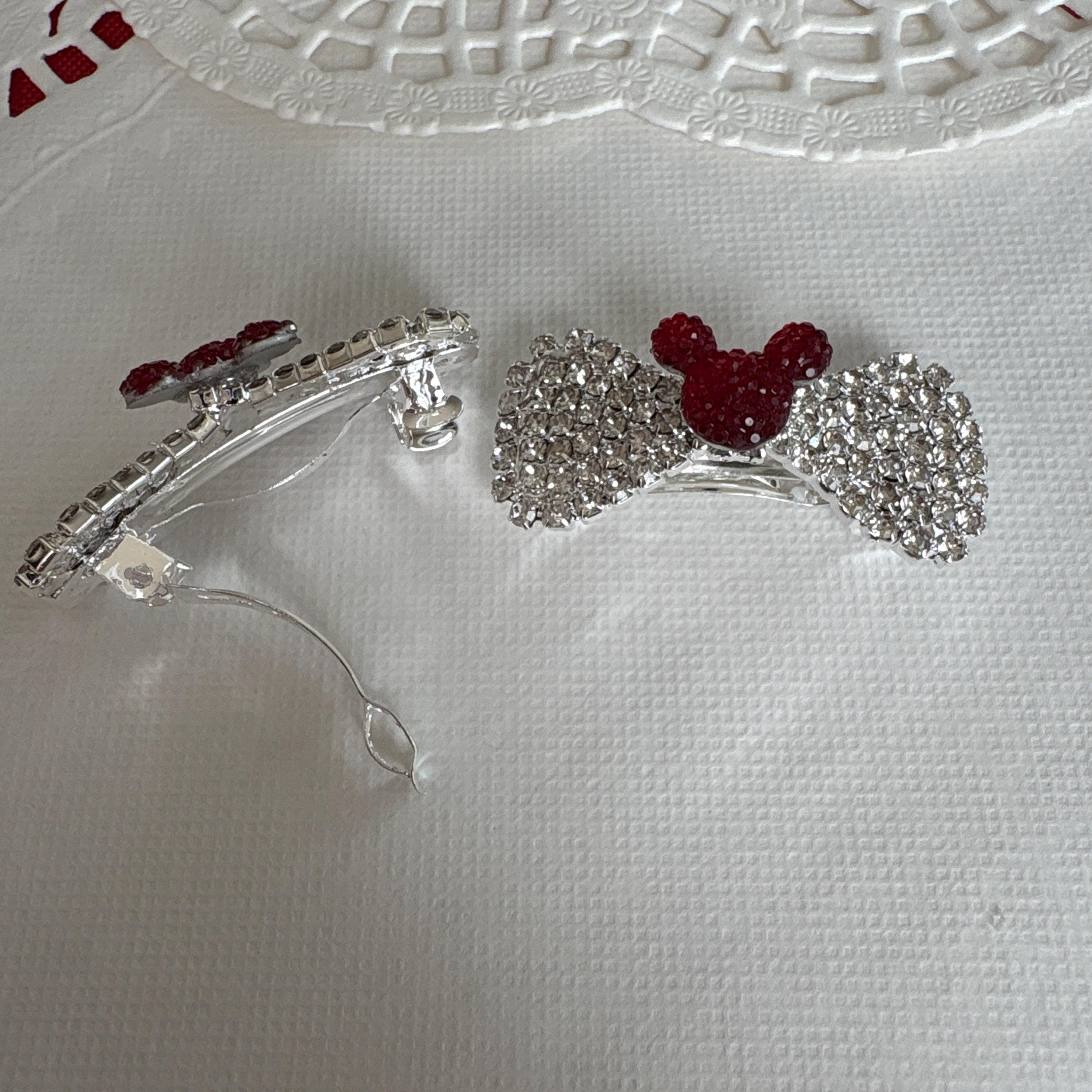 Precious Rhinestone Bow Barrettes with Red Mickeys in a silver tone setting on a French Clasp. This set comes as 1 Pair. They will go on each side of your head. Not made to both go on the same side of your head. If you want them made to go on the same side of your head please message me and I will make them that way.