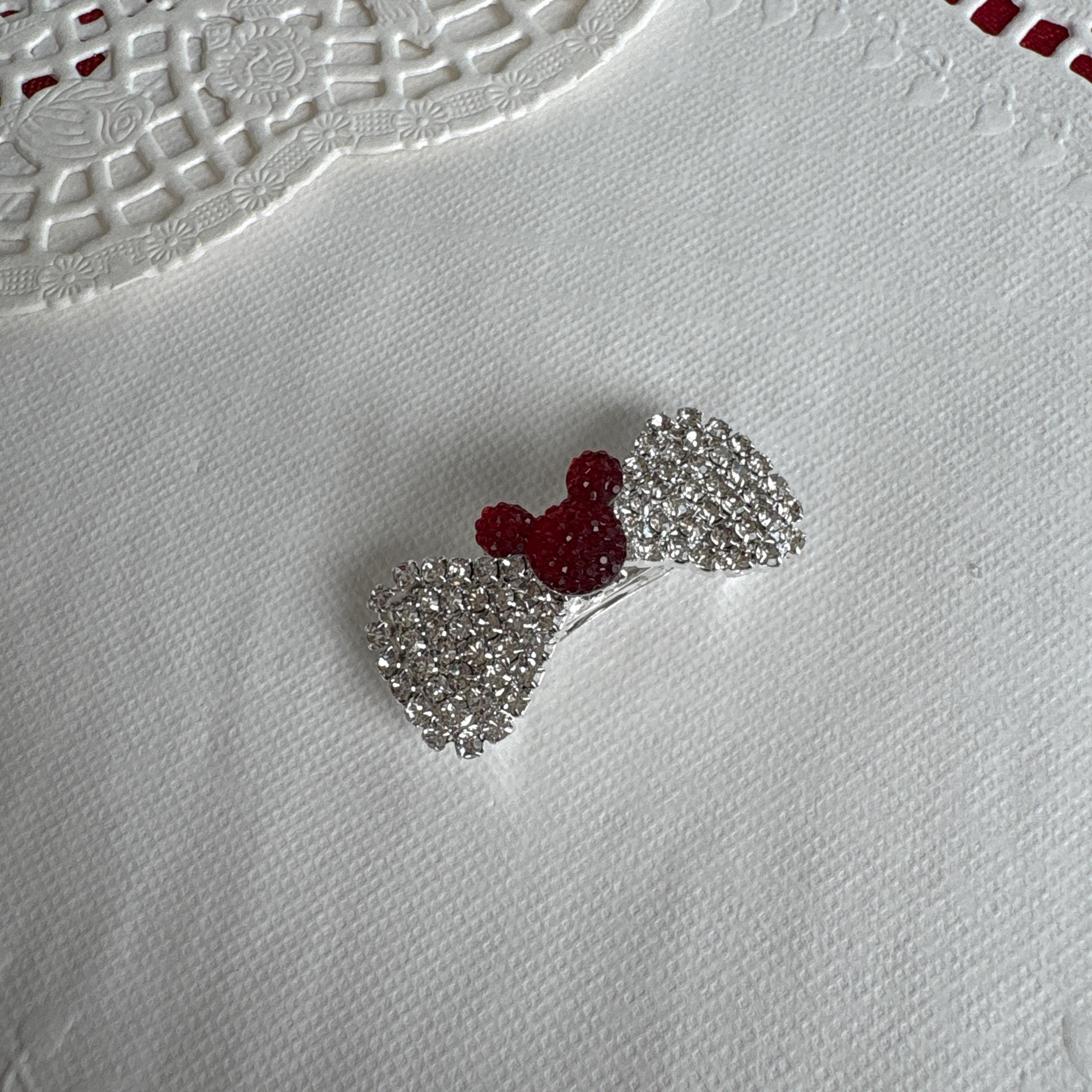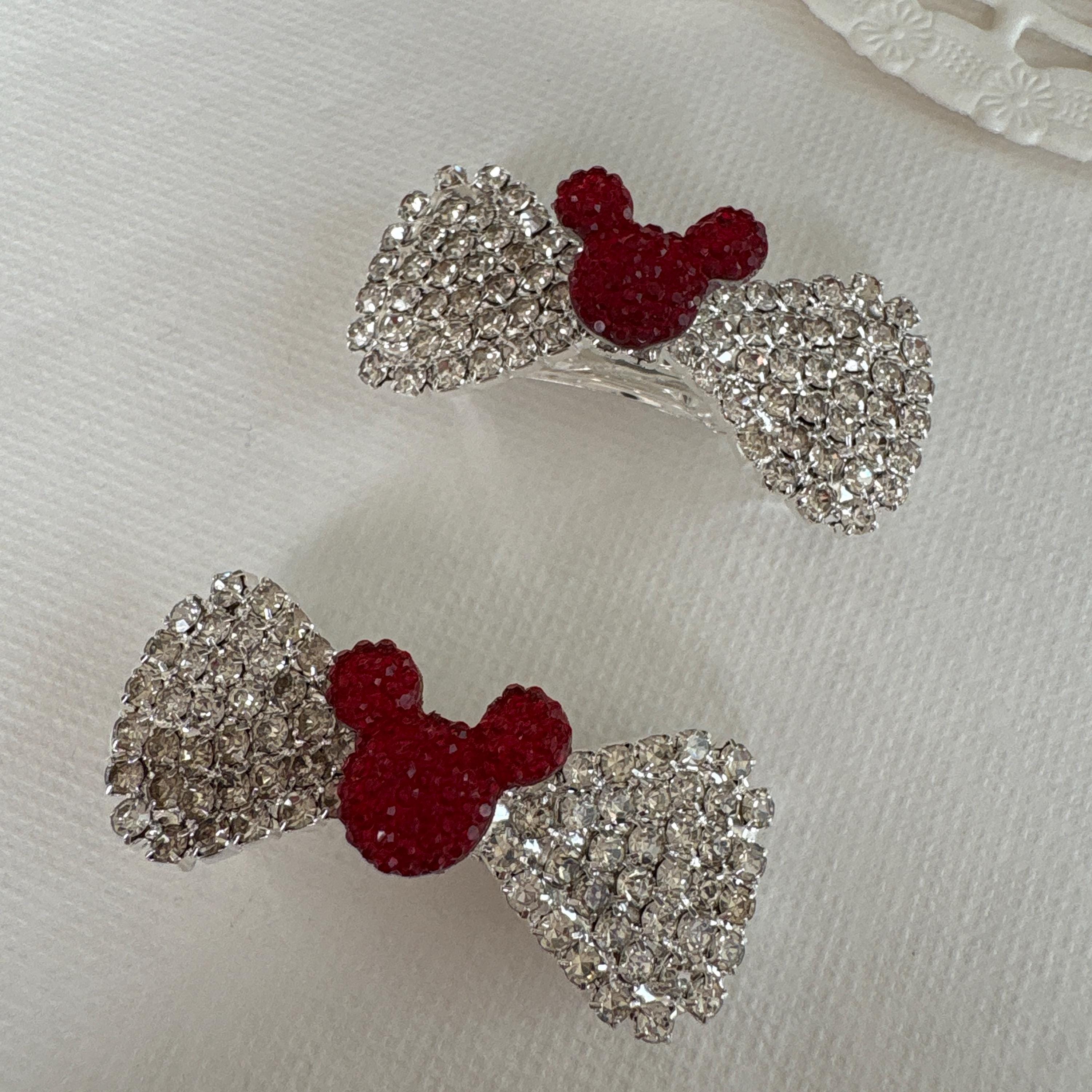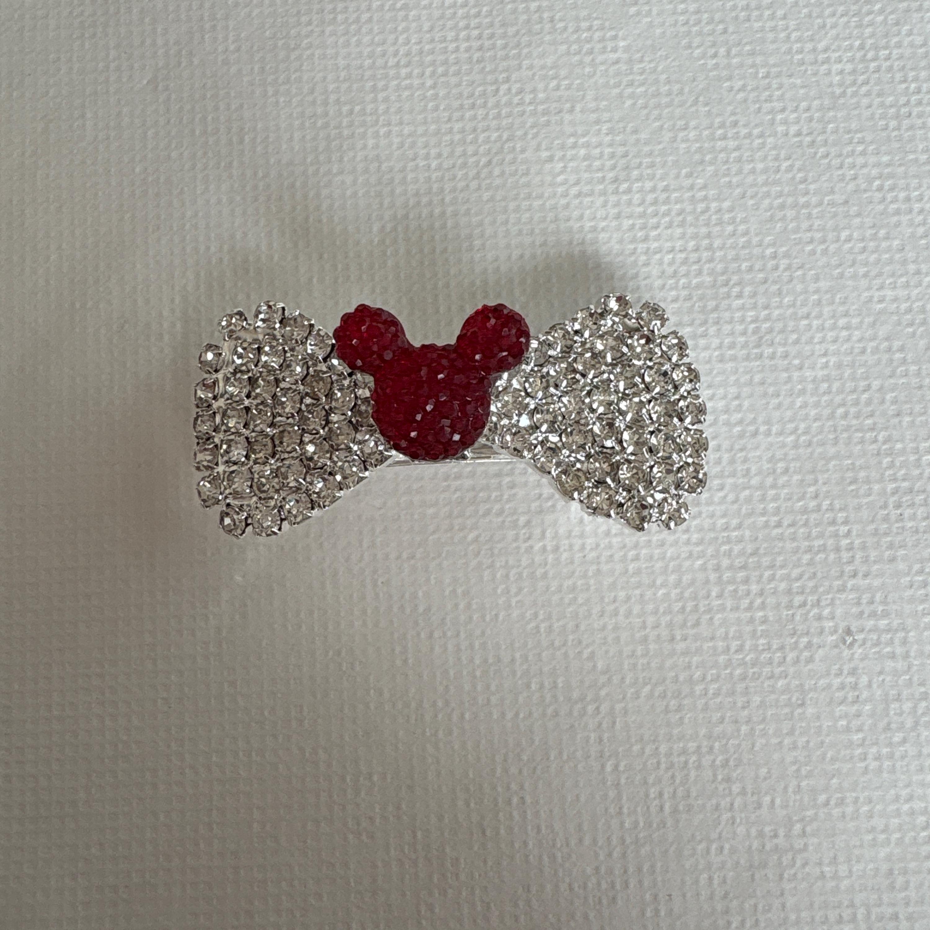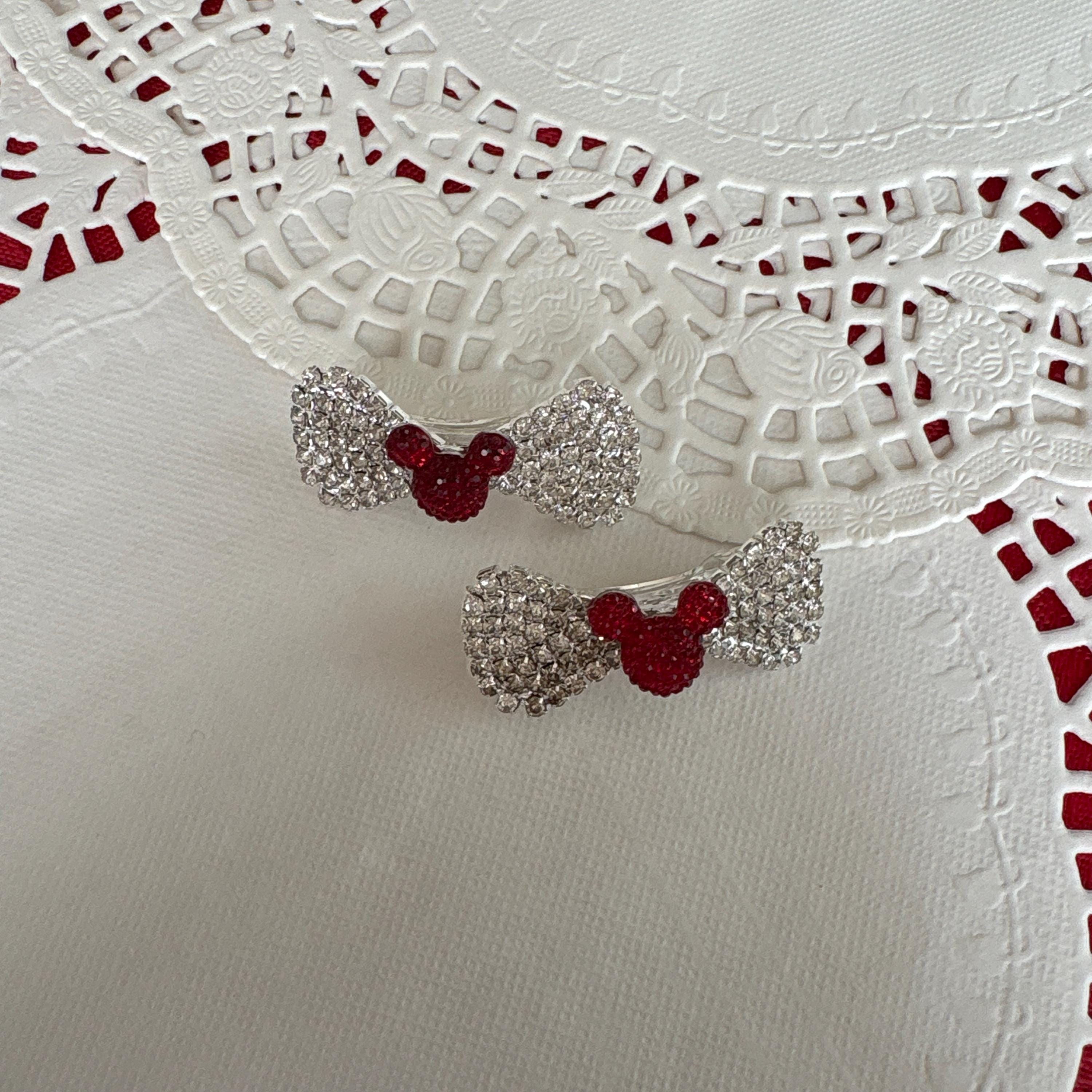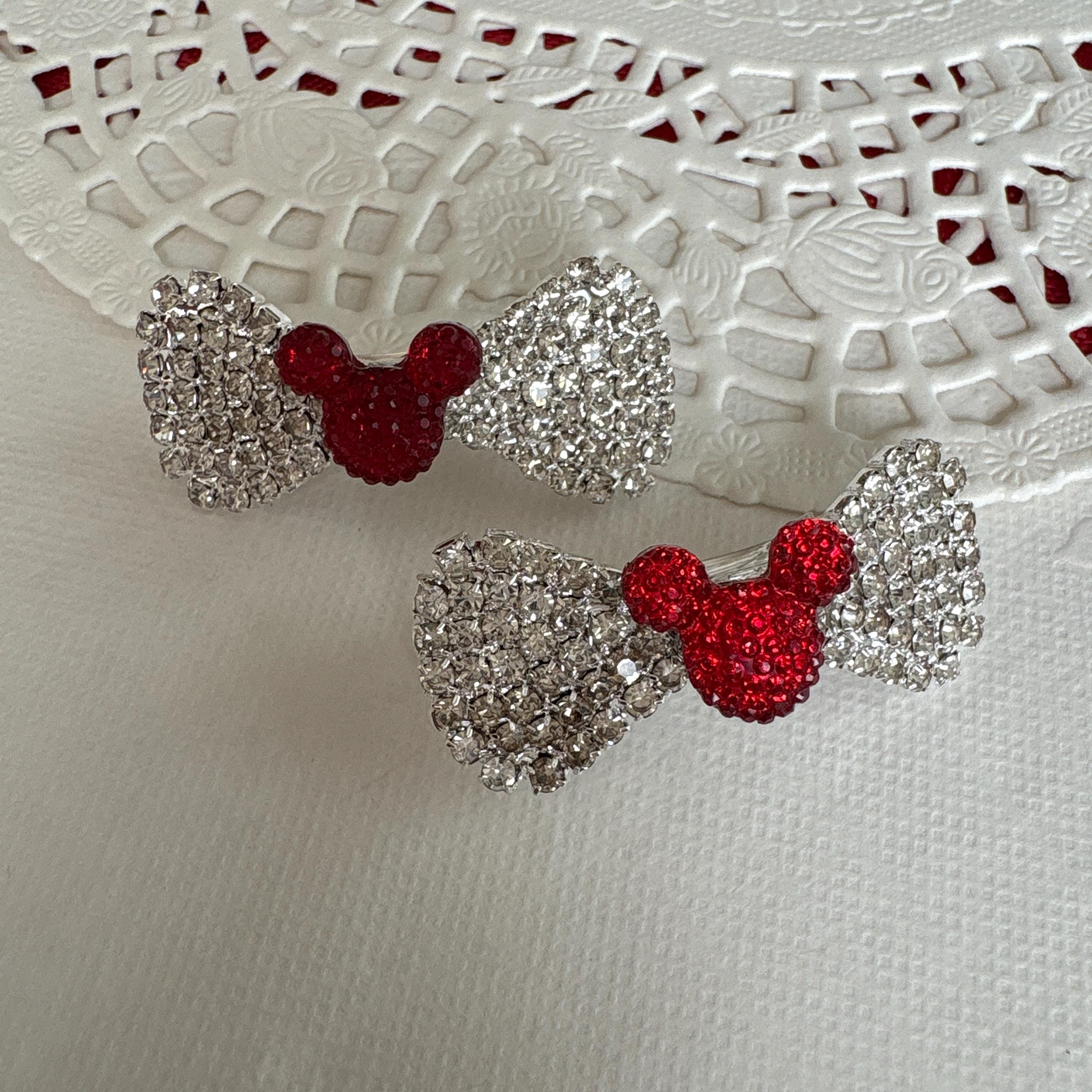 Precious Rhinestone Bow Barrettes with Red Mickeys in a silver tone setting on a French Clasp. This set comes as 1 Pair. They will go on each side of your head. Not made to both go on the same side of your head. If you want them made to go on the same side of your head please message me and I will make them that way.
