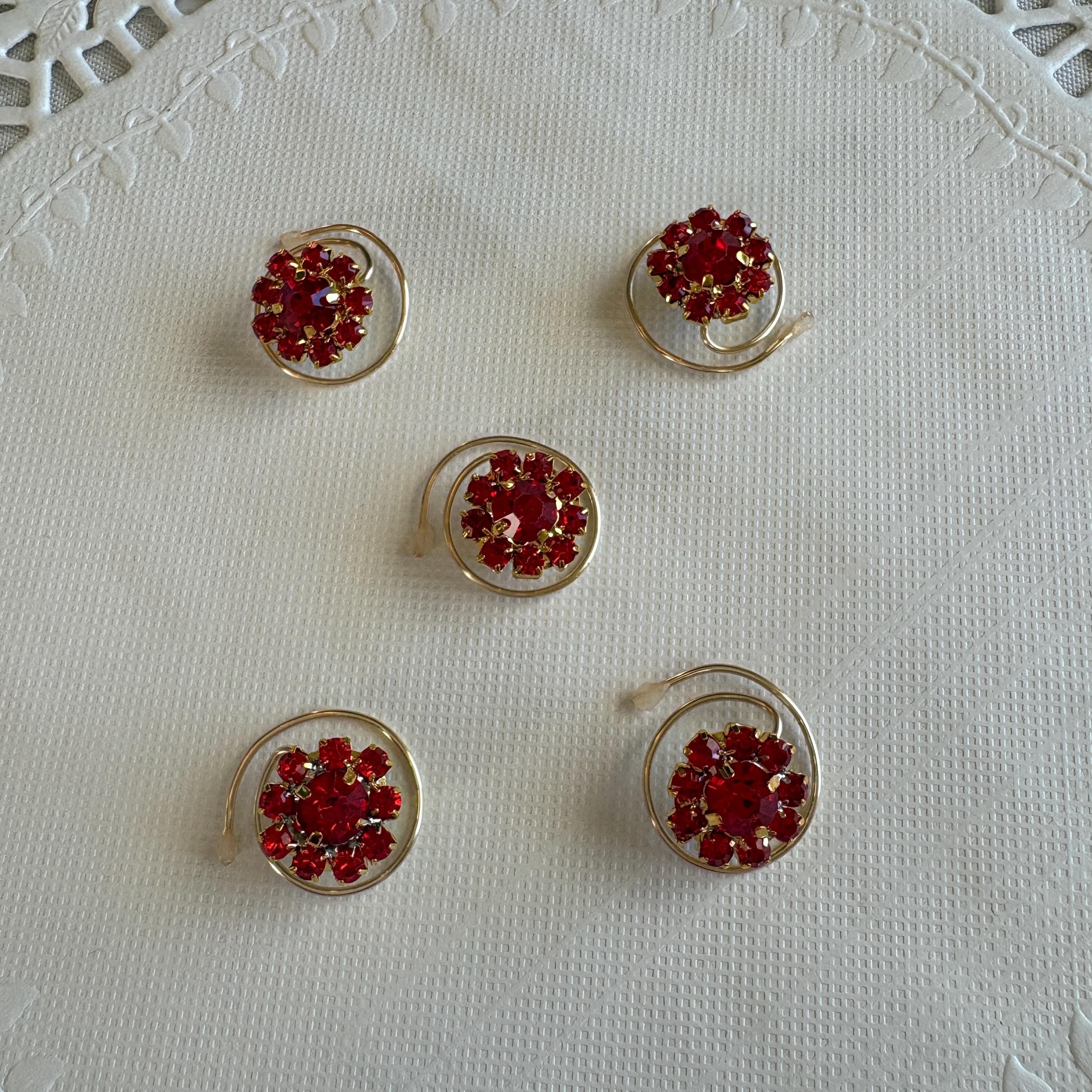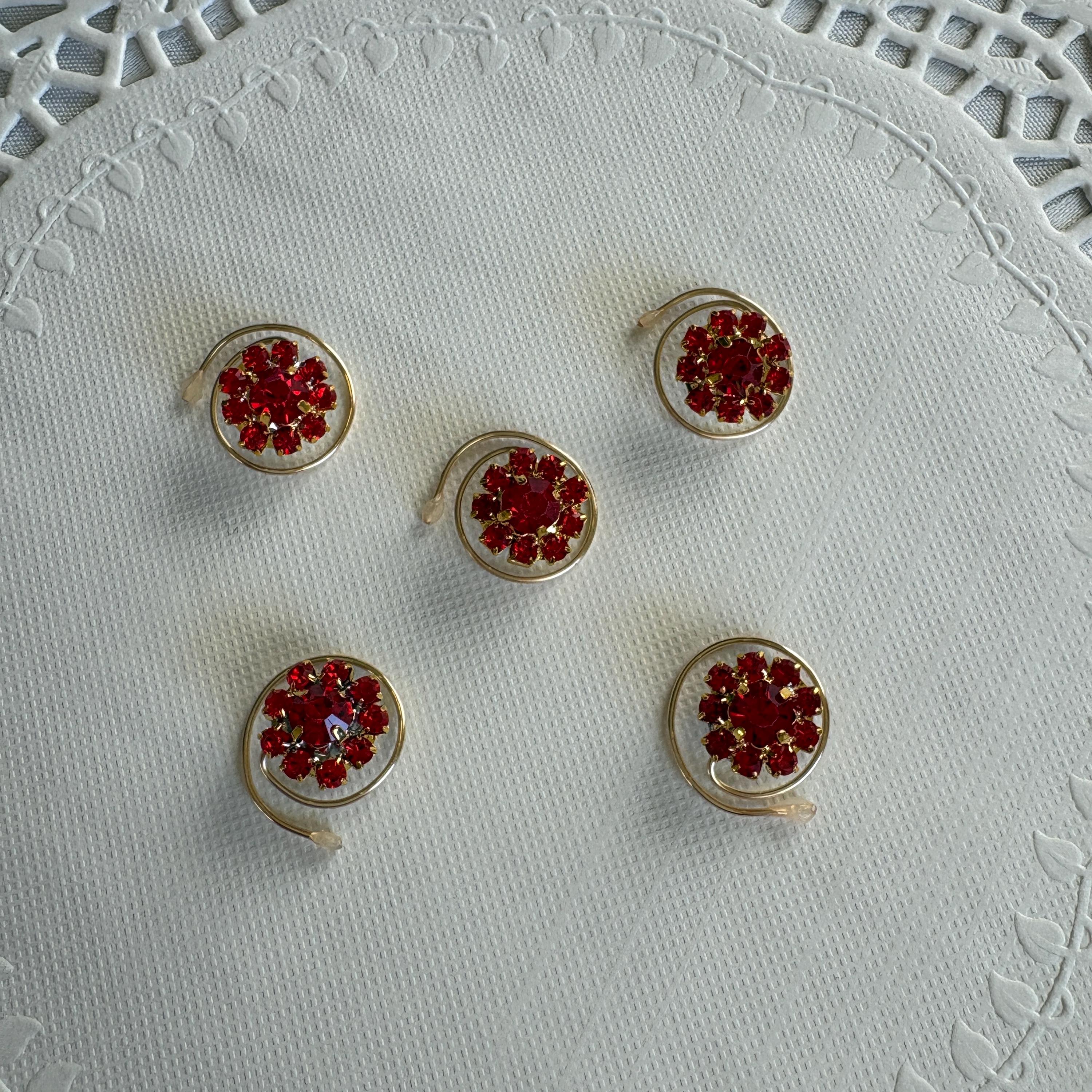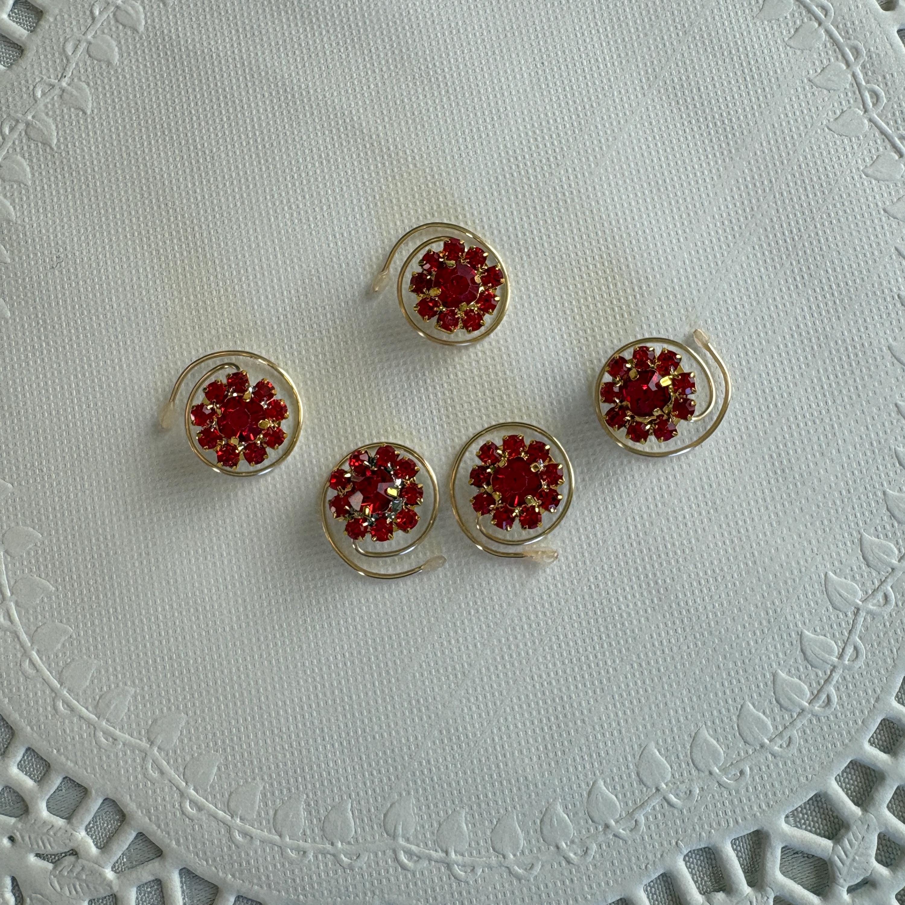 This listing is for a set of 5 Christmas Red Rhinestone Flower Hair Spins set in a gold tone setting. These are beautiful.