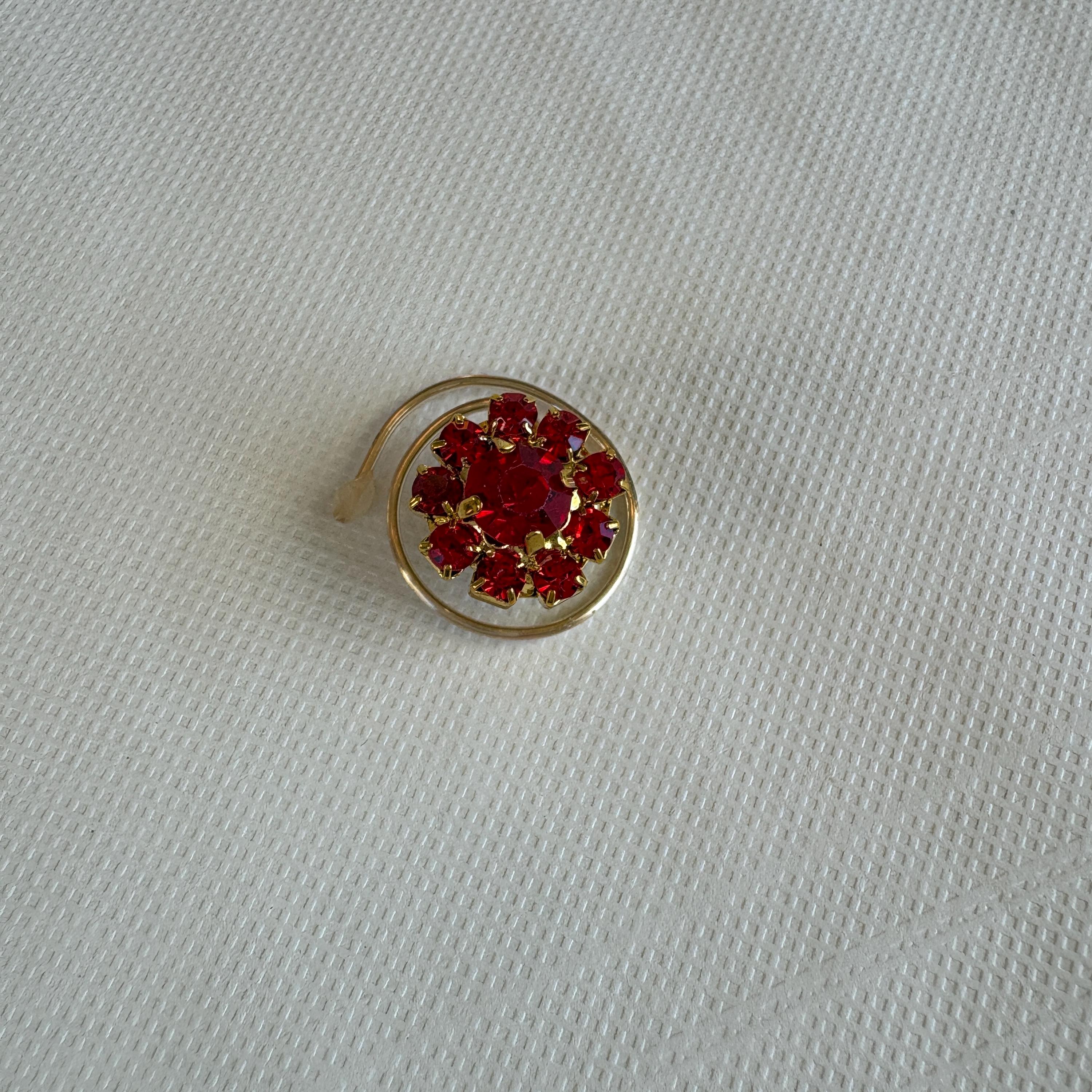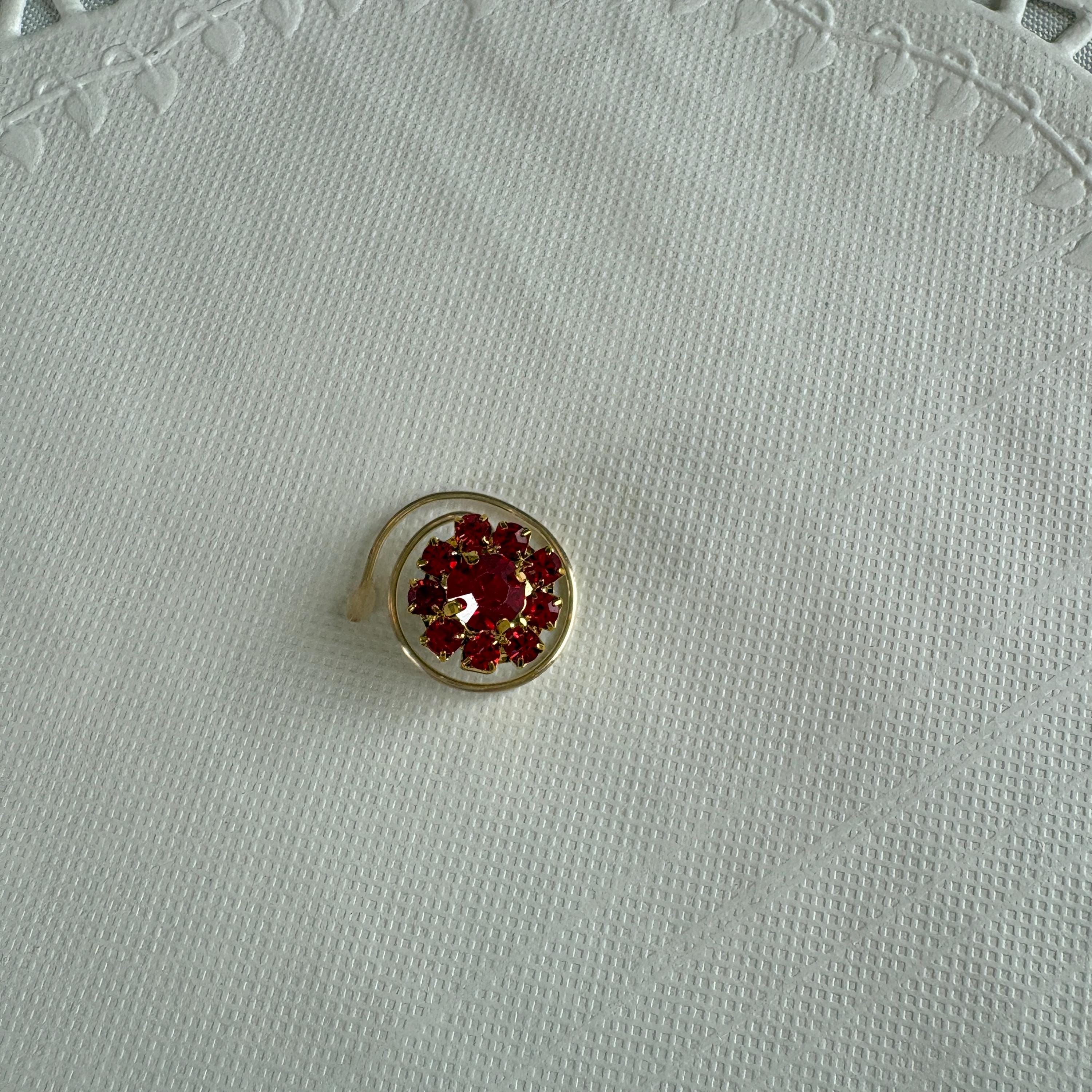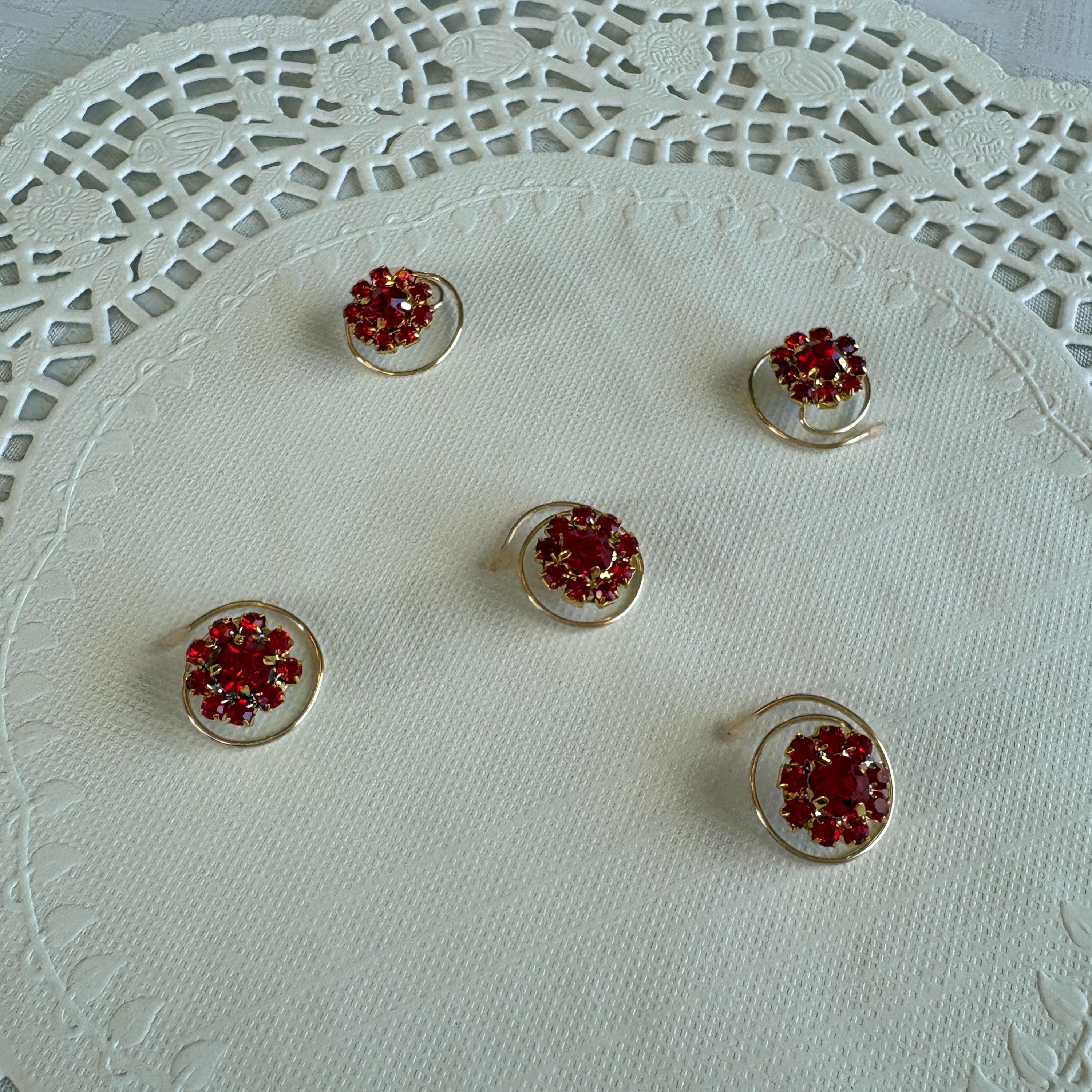 This listing is for a set of 5 Christmas Red Rhinestone Flower Hair Spins set in a gold tone setting. These are beautiful.