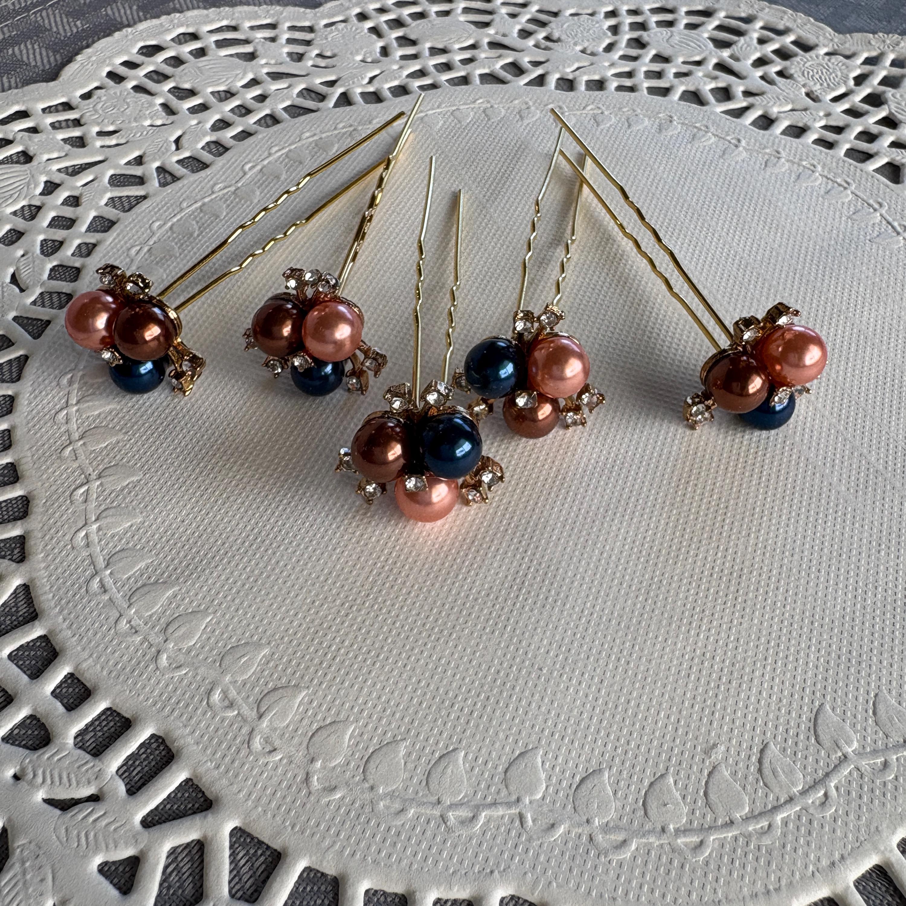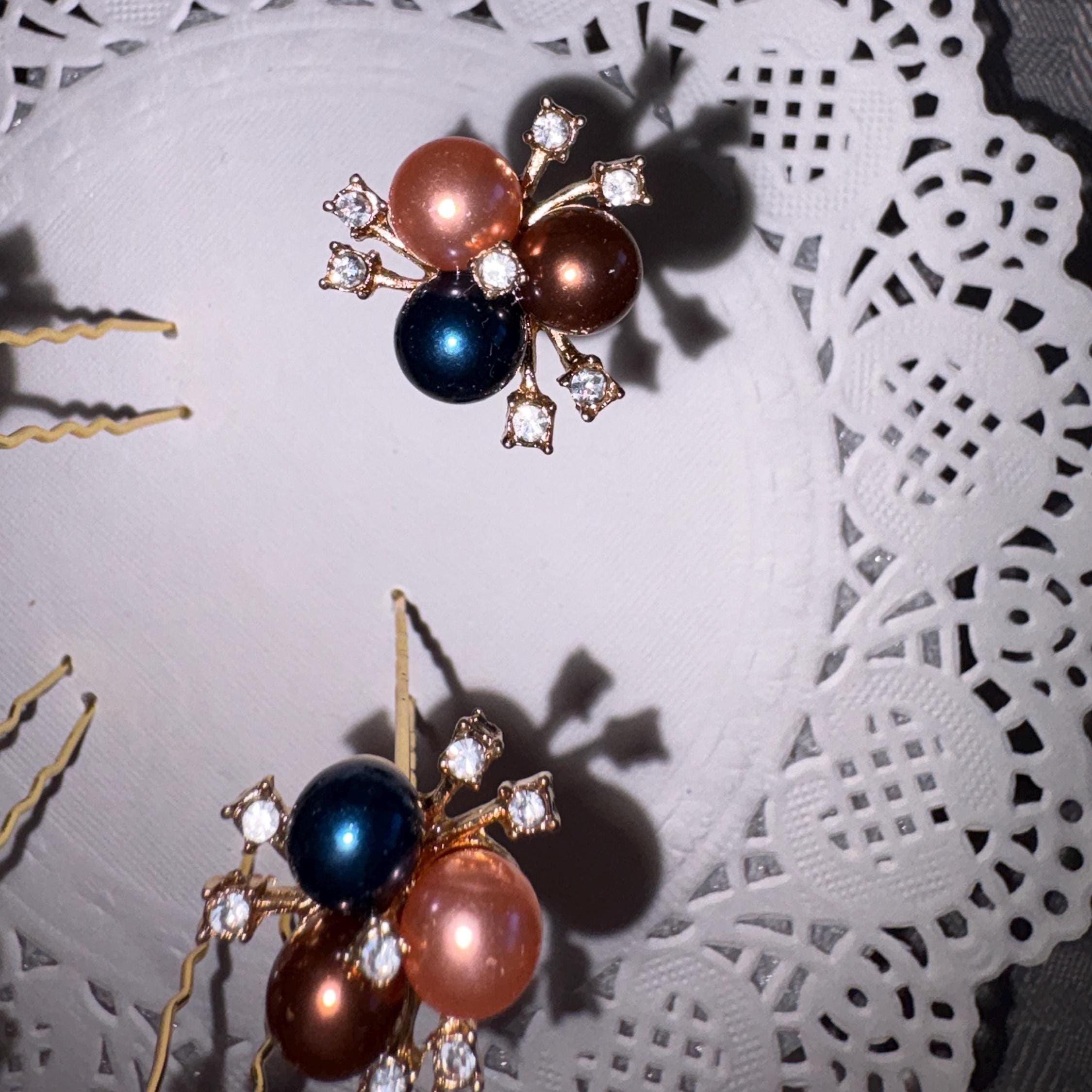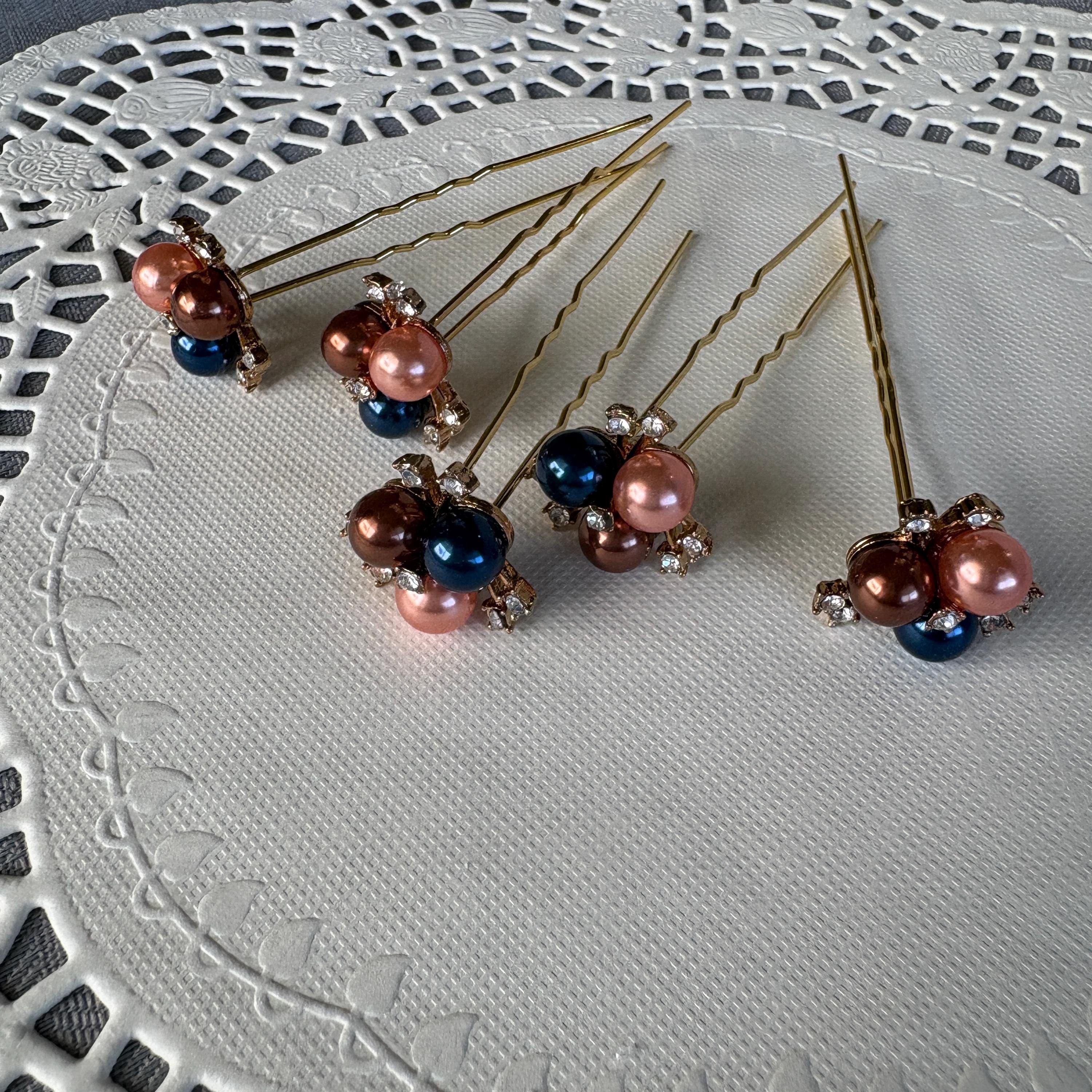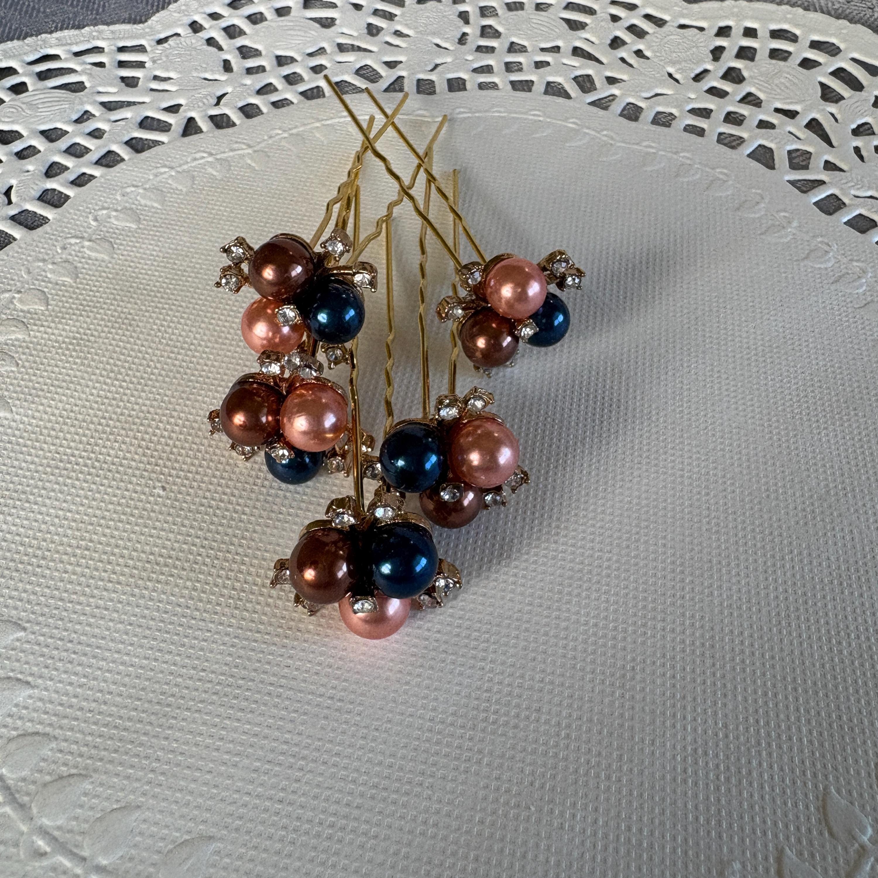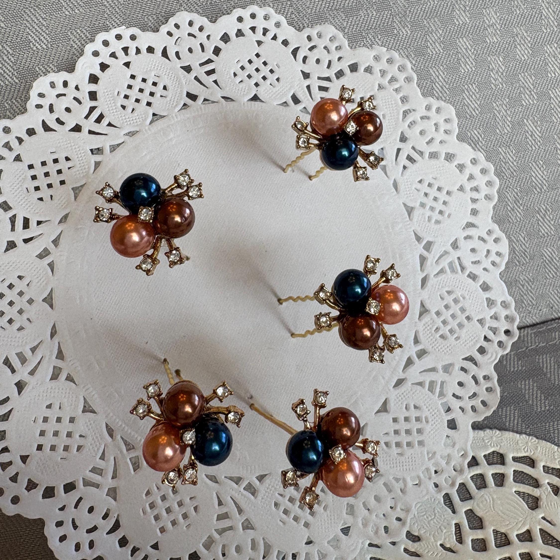 Set of five hair pins. A beautiful triad of pearls in Navy, Copper, and Gold surrounded by sparkling clear rhinestones and mounted on a gold tone hair pin.