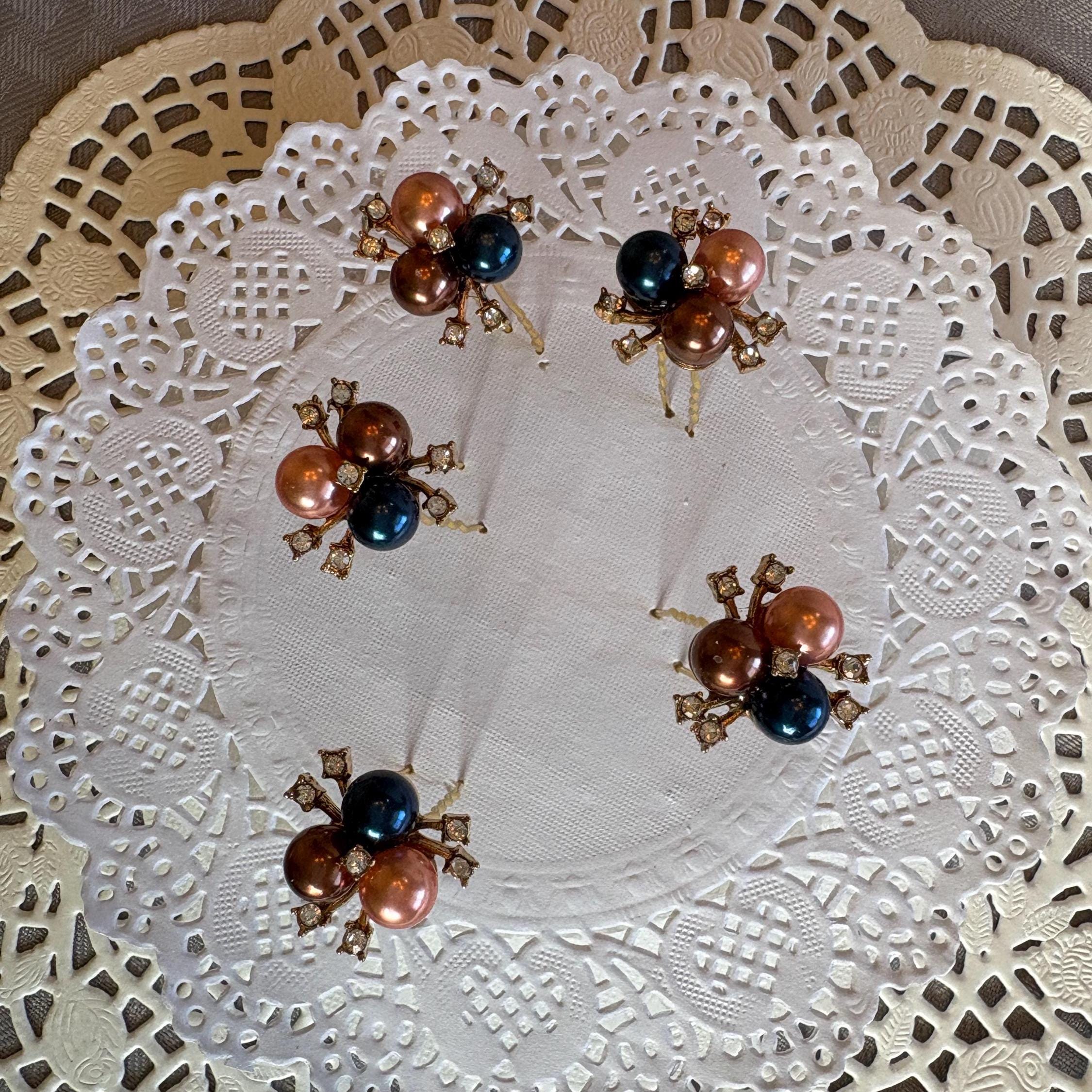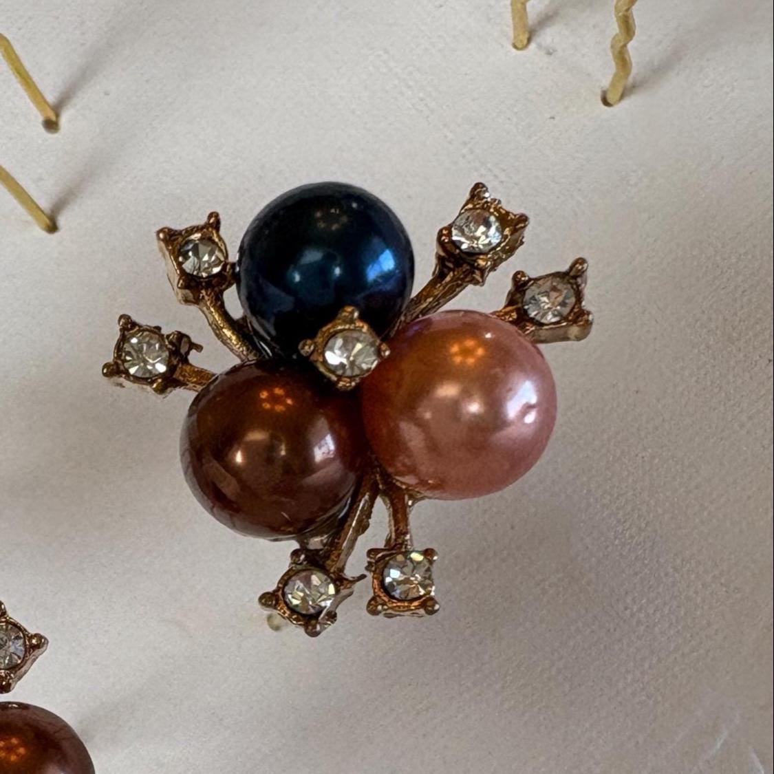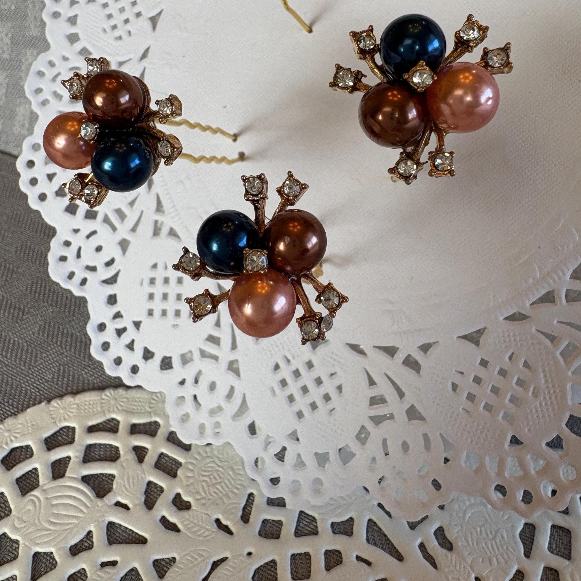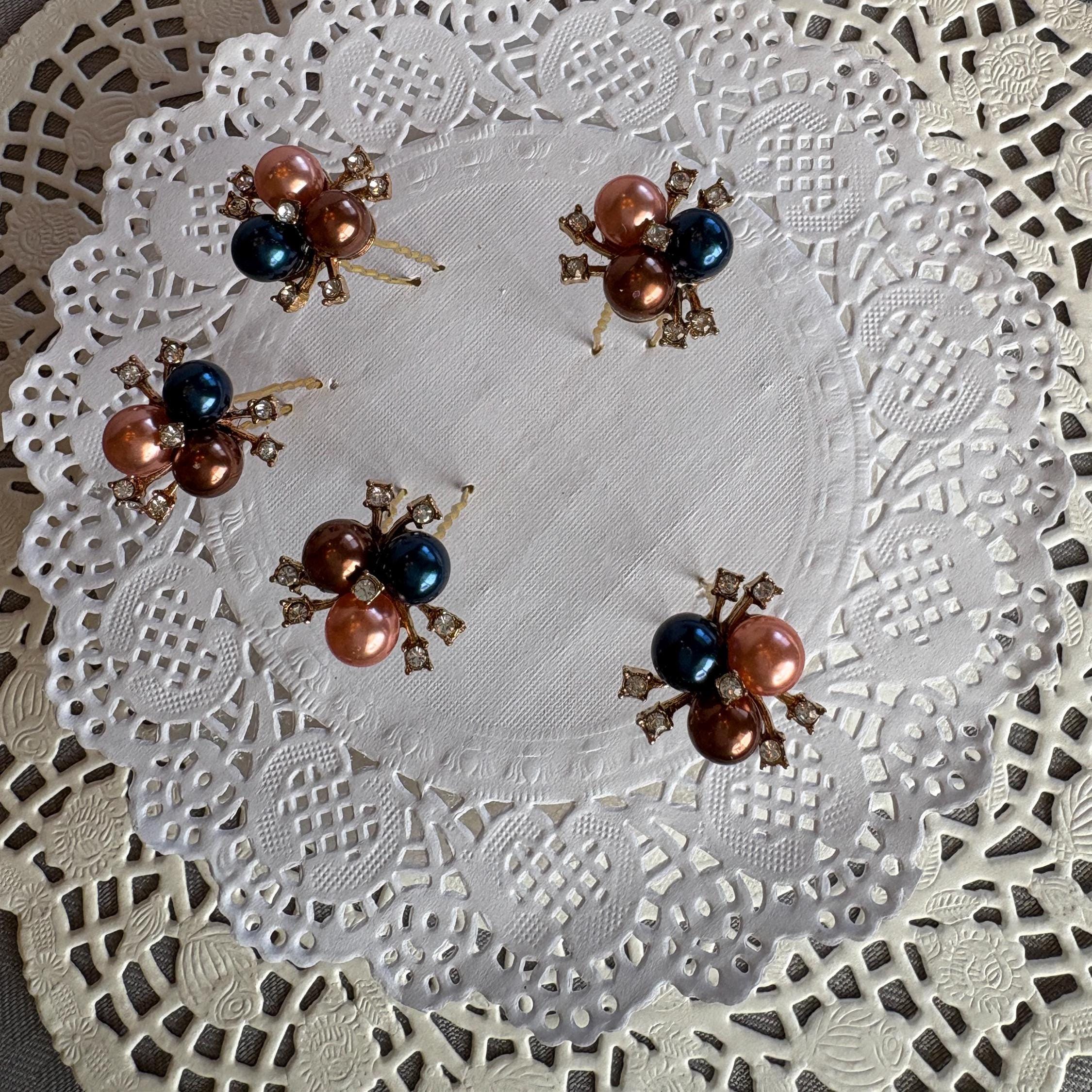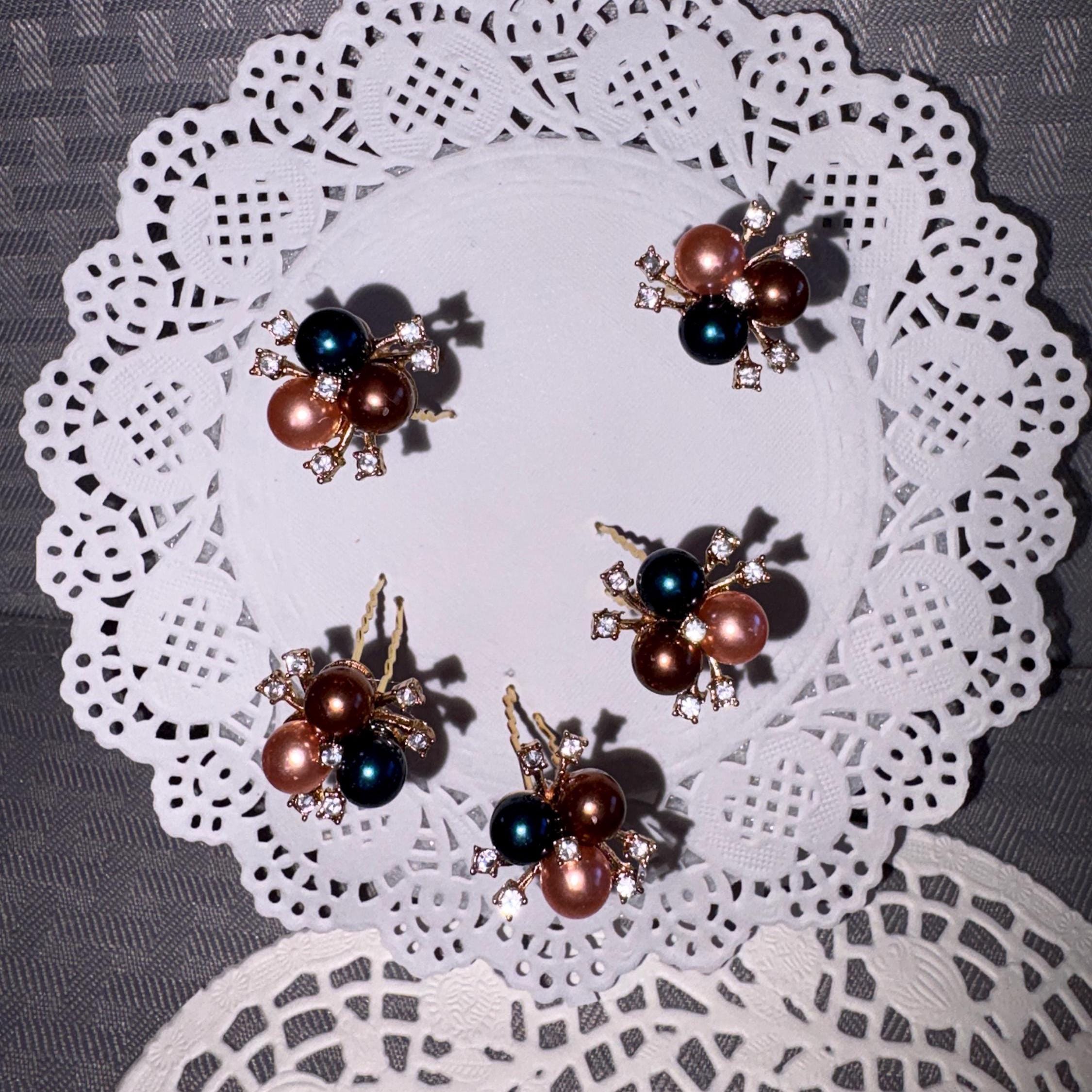 Set of five hair pins. A beautiful triad of pearls in Navy, Copper, and Gold surrounded by sparkling clear rhinestones and mounted on a gold tone hair pin.
