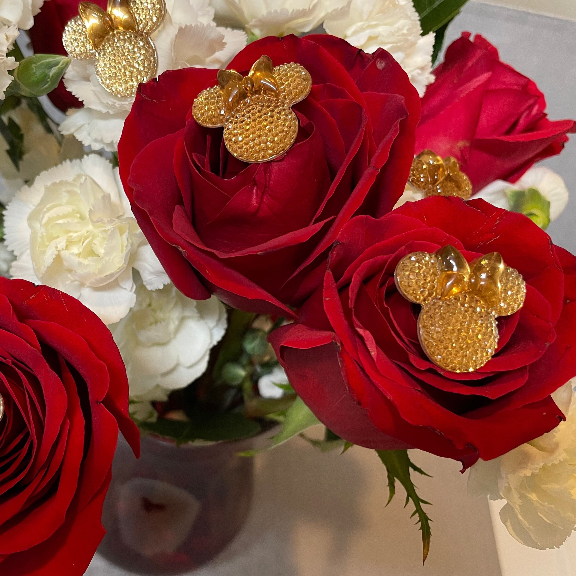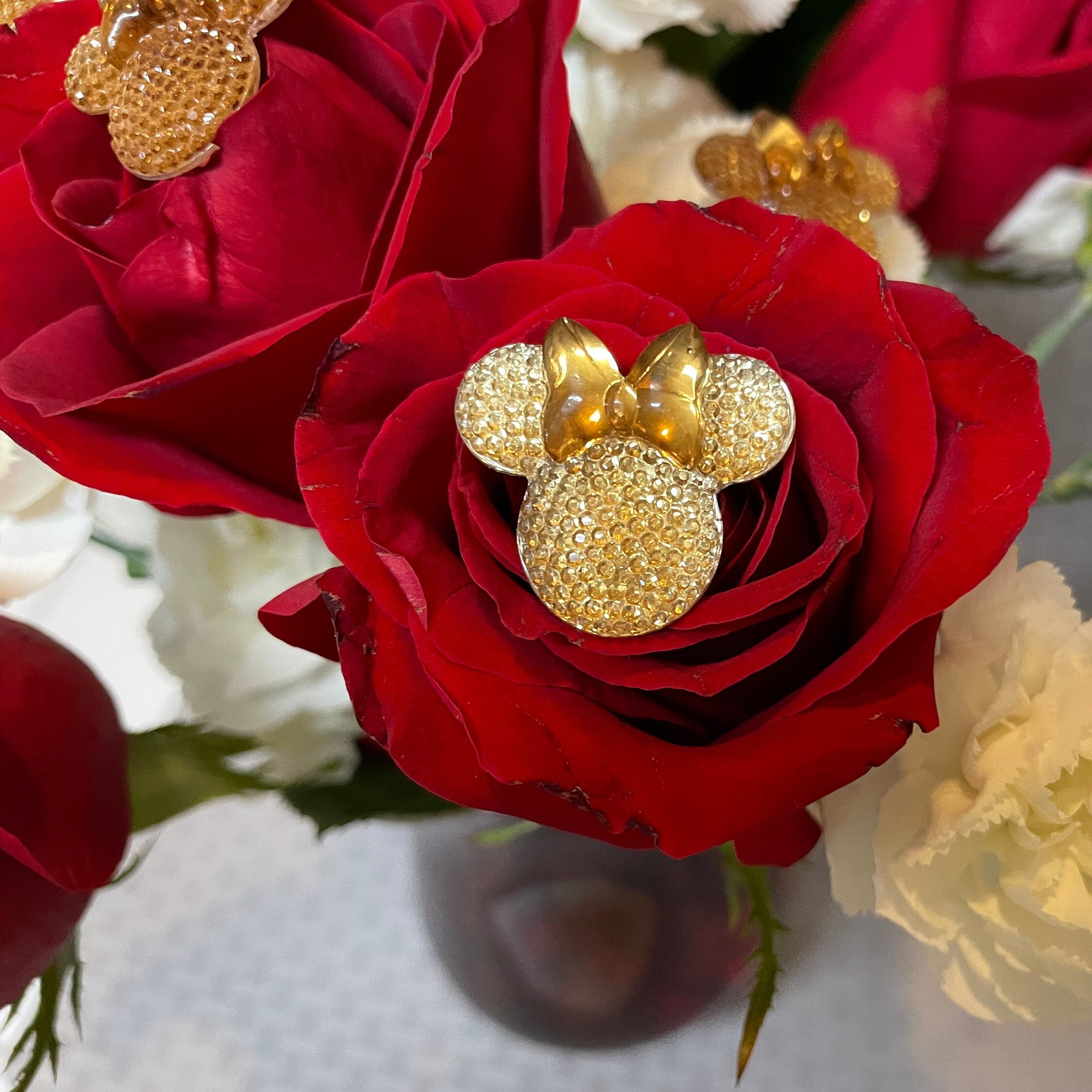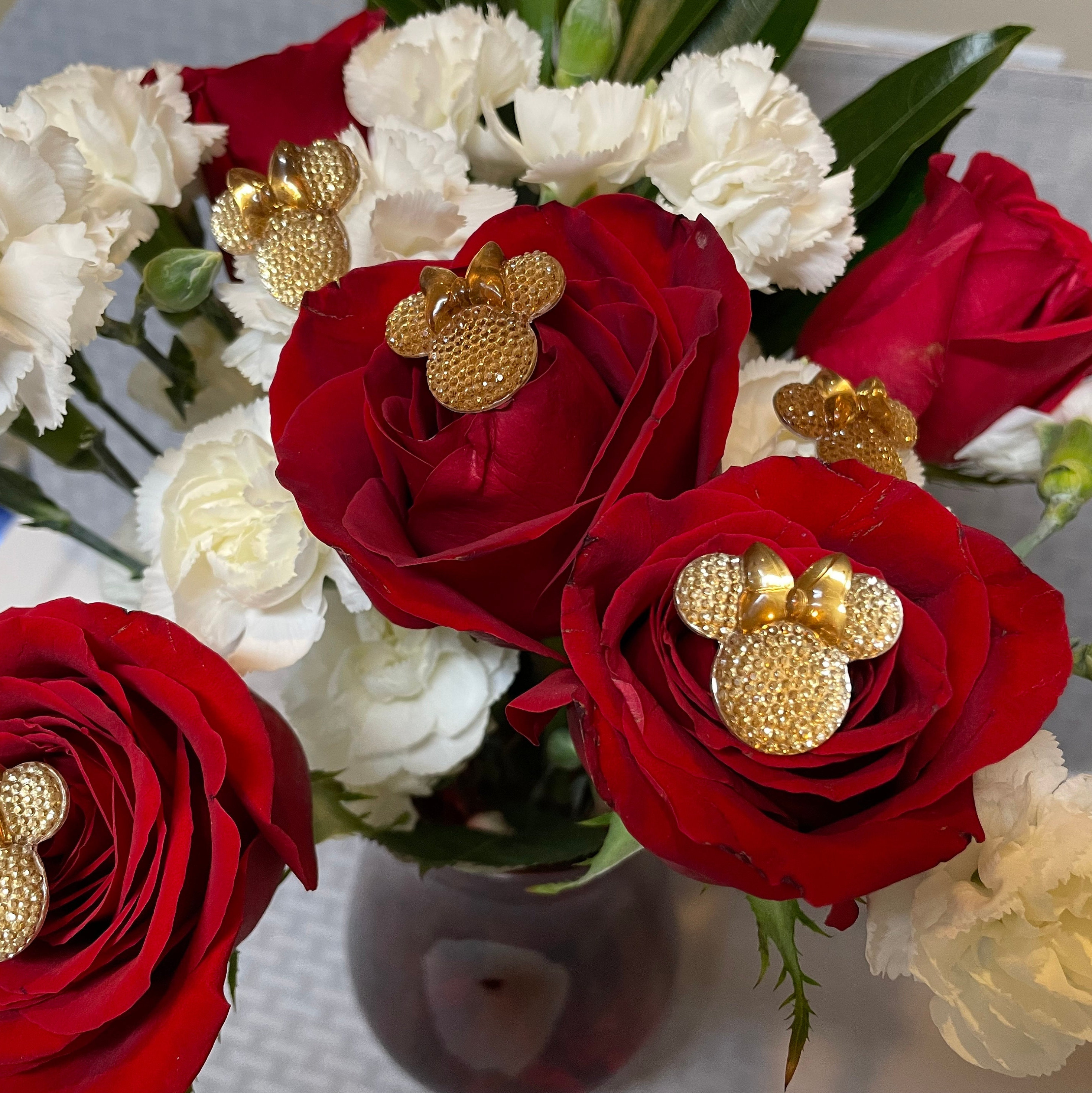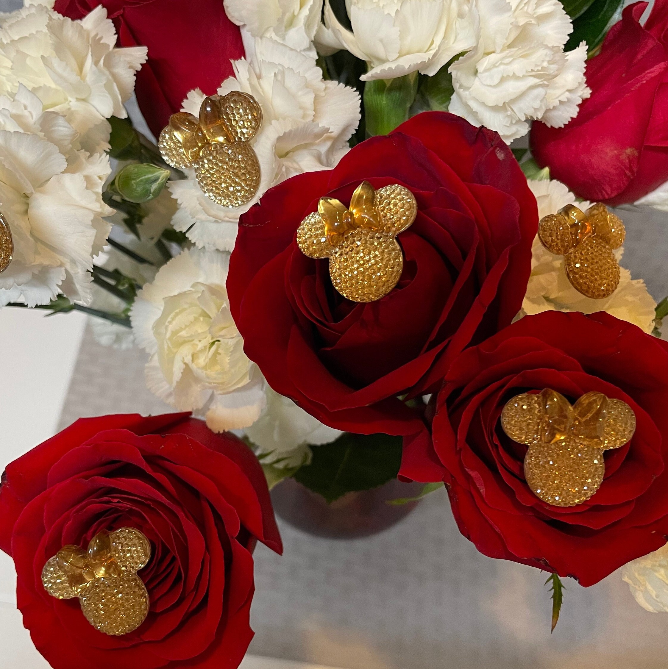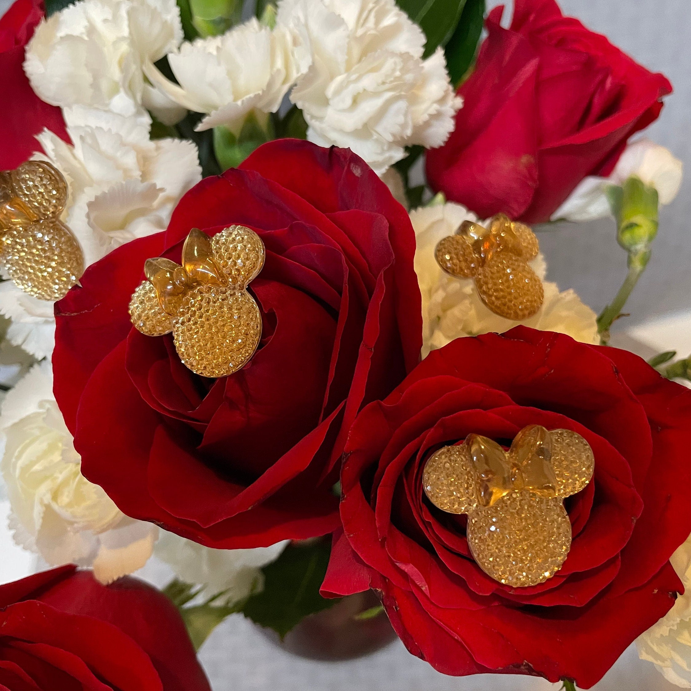 These cute Minnie Bouquet pins are larger than the Mickey pins but still look amazing in flowers. This listing is for 1 set of 6 Champagne Flower pins. More colors will be coming.