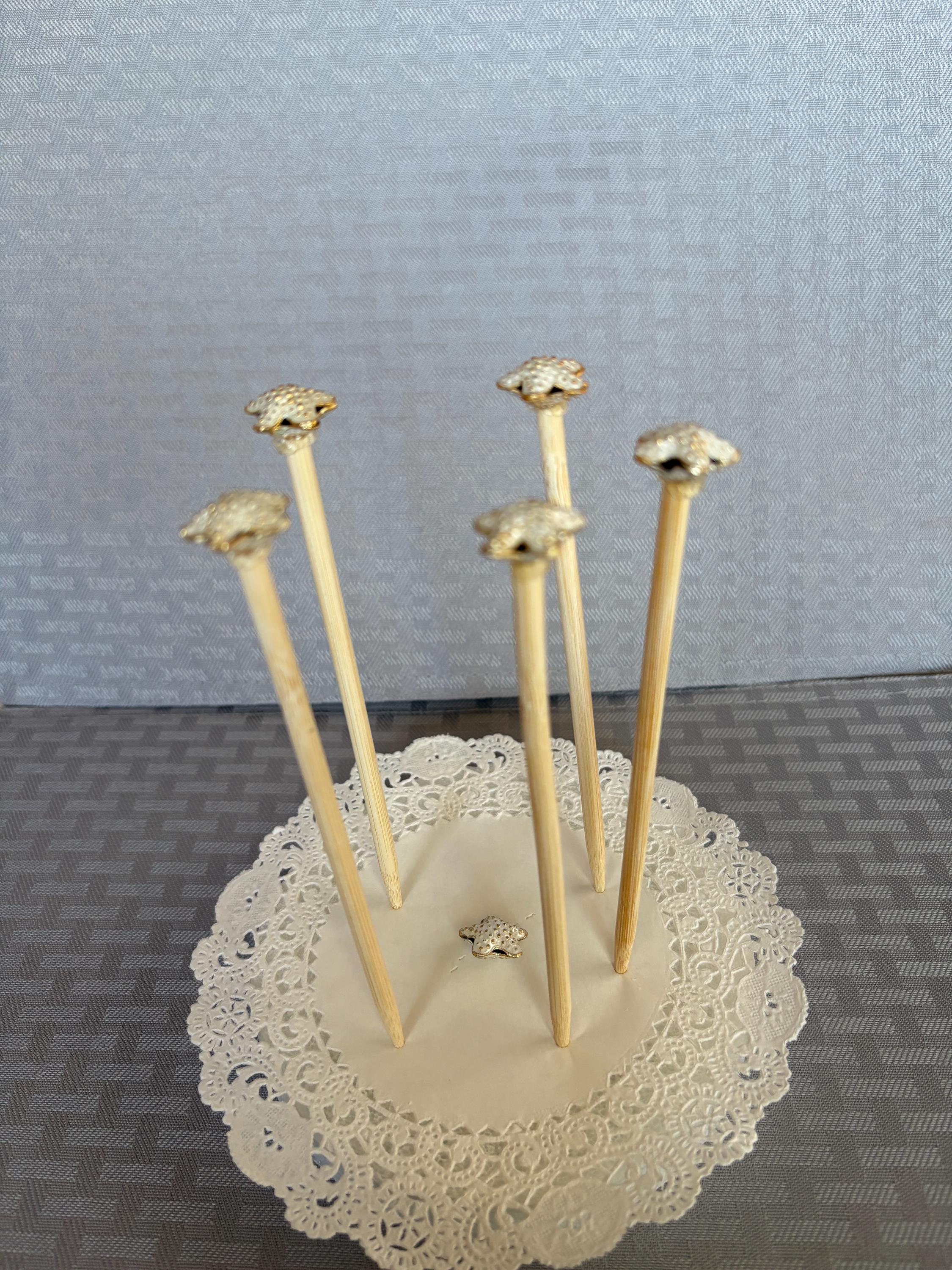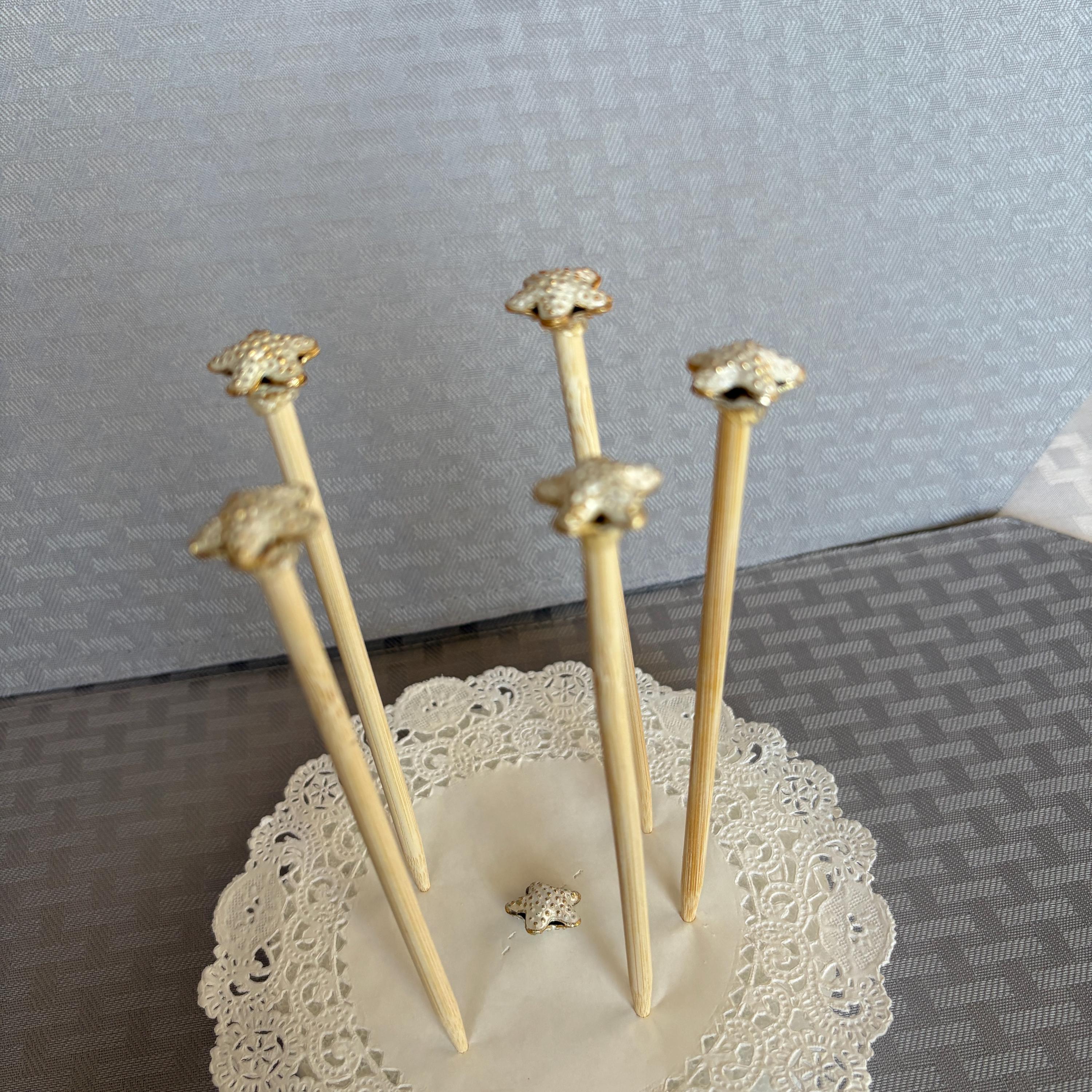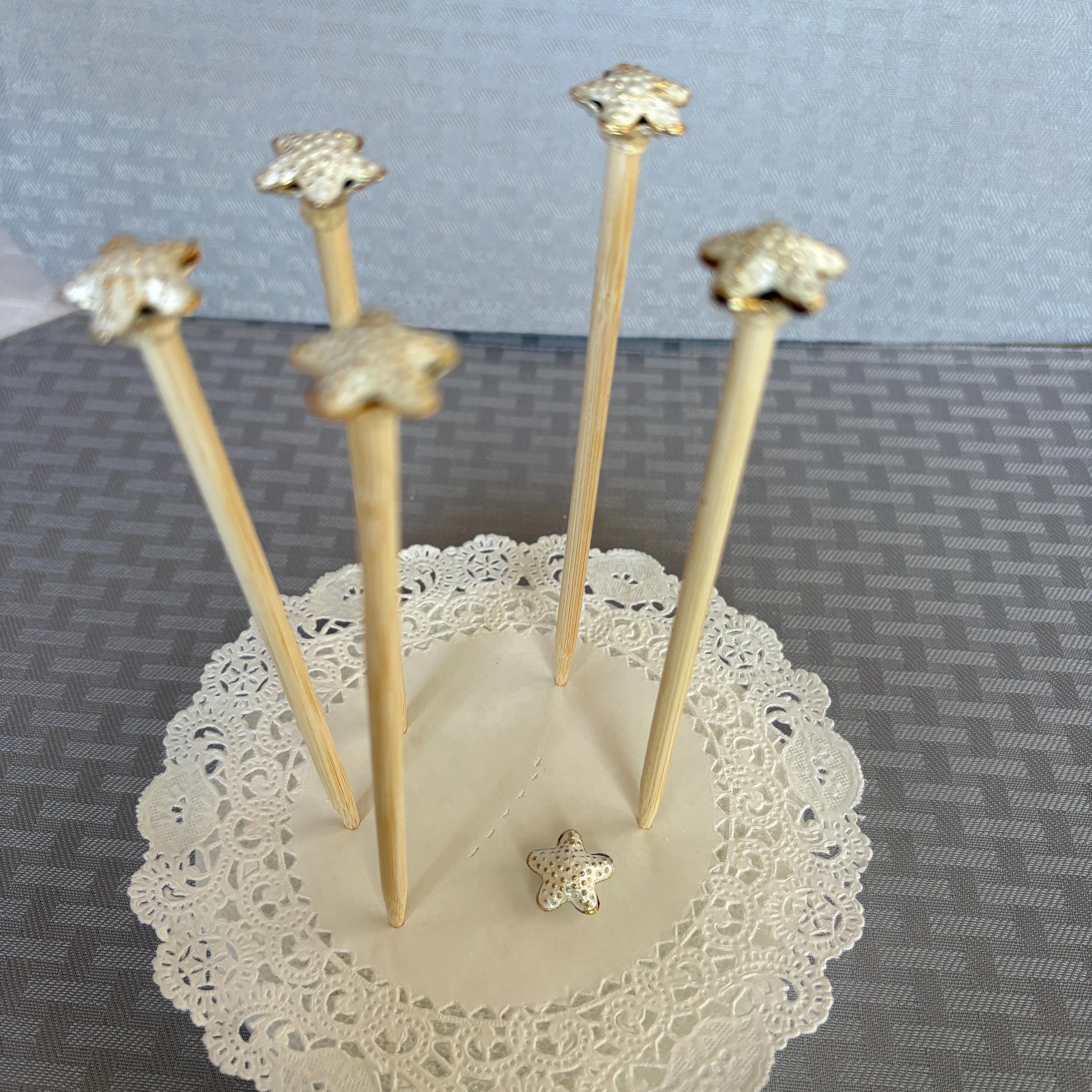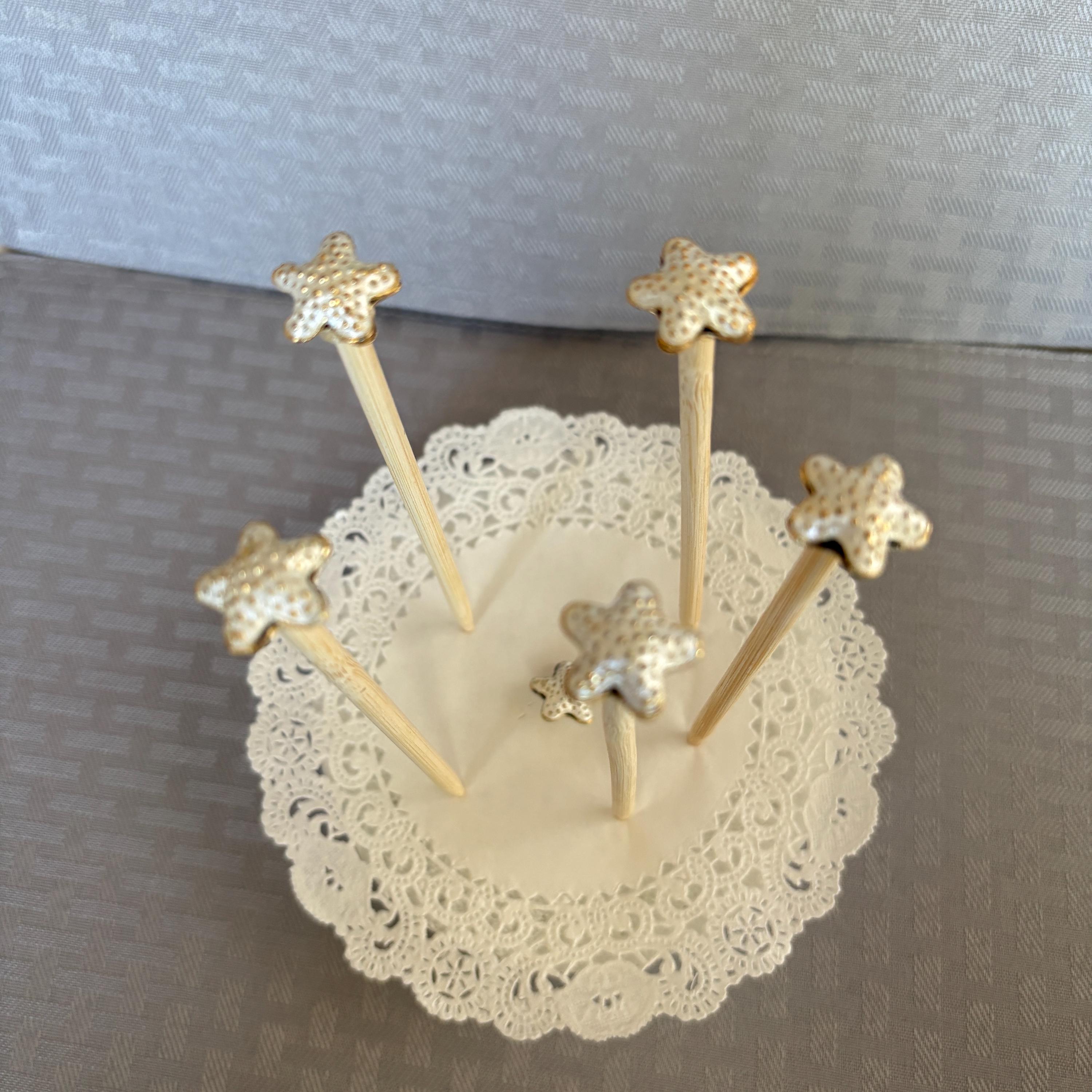 Starfish Decoration Picks for Centerpiece or Bouquets. Adorable white with gold tone raised up dots starfish mounted on a 6 inch stick to go between flowers. Set of 5. Each tiny starfish is about 1/2 inch across.