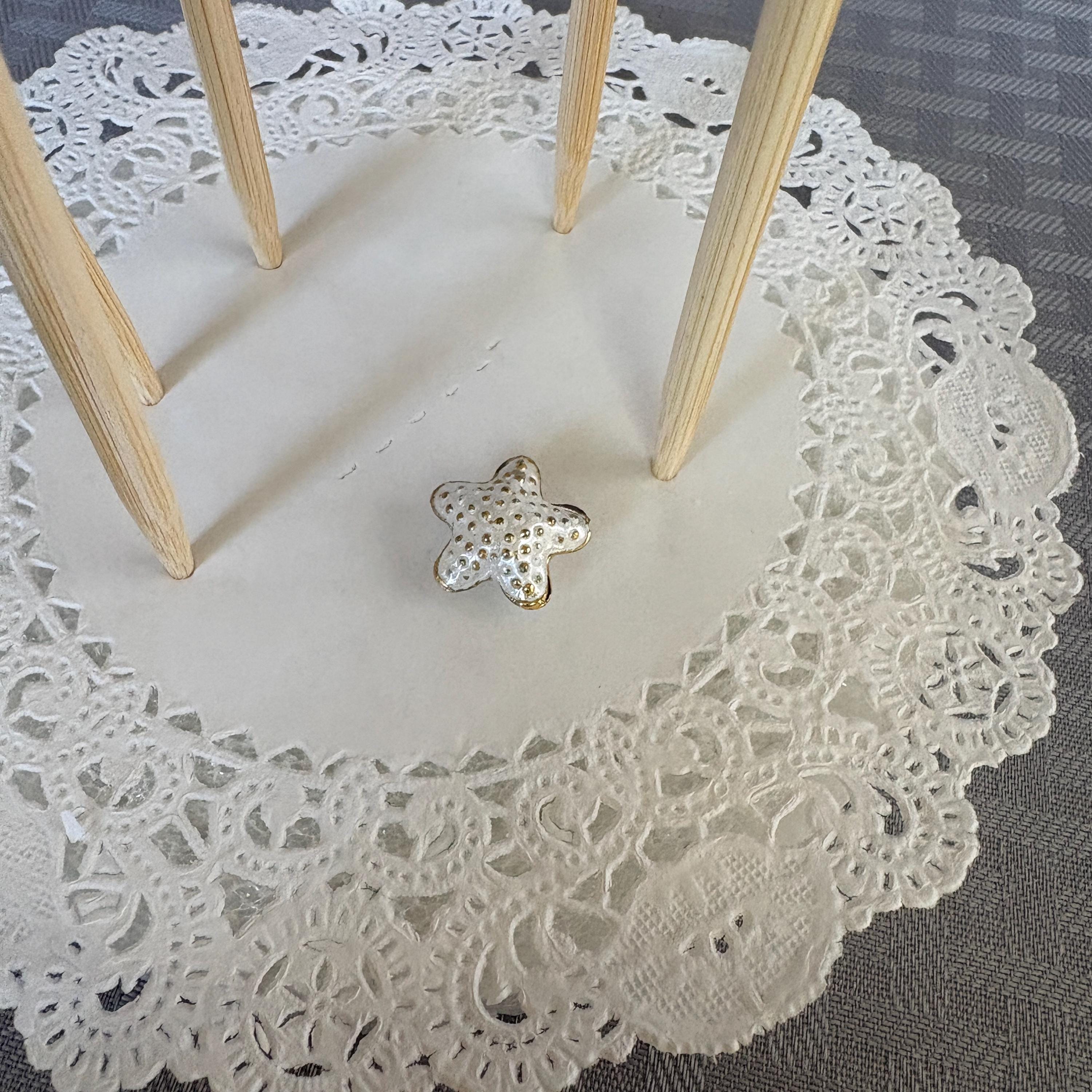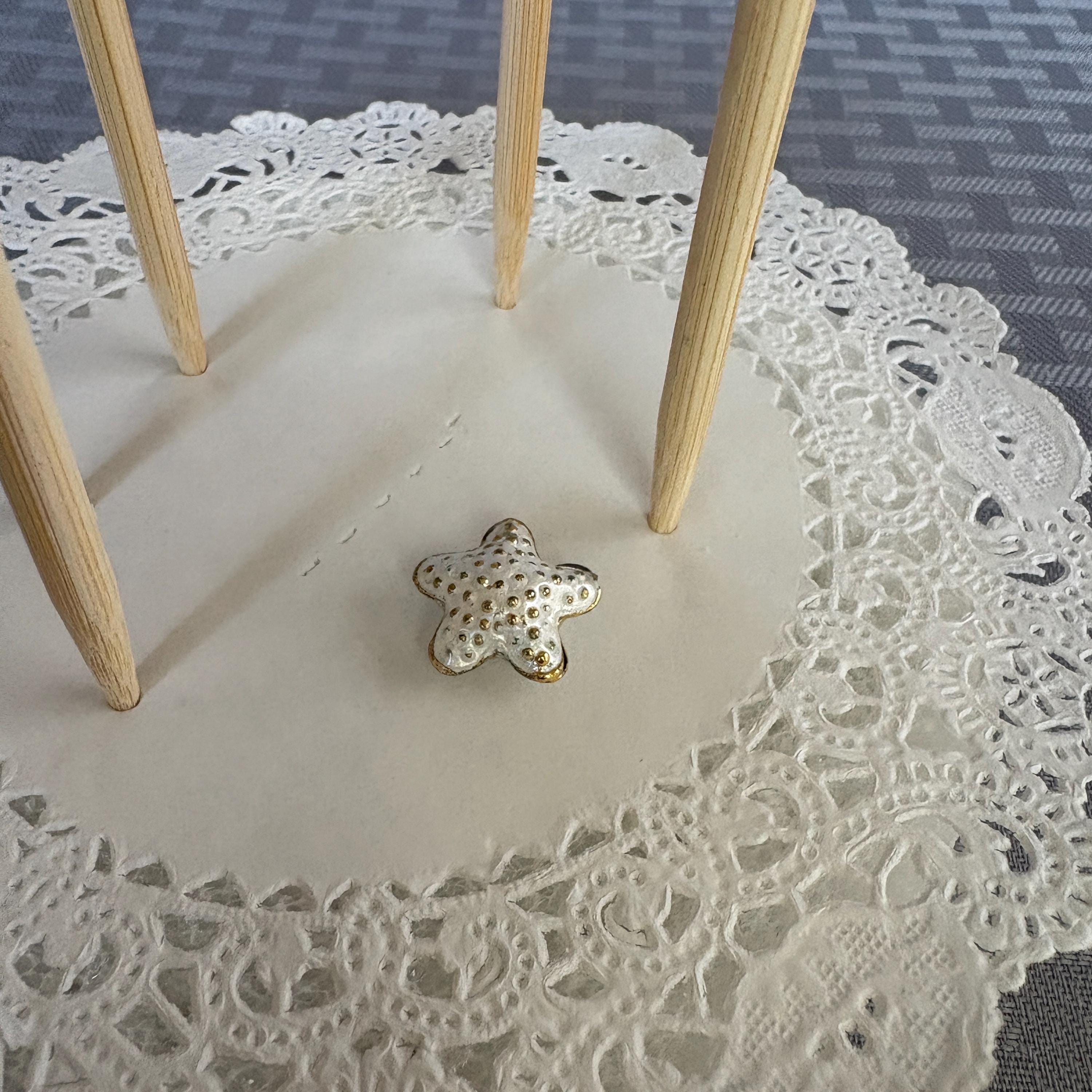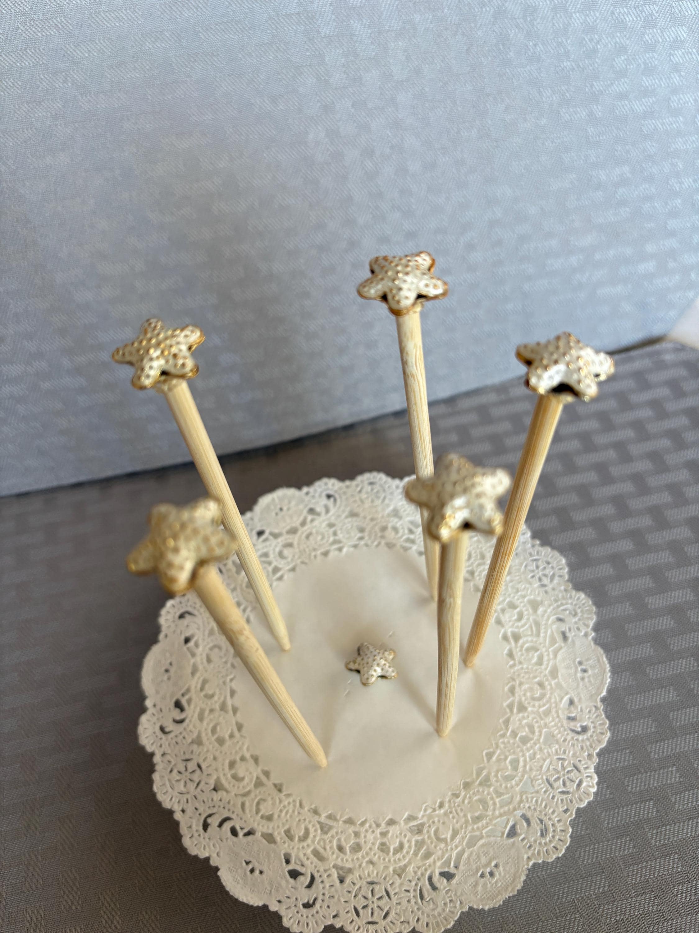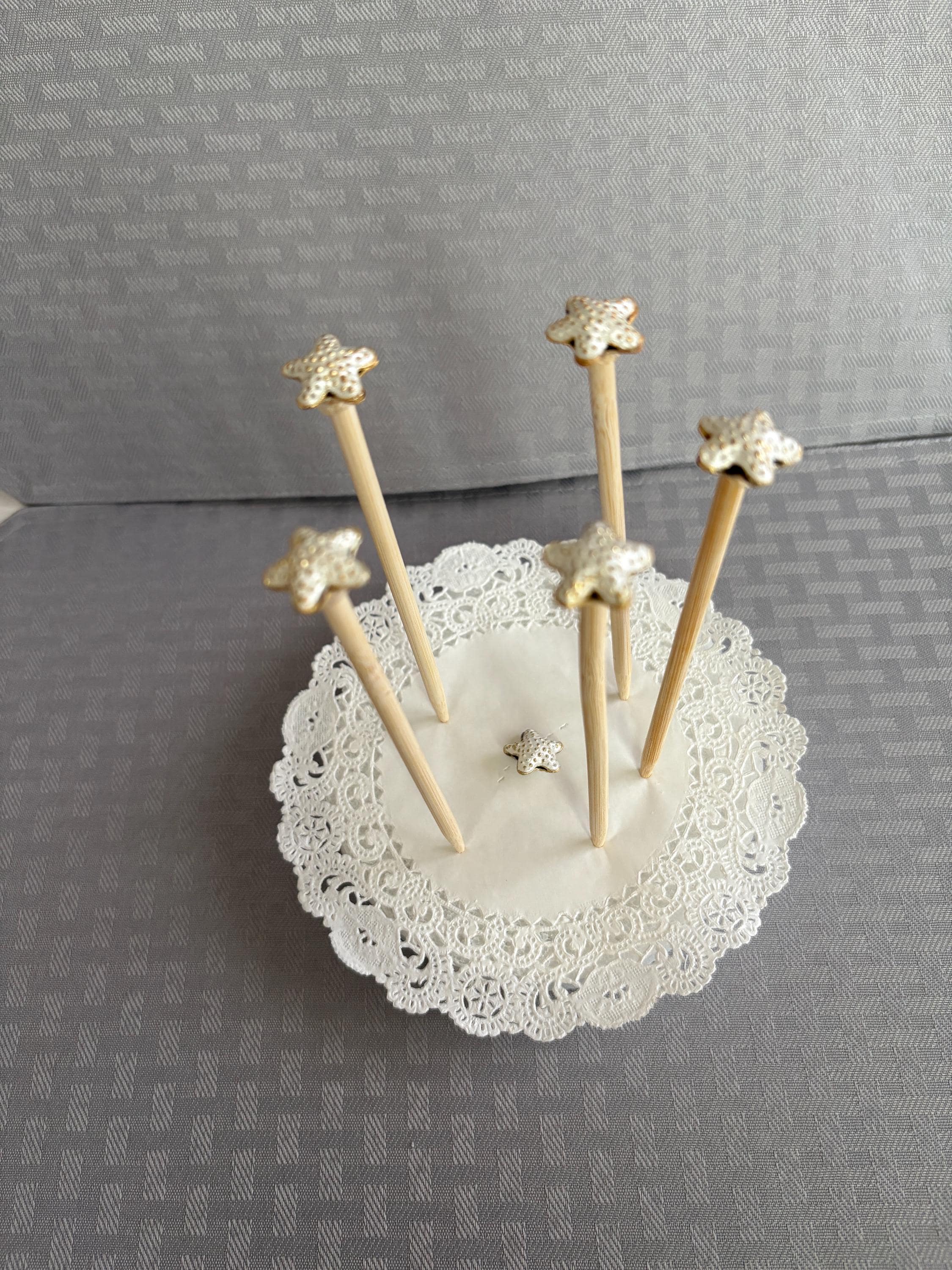 Starfish Decoration Picks for Centerpiece or Bouquets. Adorable white with gold tone raised up dots starfish mounted on a 6 inch stick to go between flowers. Set of 5. Each tiny starfish is about 1/2 inch across.