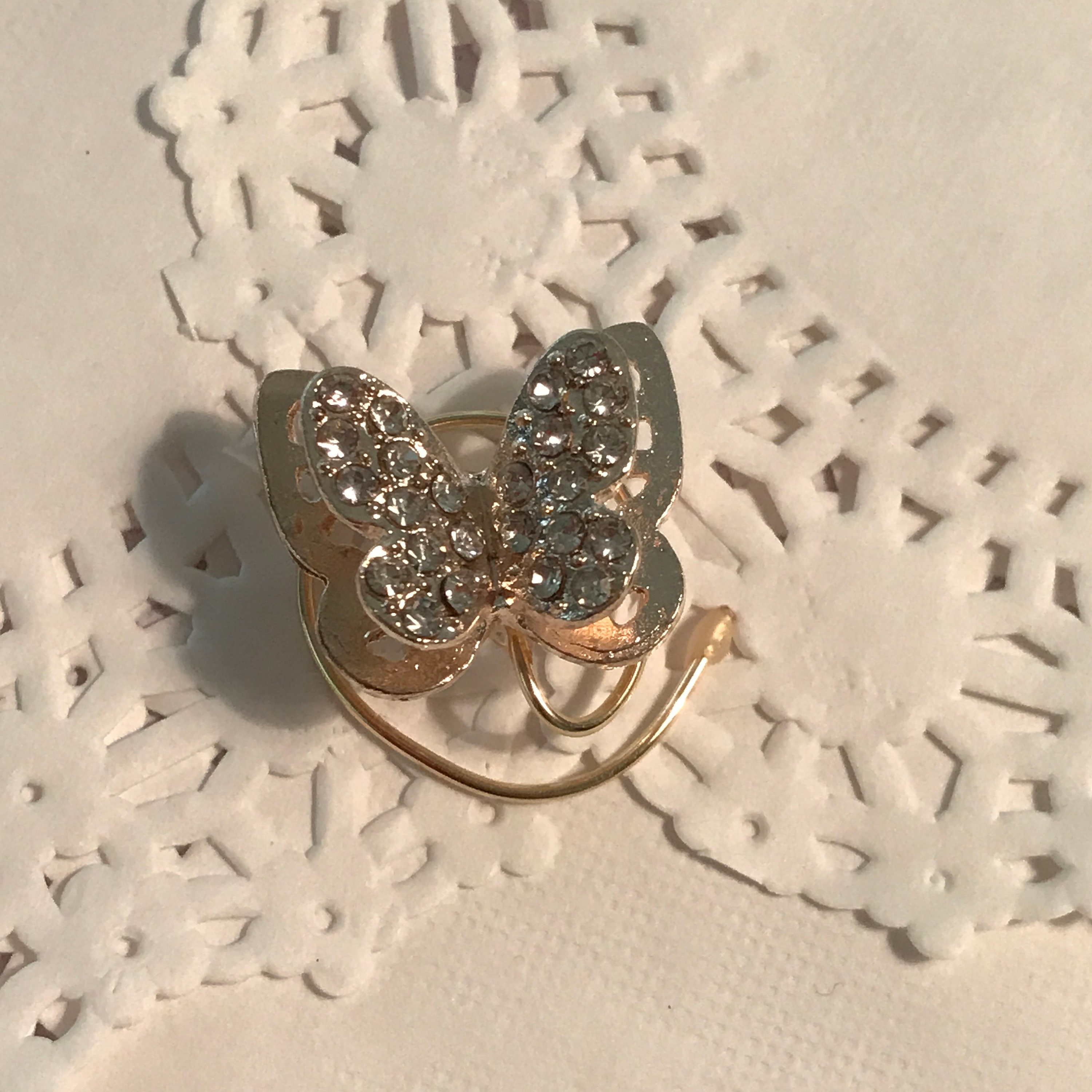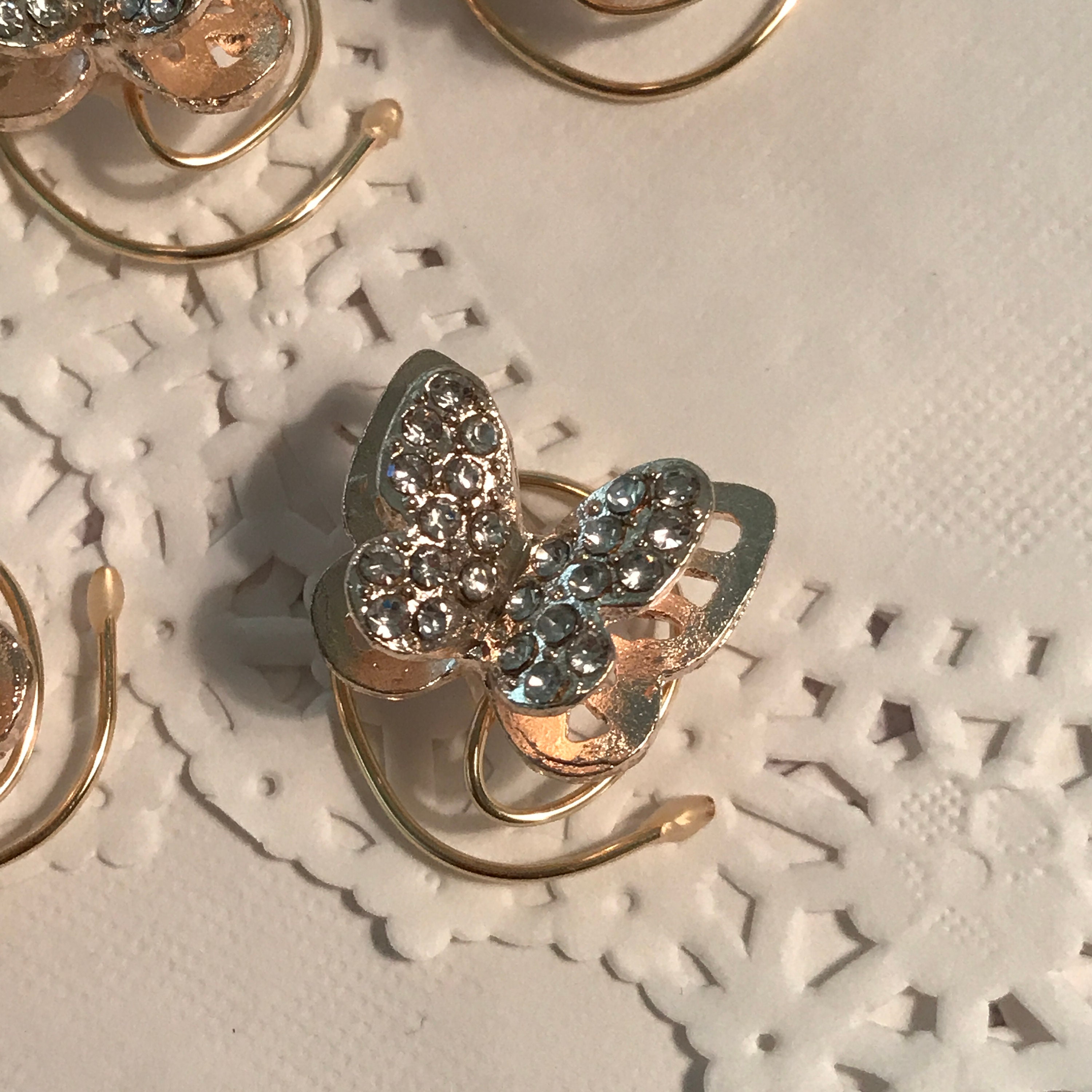 Three-Dimensional Butterfly and studded with lots of clear rhinestones in a rose gold setting. It each outside butterfly is 3/4 of an inch or 20mm in size. The inside studded rhinestone butterfly is 1/2 inch or about 15mm in size. They do look lots bigger in the pictures.
