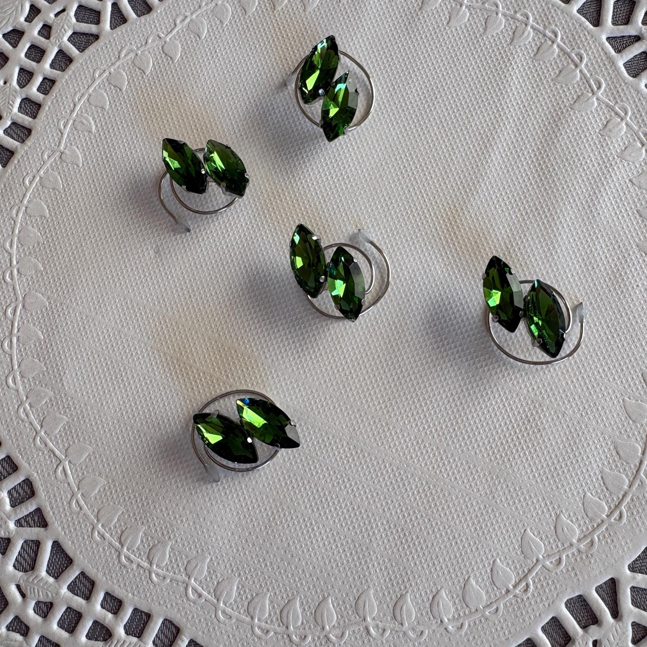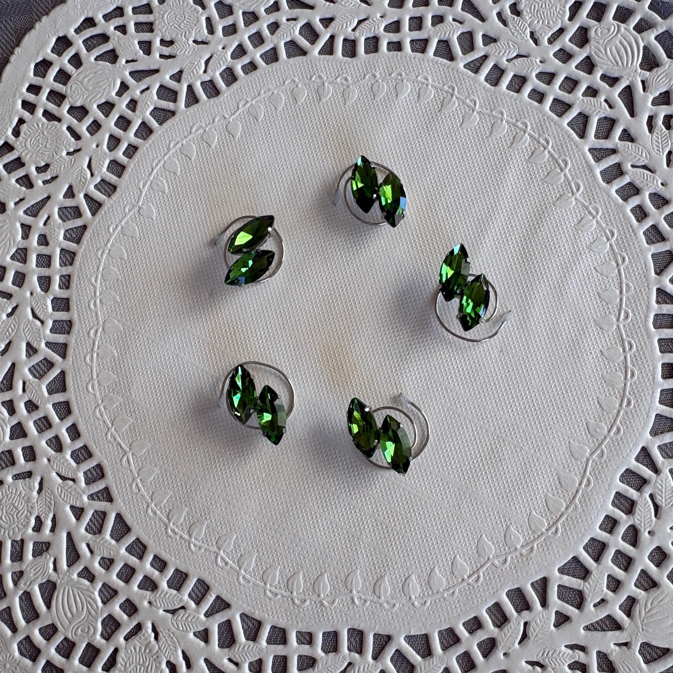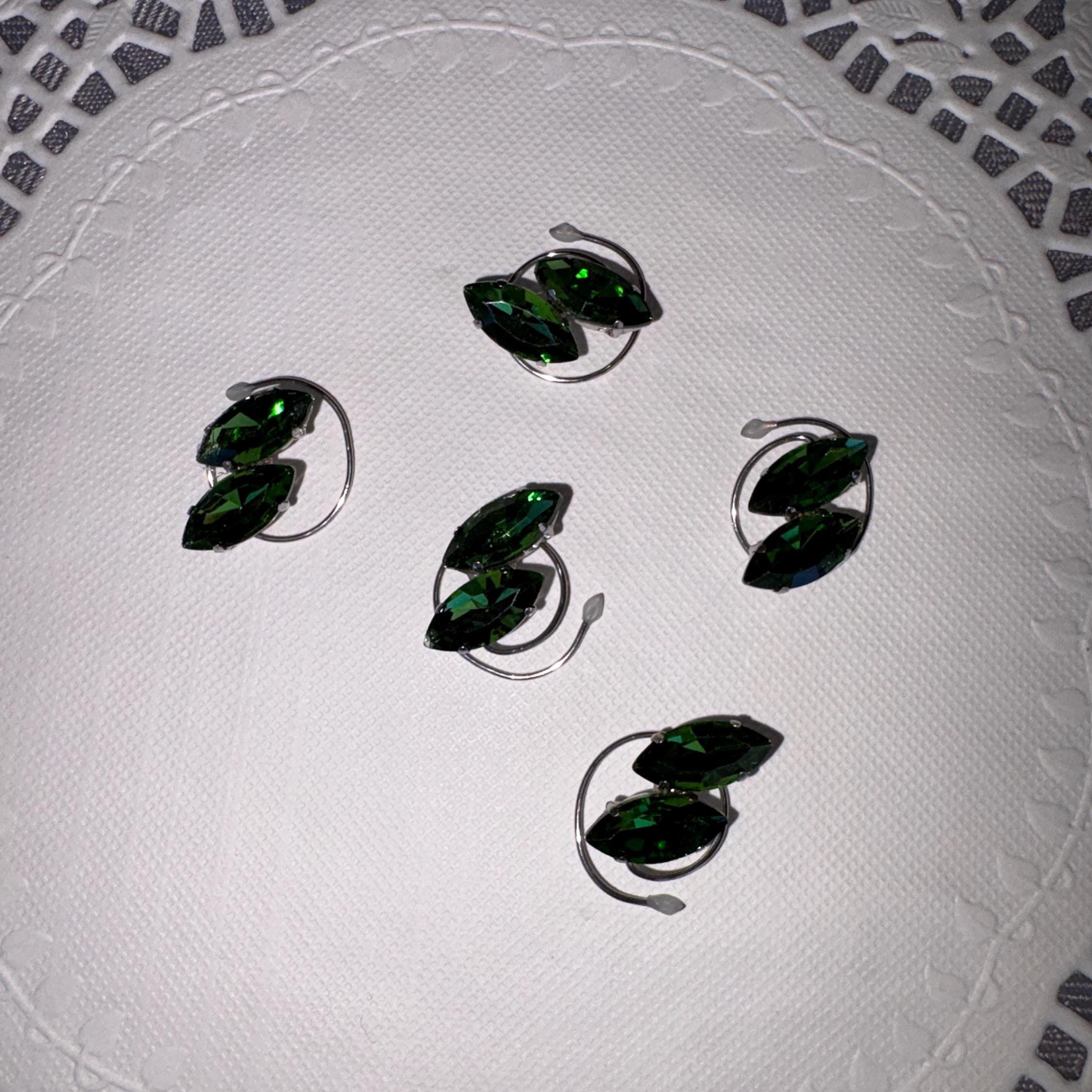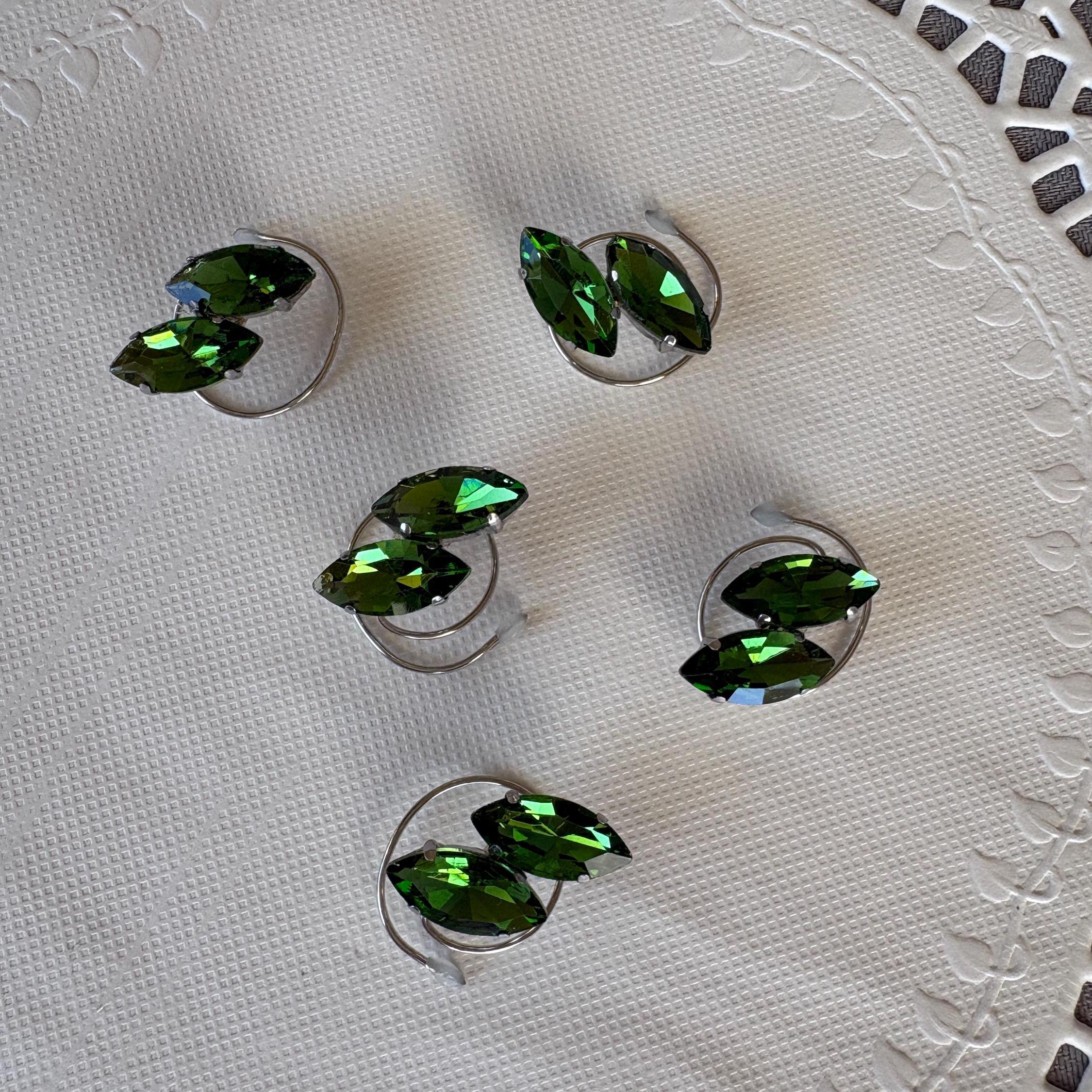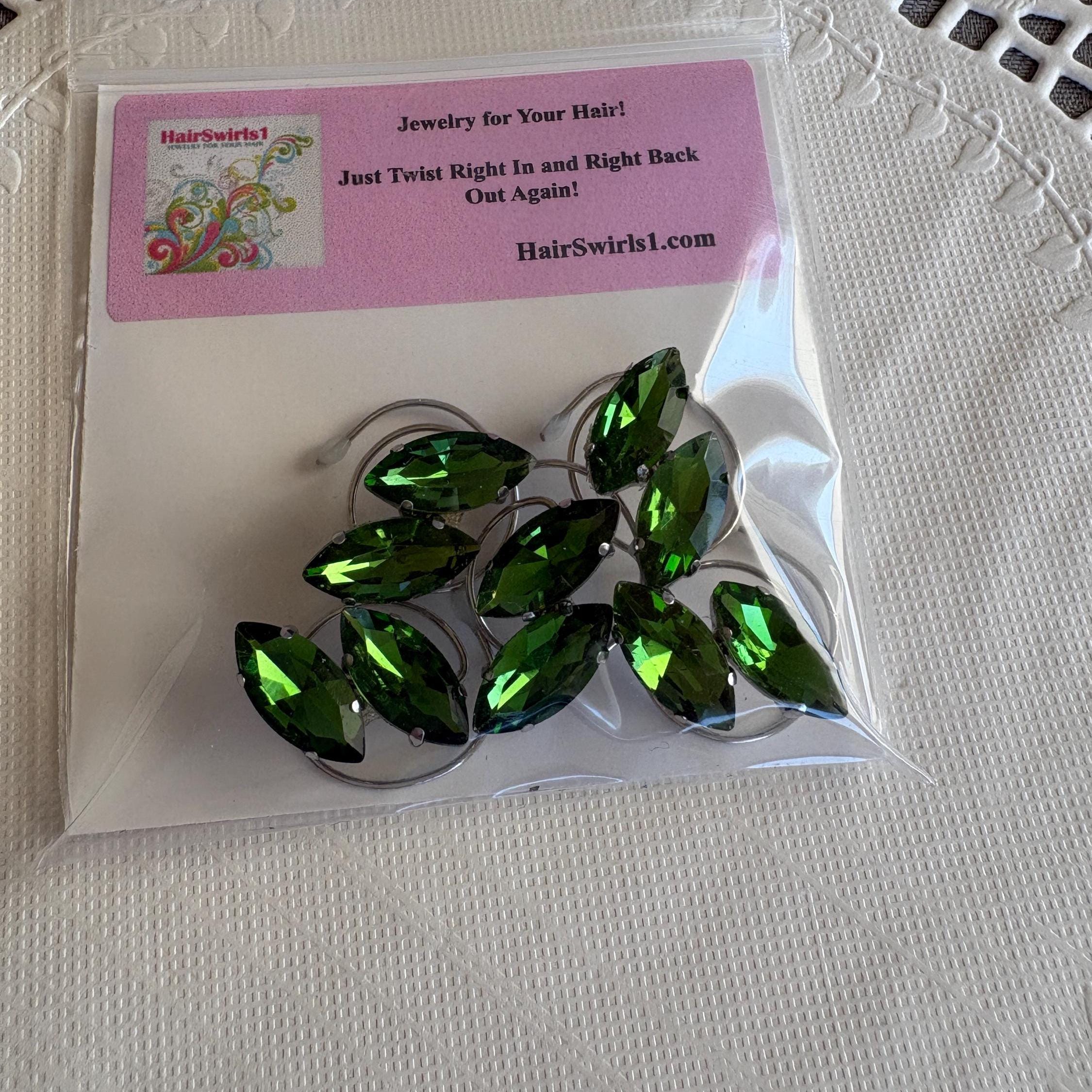 These Double Navette shaped emerald green hair swirls would be the perfect hair accessory to match your favorite costume. The double navette hair coils can also adorn the hair of a debutante girl or pageant contestant. Perfect for New Year's Eve as well or just a night out on the town.