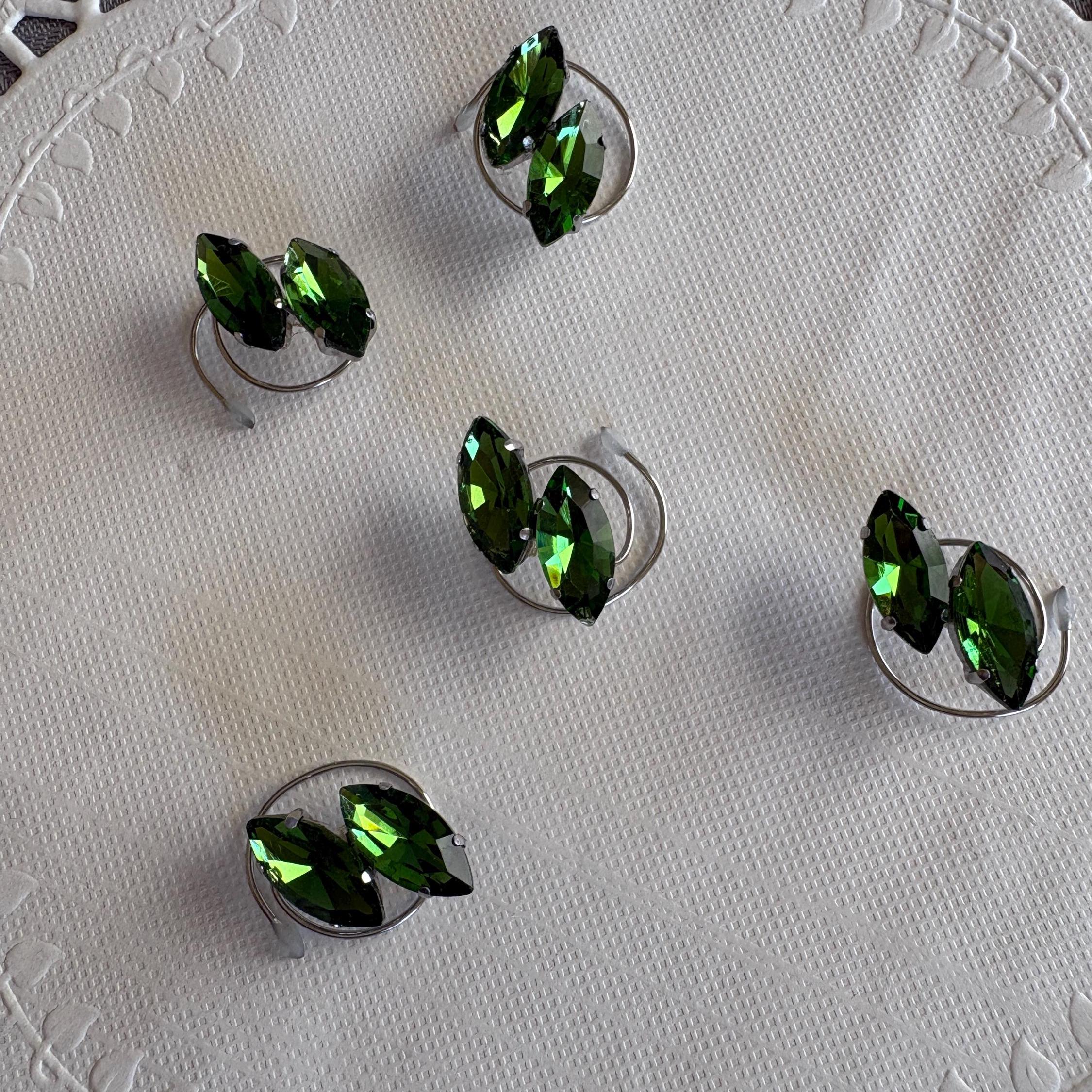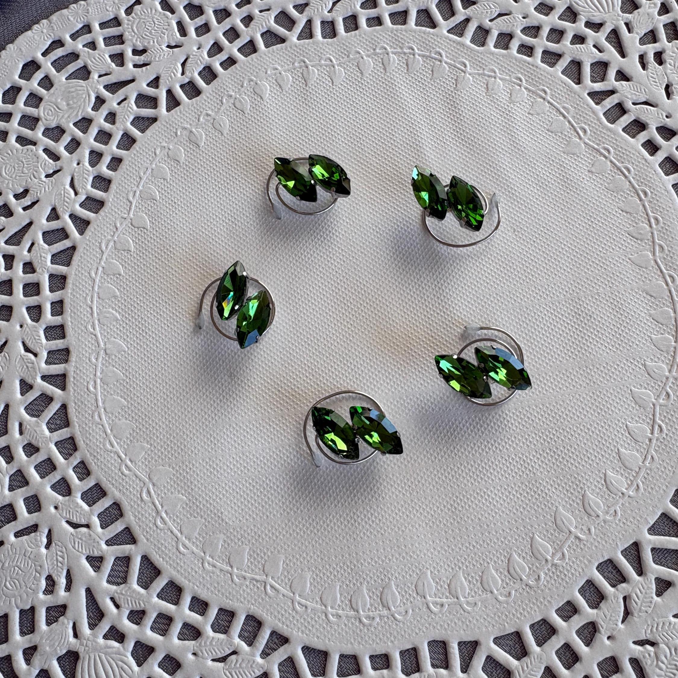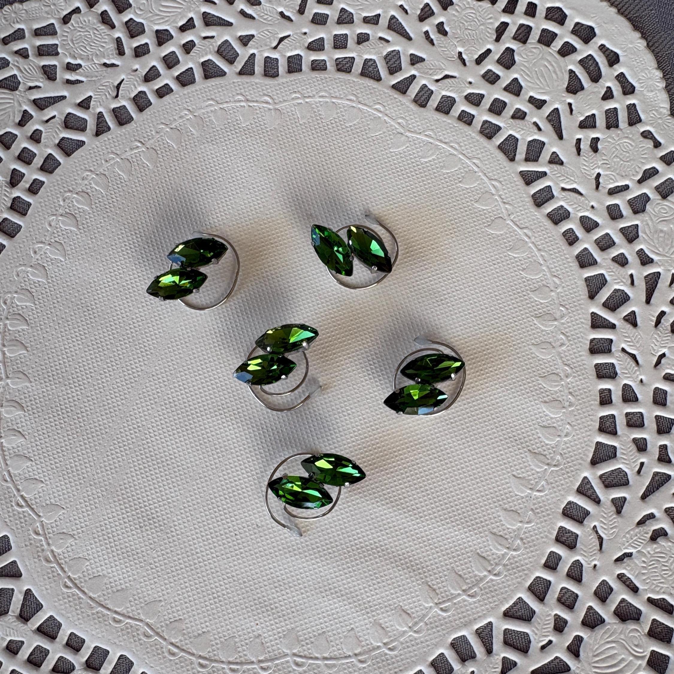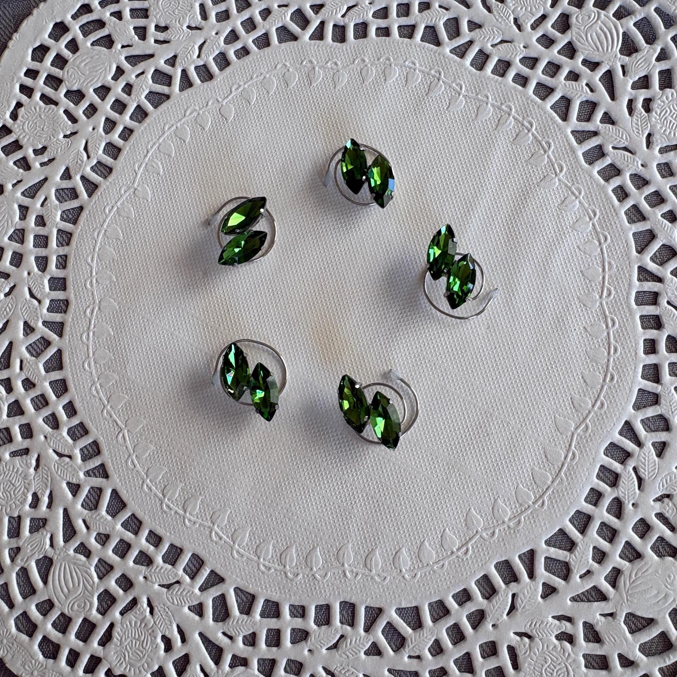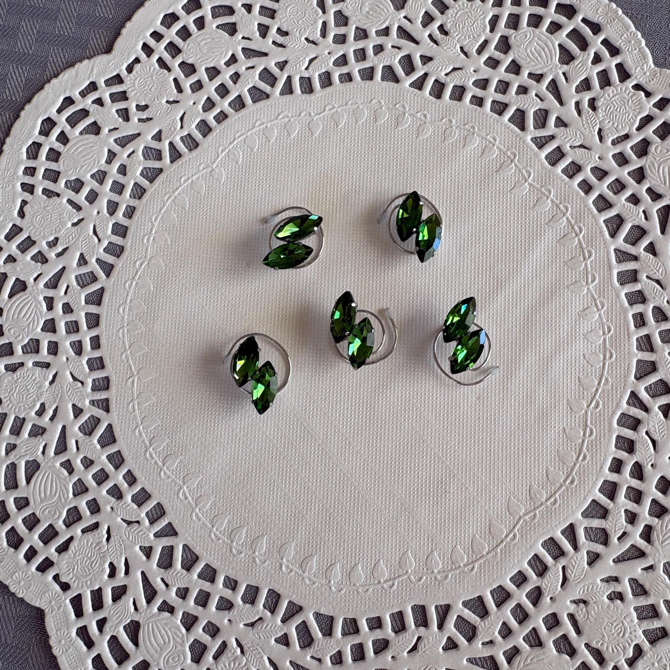 These Double Navette shaped emerald green hair swirls would be the perfect hair accessory to match your favorite costume. The double navette hair coils can also adorn the hair of a debutante girl or pageant contestant. Perfect for New Year's Eve as well or just a night out on the town.