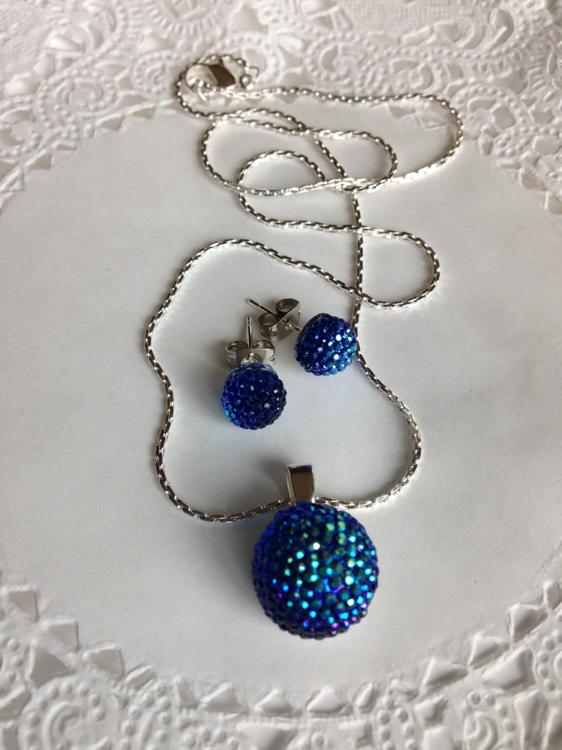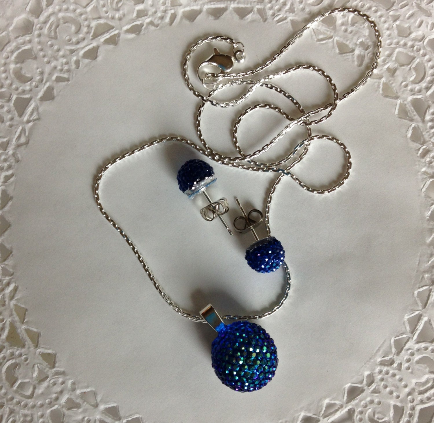 The necklace pendant is 14mm in size. The earrings are each 8mm in size. They both have a brilliant shine.