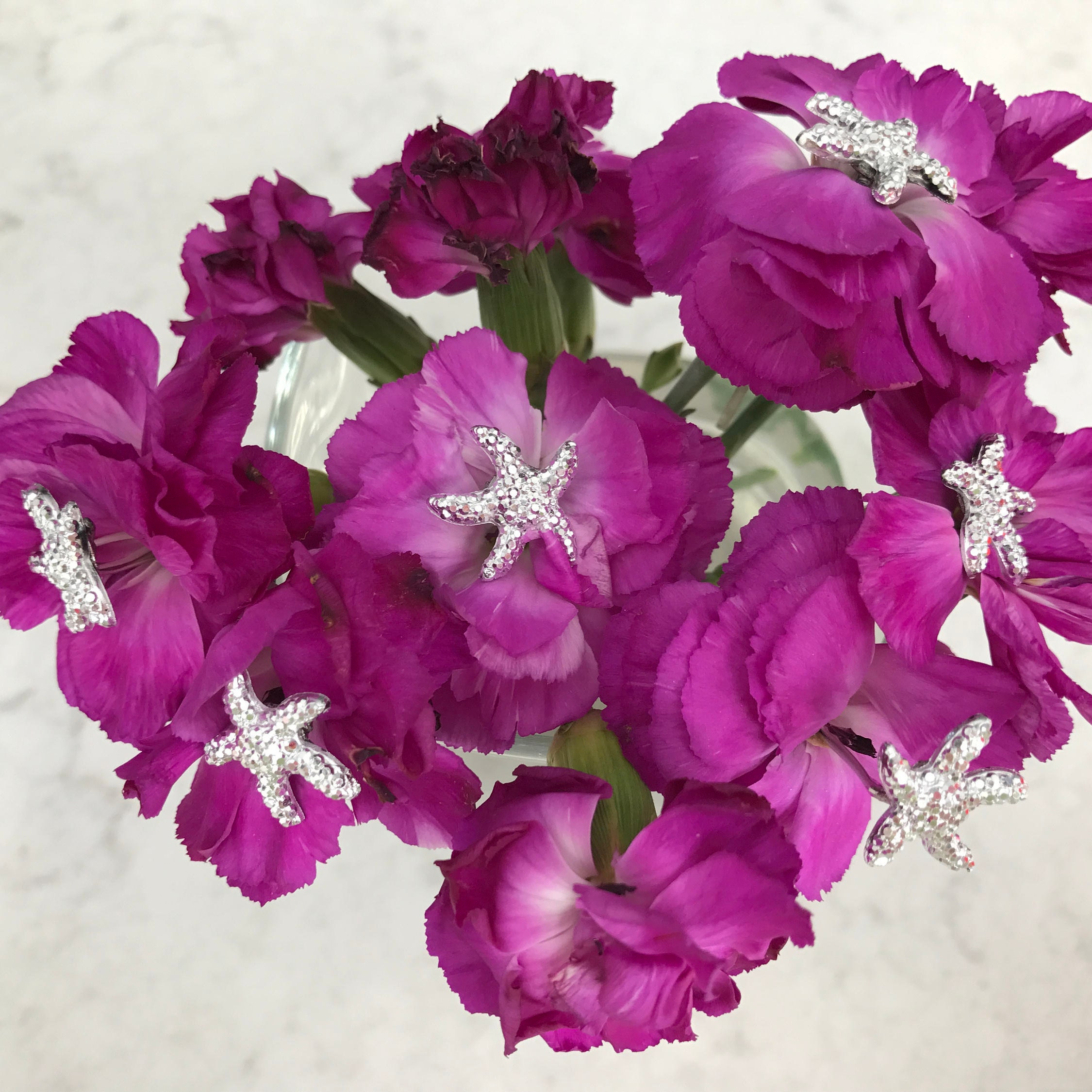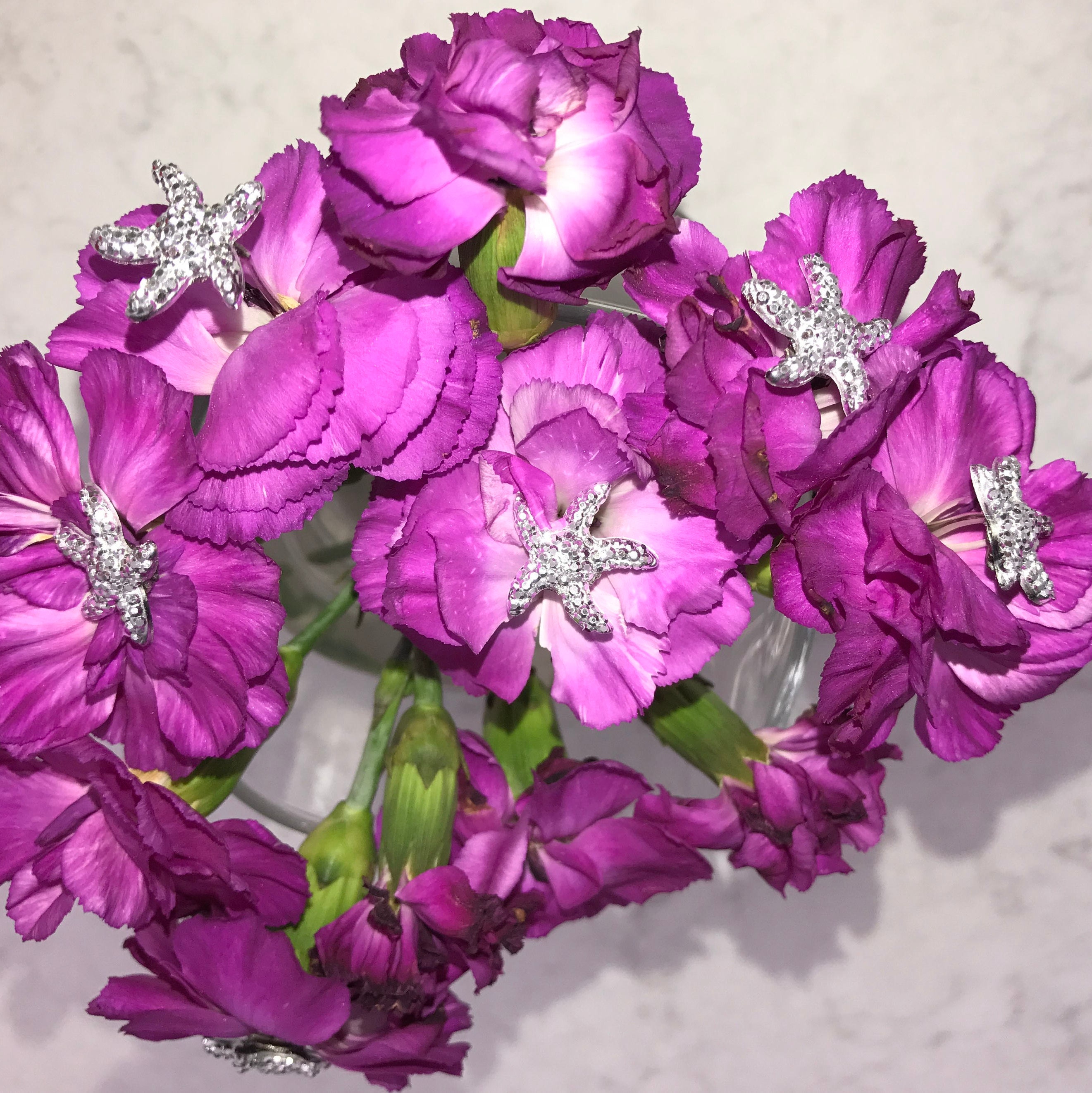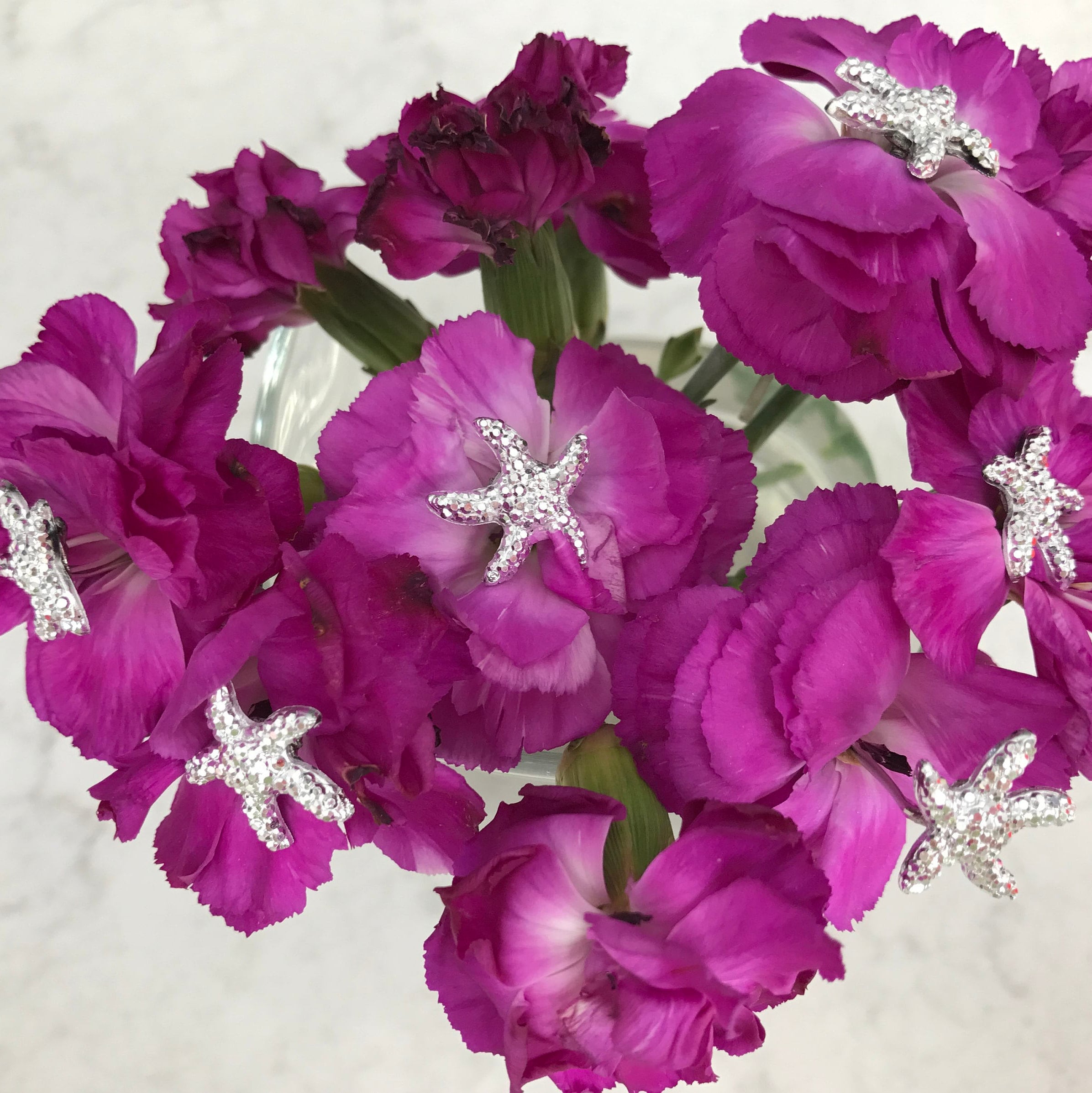 Pictured in this beautiful bouquet of flowers are silver starfish flower pins that I started making in May of 2017.