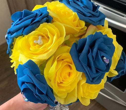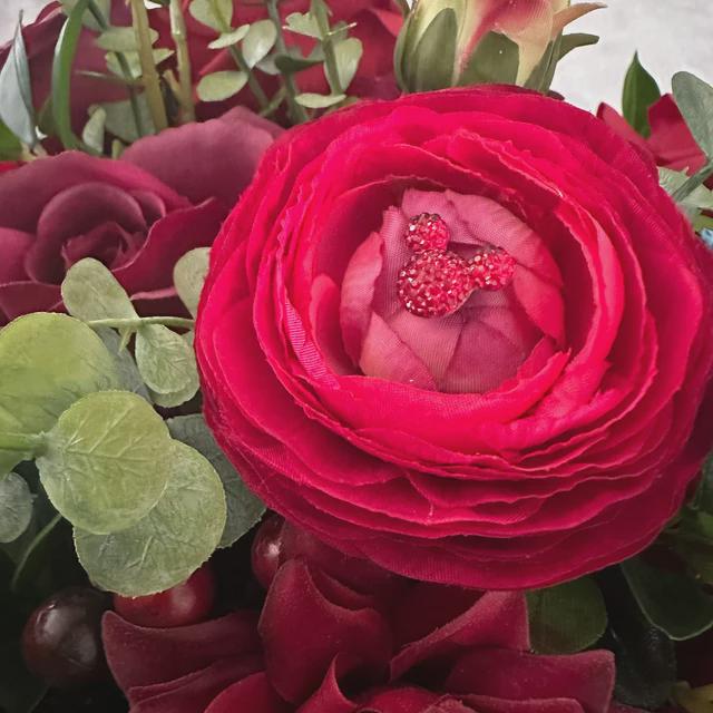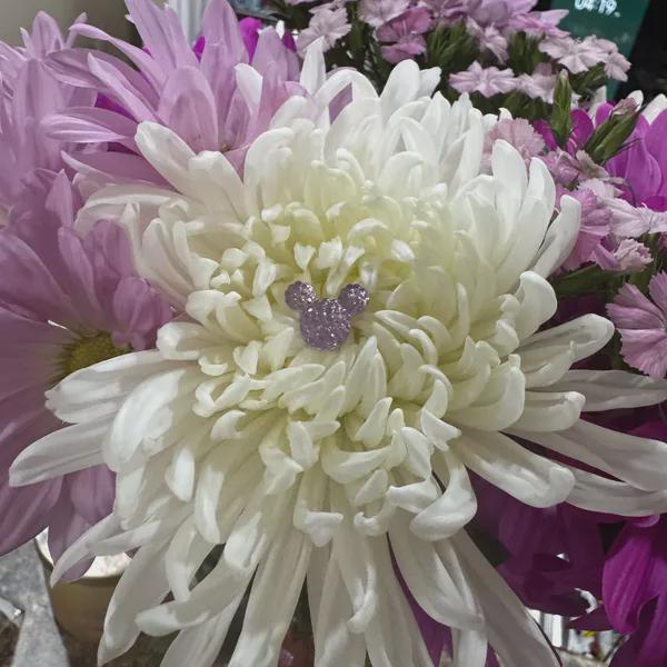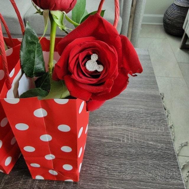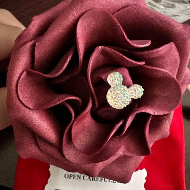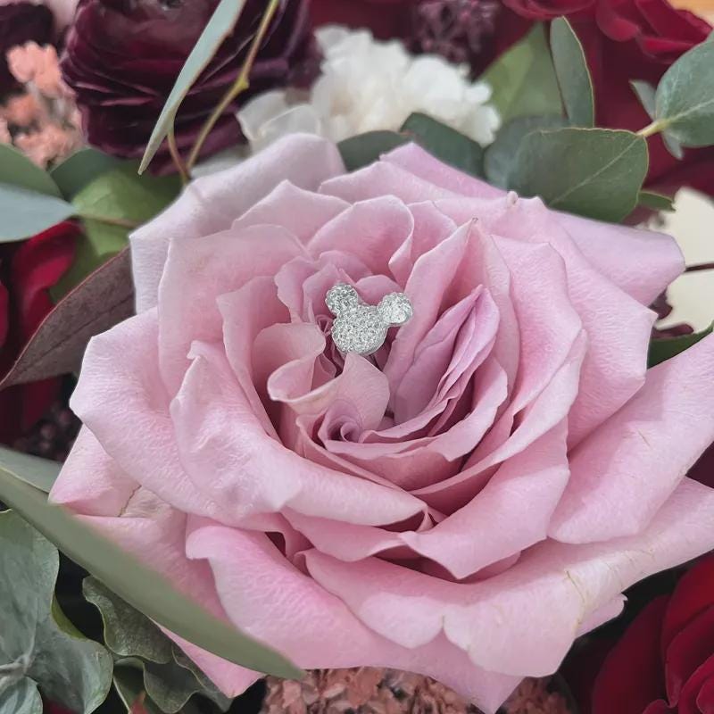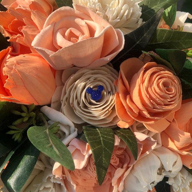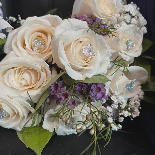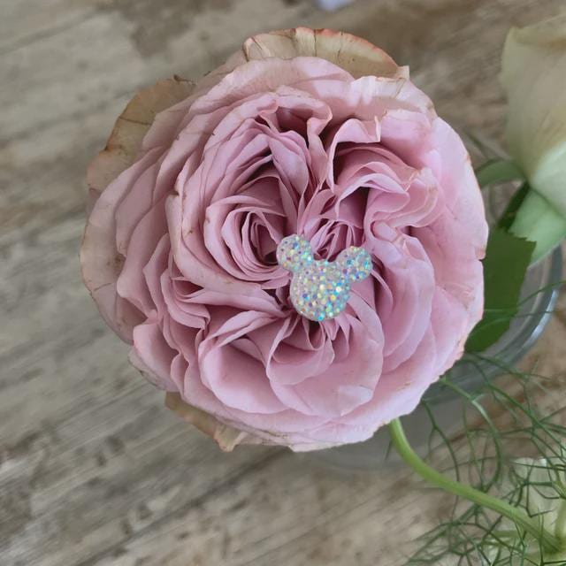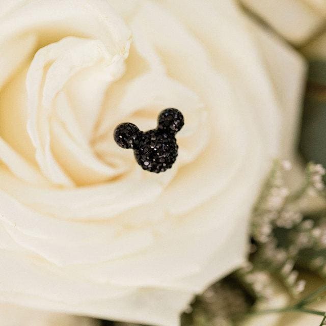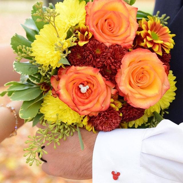Fabulous Mouse Flower Pins Picks for your themed wedding bouquets. These pictures are all from some of my wonderful 10,000 customers. As you can see they can be used in fresh flowers, sola wood flowers or paper flowers. Whatever your choice they add that magical Disney touch to your wedding or event. They have been used at a 40th birthday party. The light blue prom corsage adorns the mouse as well. Mickey looks great on the handle of a bouquet. A perfect touch to your reception centerpieces. Added to a flower in a favor bag. They come in 20 colors. You may choose your favorite from the drop down menu. But as you can see in the pictures that Clear AB is the most popular color. It is clear with a rainbow finish. It matches everything and picks up colors that are around it. These mickey mouse flower pins can be used in a wedding reception, a baby shower, an engagement party, a birthday celebration, an anniversary soiree or a Disney party! Use them for your special event. If you check out the rest of my shop you will find matching hair swirls, hair pins, tiaras, combs,necklaces and earrings, cuff links and tie tacks. They come in pearl styles as well.