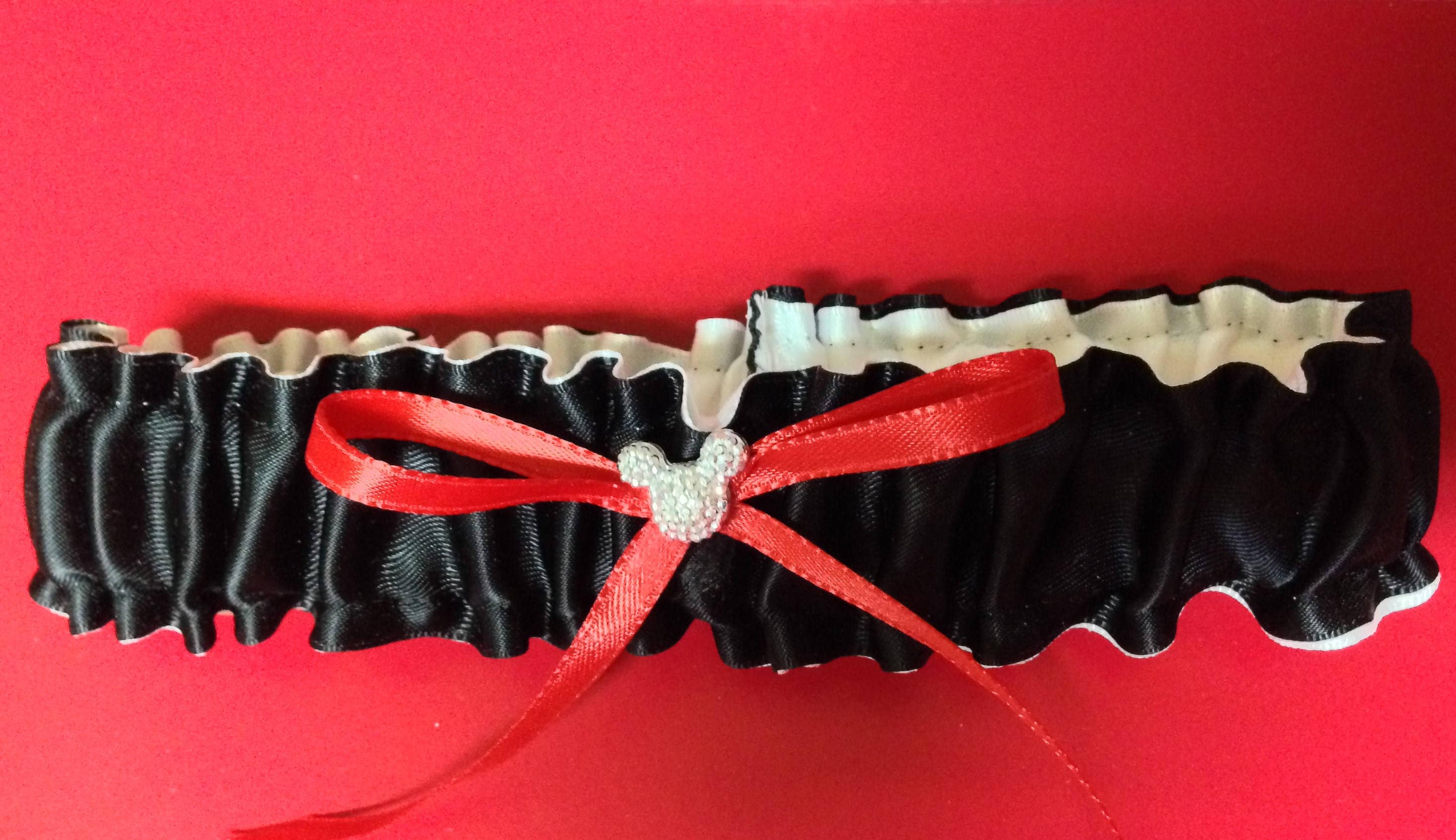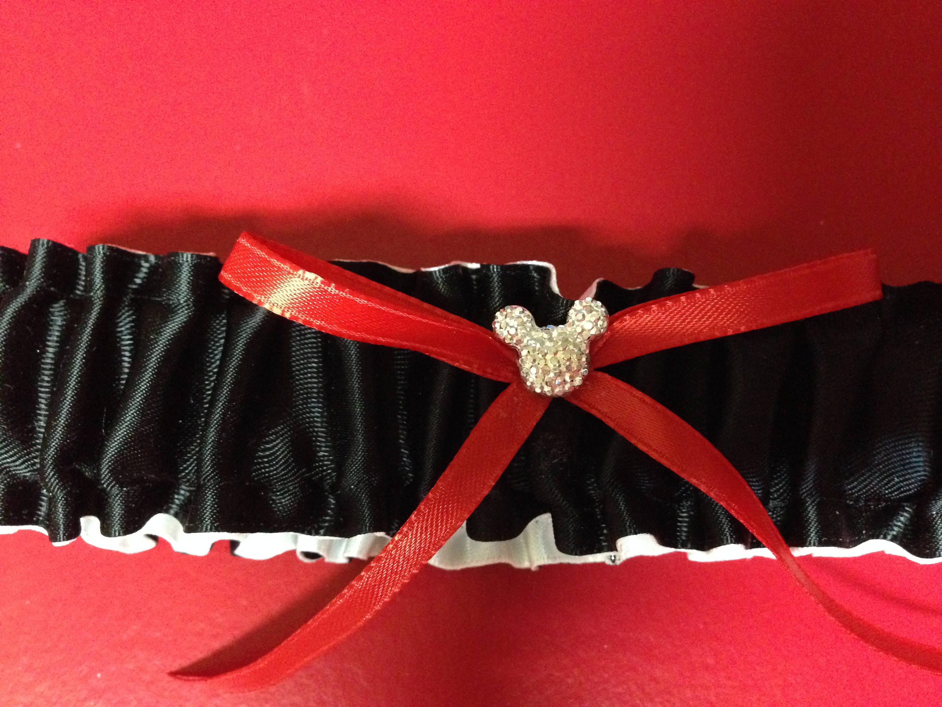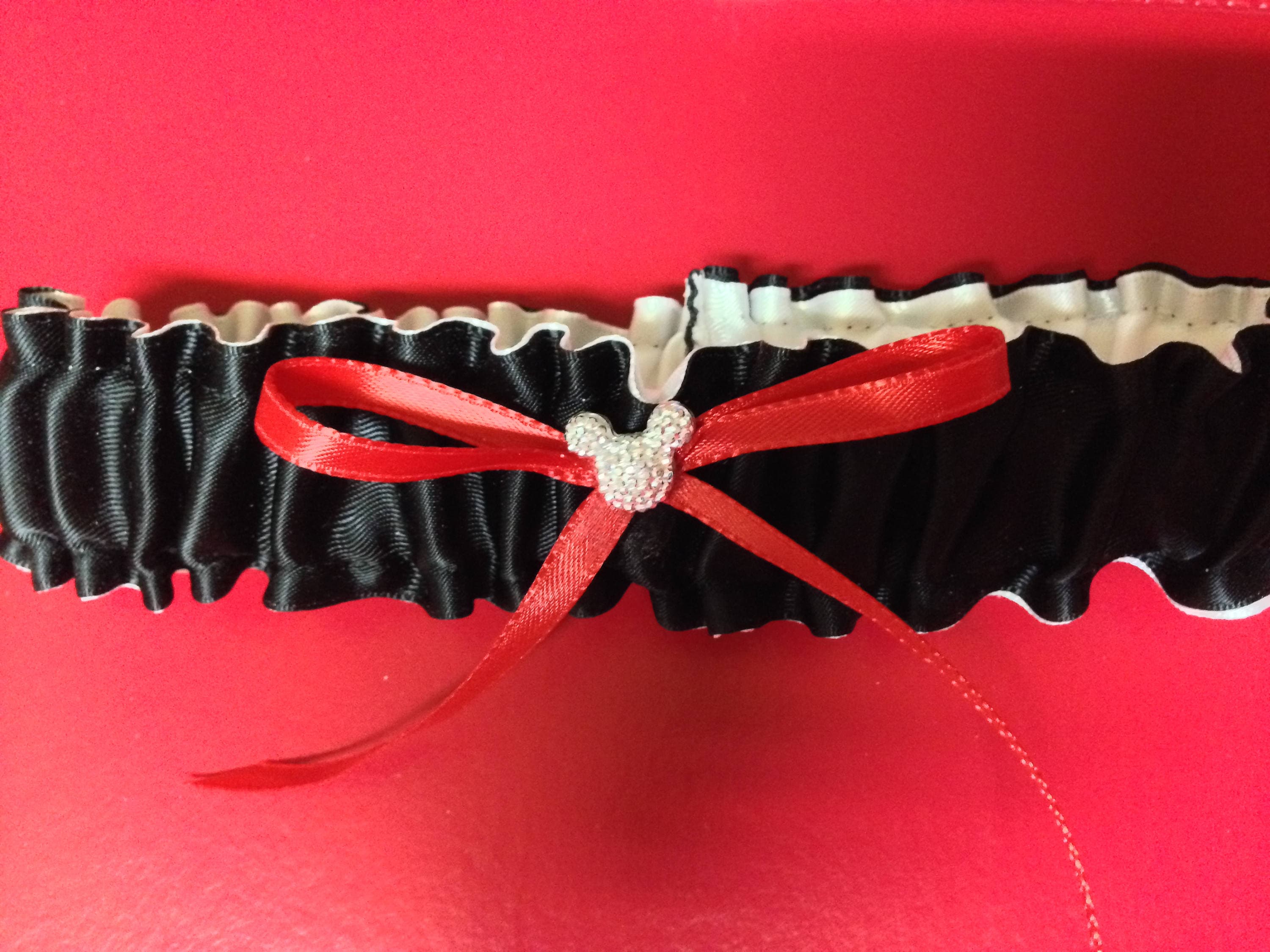 This one is designed with a solid black poly - satin garter and a pretty red bow. The bow is embellished with a shining silver tone mouse ears resin rhinestone. The mouse is 1/2 inch from ear to tiny ear. The black garter has a white lining.