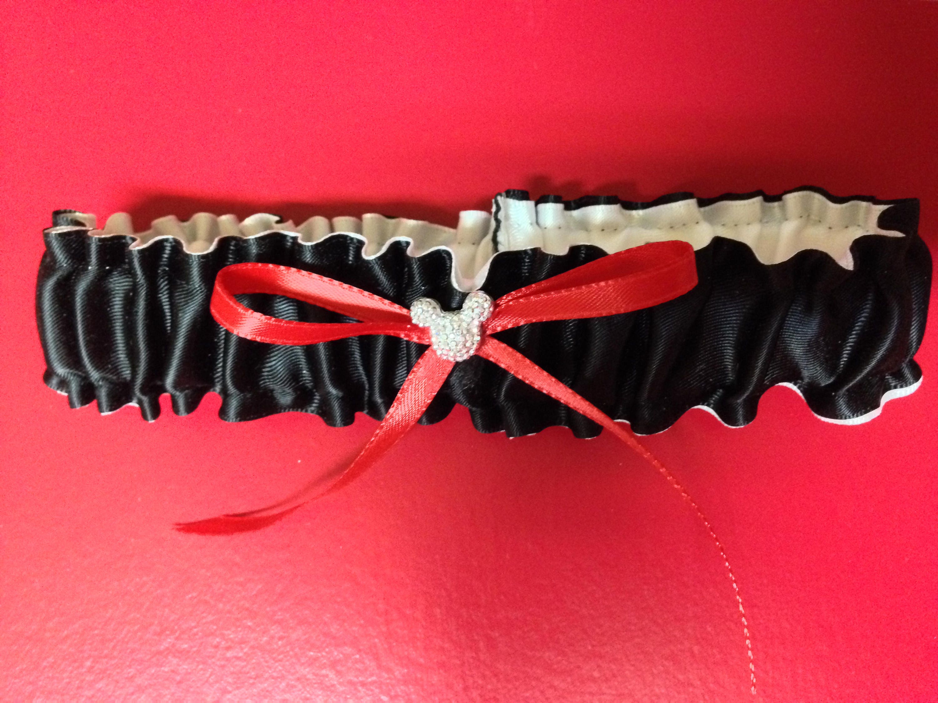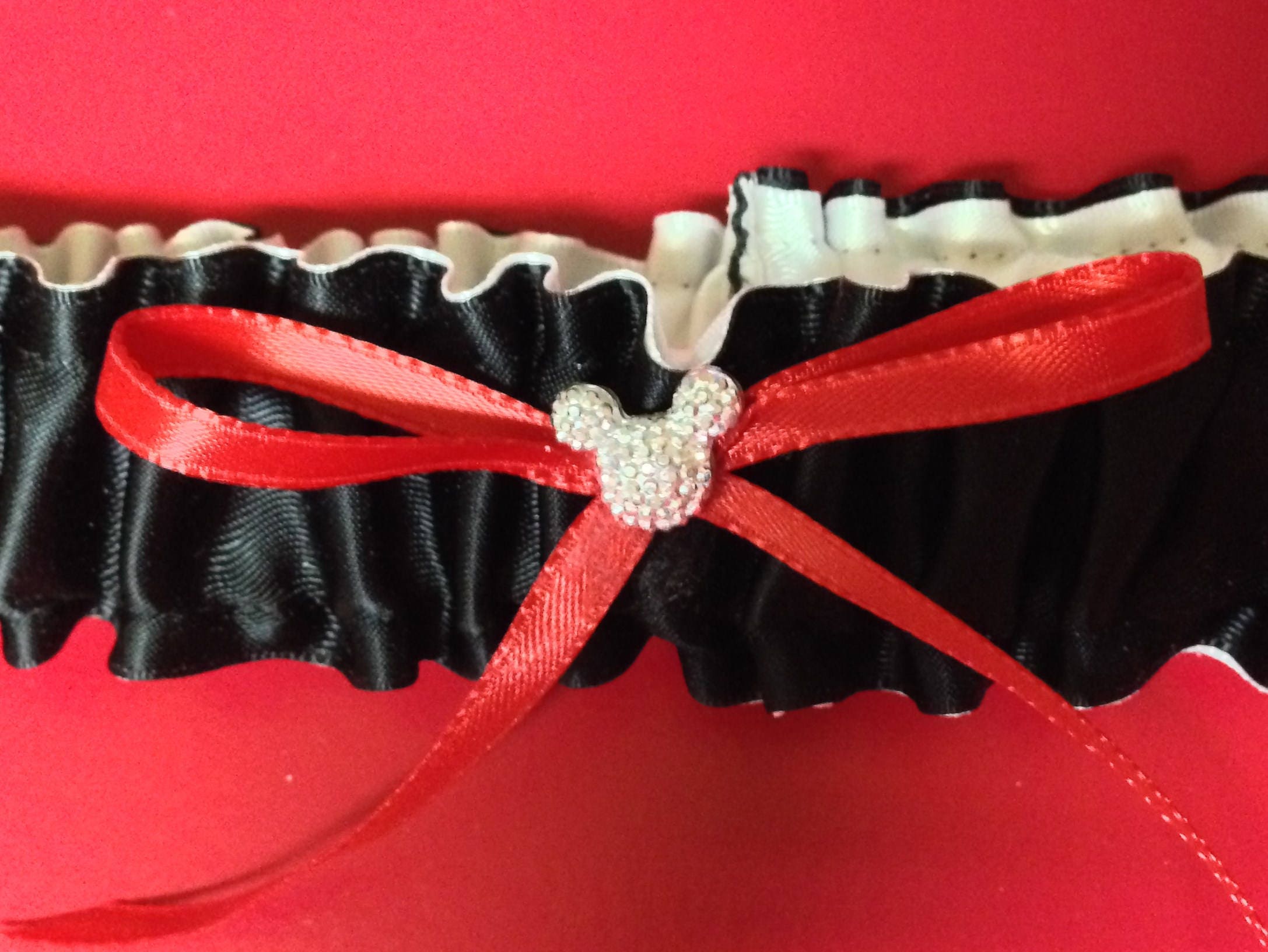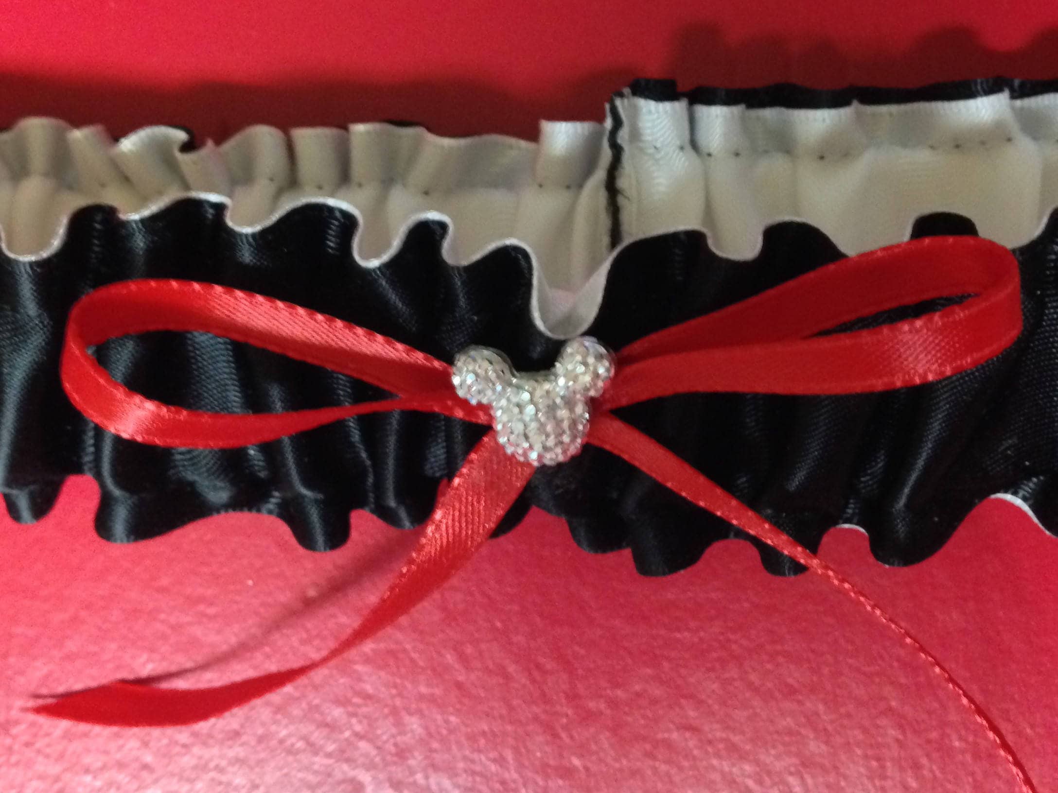 This one is designed with a solid black poly - satin garter and a pretty red bow. The bow is embellished with a shining silver tone mouse ears resin rhinestone. The mouse is 1/2 inch from ear to tiny ear. The black garter has a white lining.