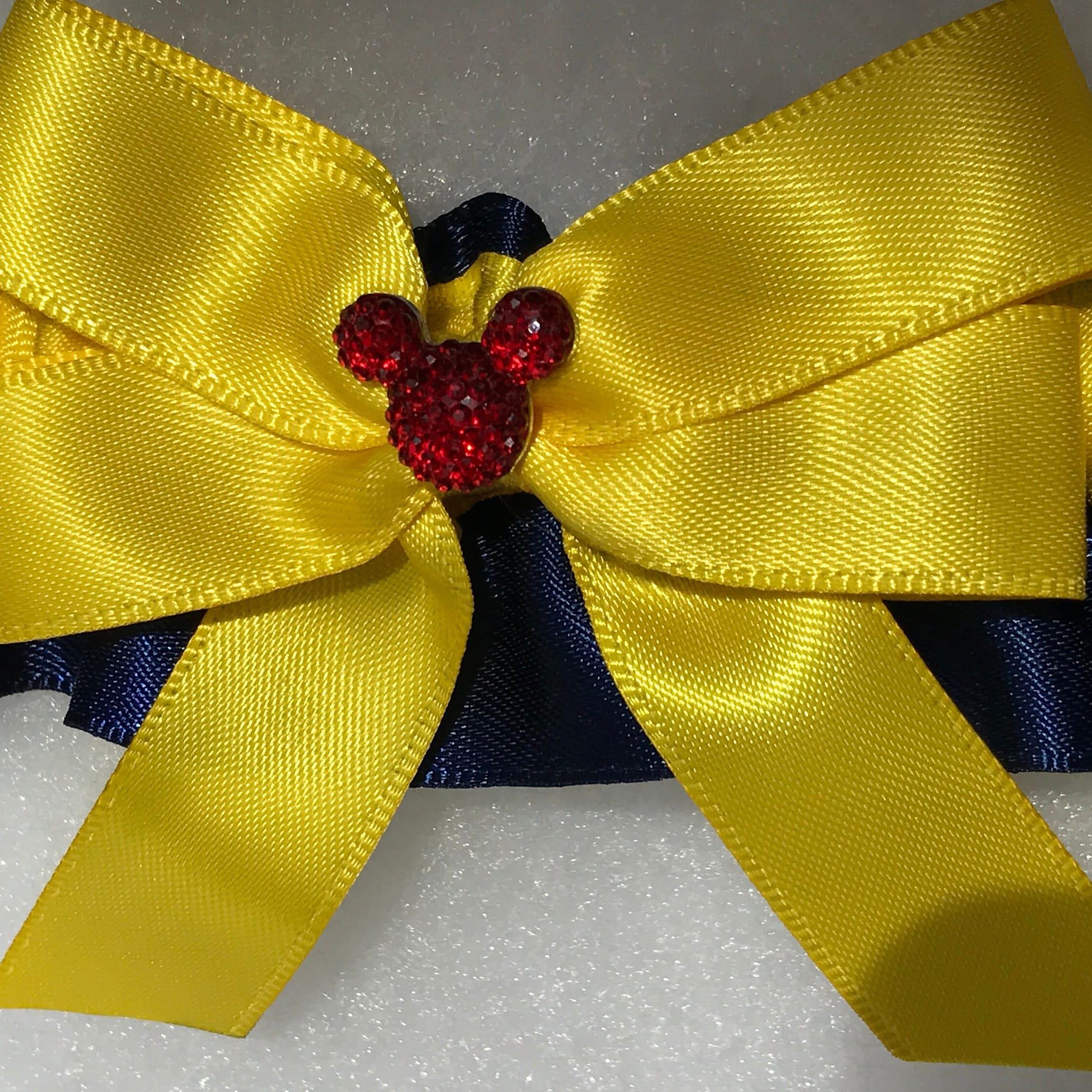 Navy blue and yellow with a bright double yellow bow. The yellow bow is embellished with a tiny bright red mickey mouse silhouette head.