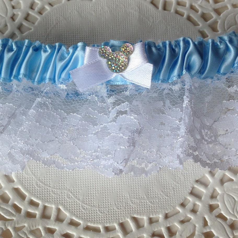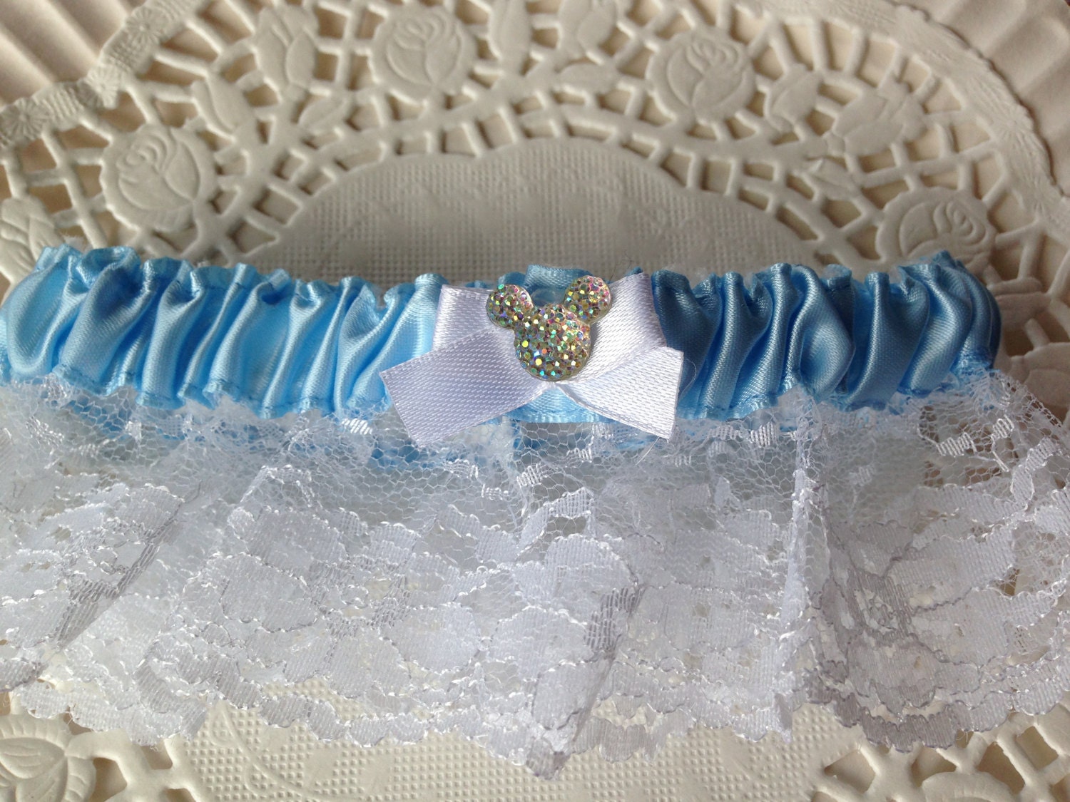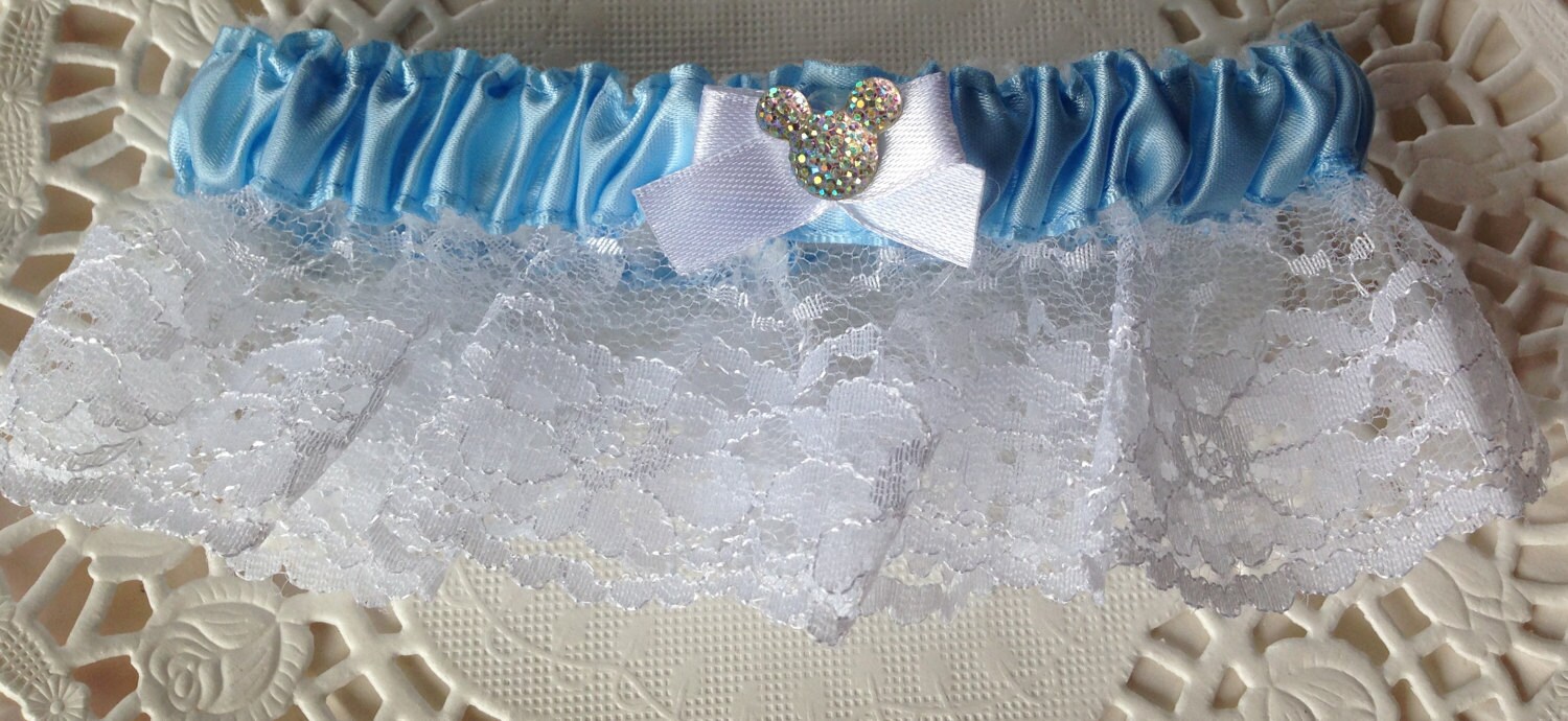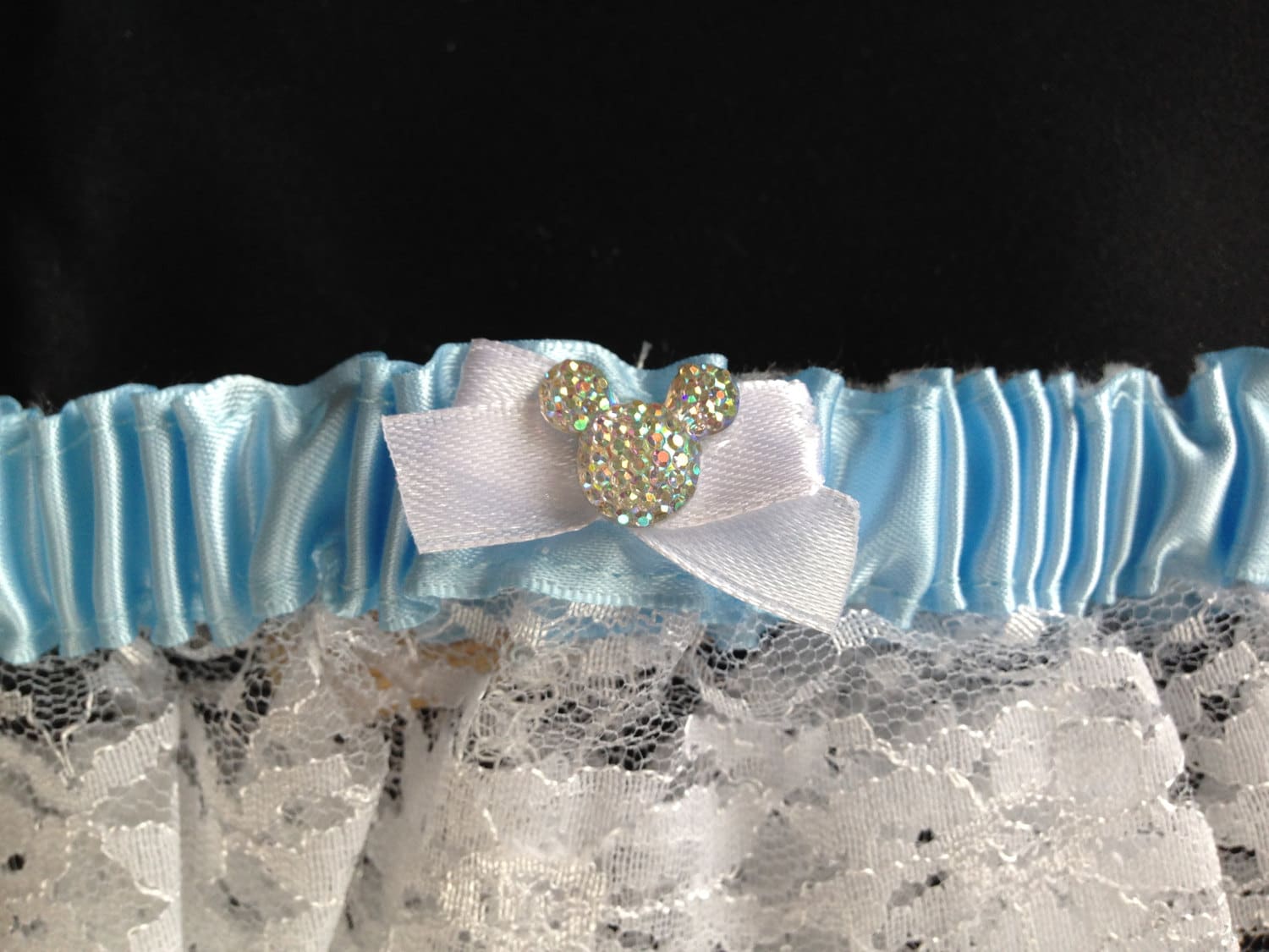 This is a white lace garter designed with a light blue poly - satin ribbon running above the lace. The garter is enhanced with a tiny white bow. The bow is embellished with one tiny clear ab mouse ears rhinestone. The mouse is 1/2 inch from ear to tiny ear.