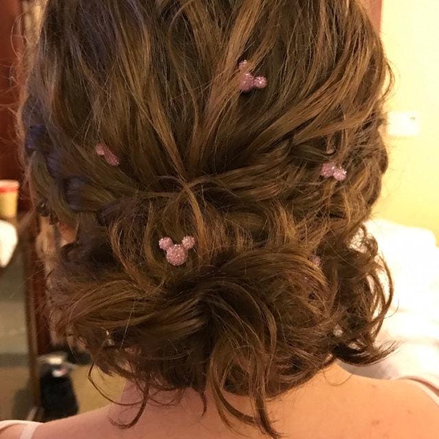 Mouse ears hair swirls would be perfect for a Bride or Bridesmaids in a Disney wedding. The Bride in the picture is wearing one tiny mouse ear right above her tiara on the left hand side. Just an idea as to how to wear one. The rest could be worn by the bridesmaids. They will stay in while you are dancing the night away at your reception.