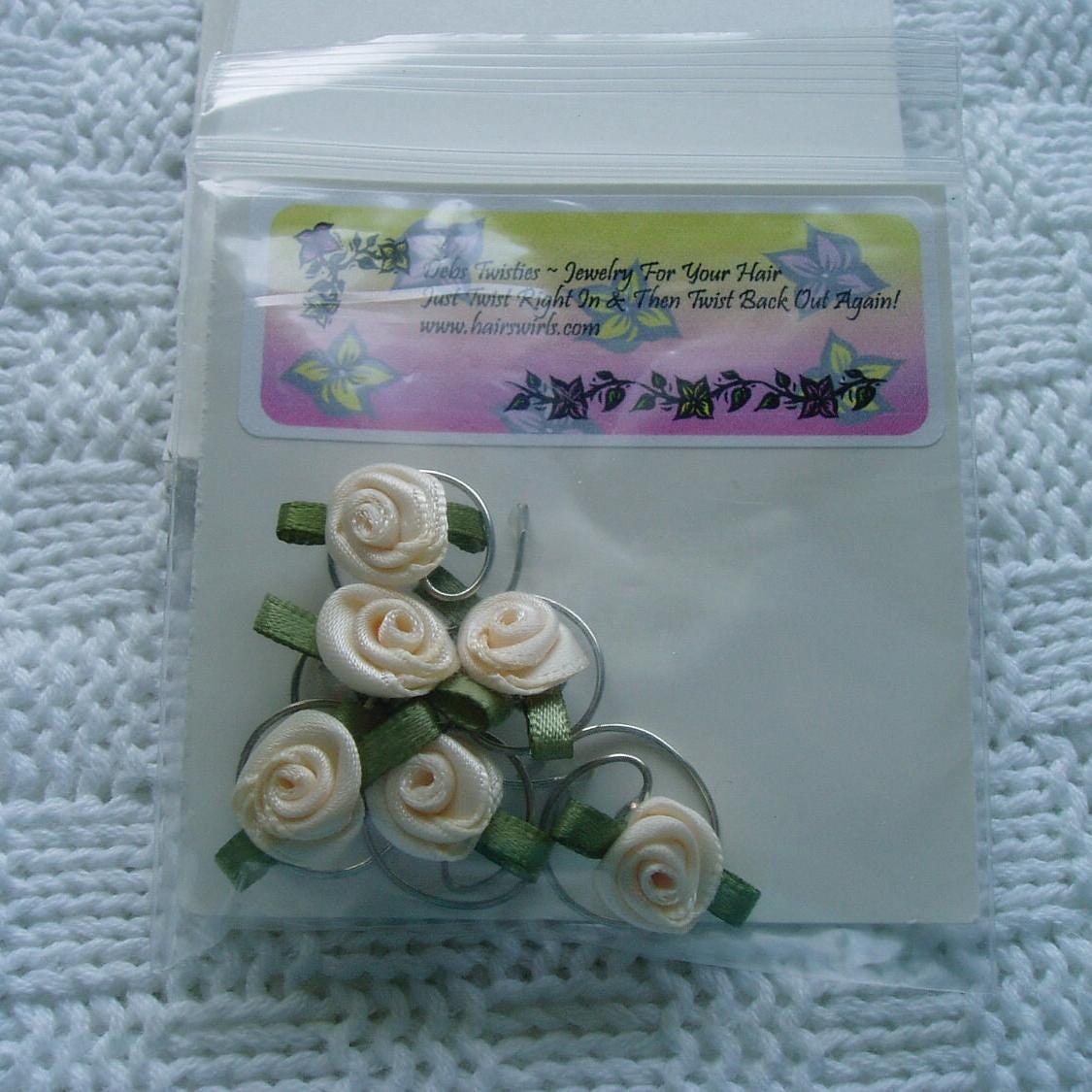 You are buying a beautiful set of 6 Cream Rose Hair Swirls. Each rose is about 1/2 inch in size. They are tiny and adorable. They would be perfect for the prom or a bridal party.